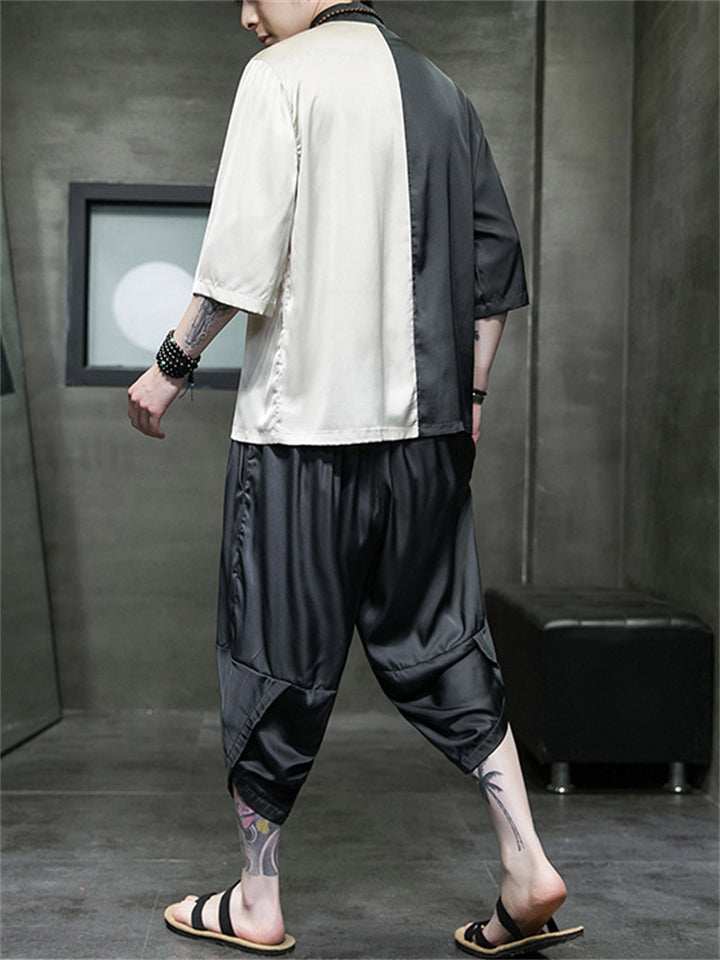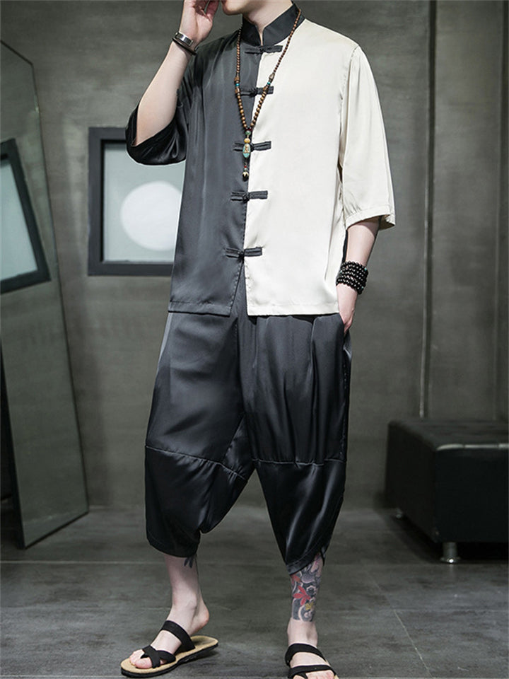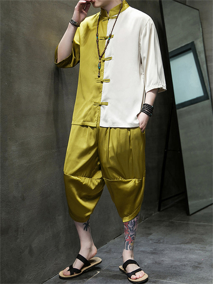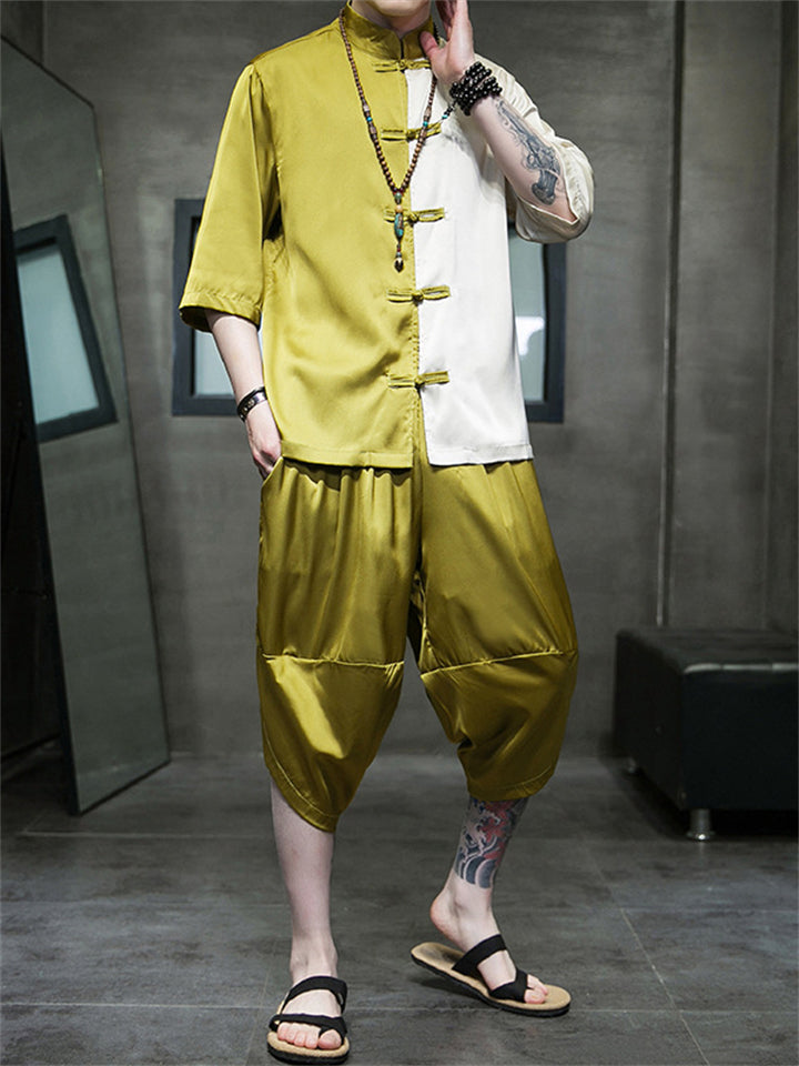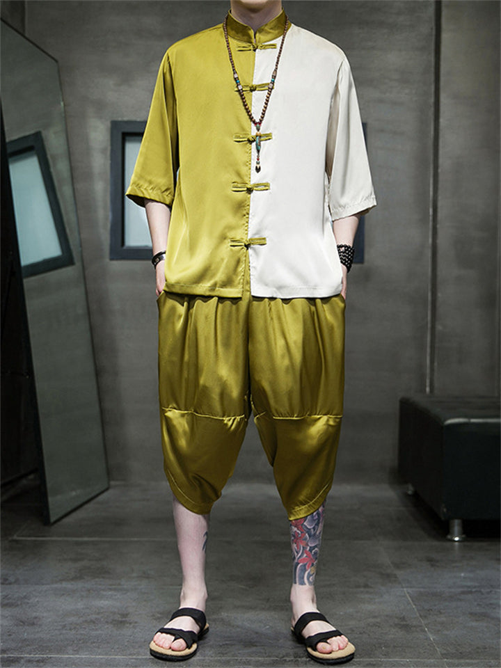 Male Color-blocked Shirt + Cropped Pants Silky Suits