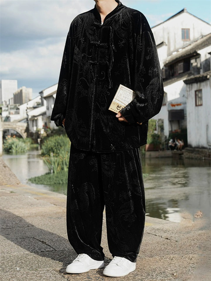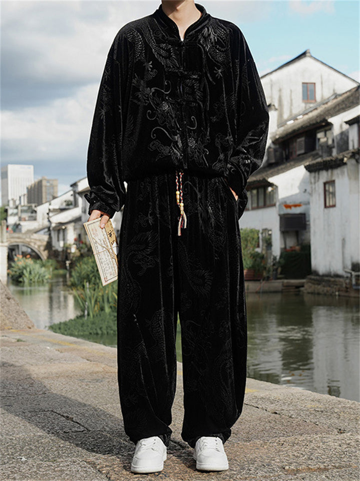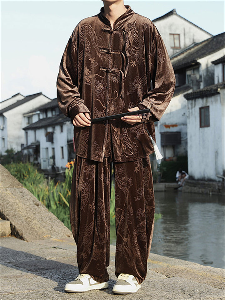 Men's 2Pcs Autumn Chinese Loong Printed Velvet Frog Button Long Sleeve Outfits