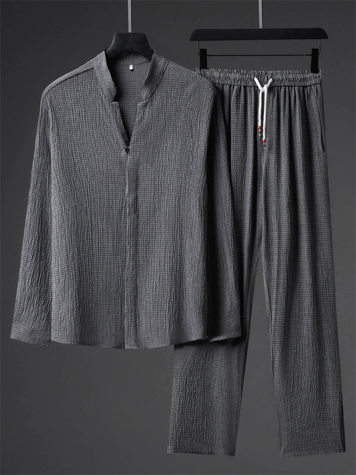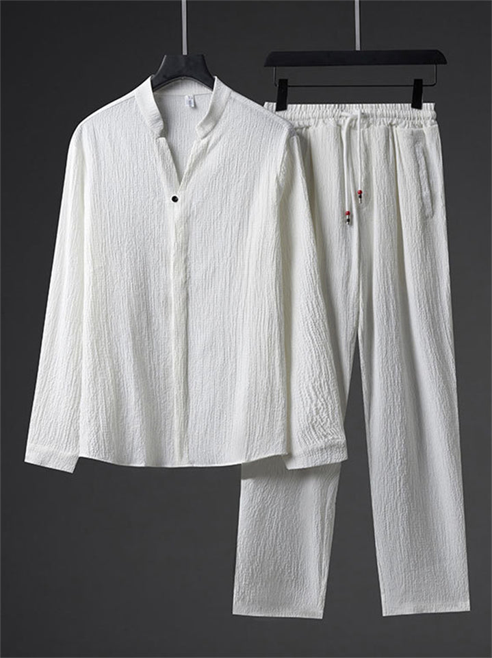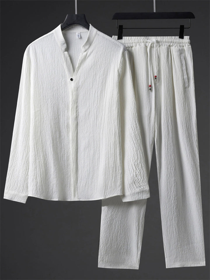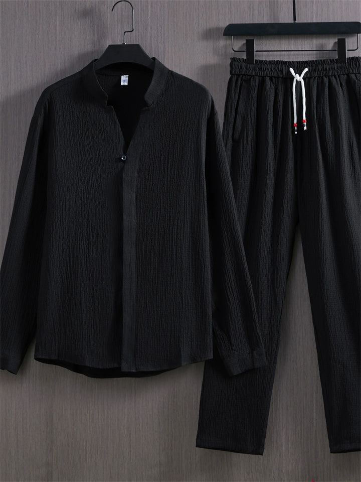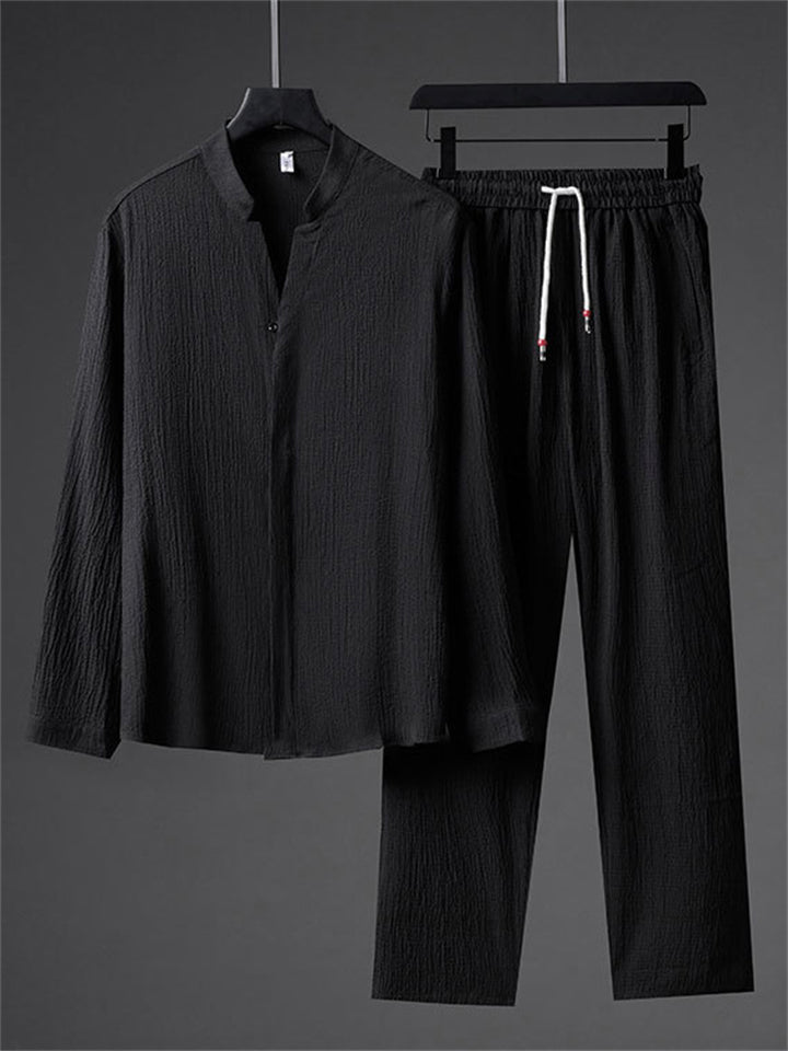 Men's 2Pcs Cool Zen Style Stand Collar Half Sleeve Solid Color Outfits