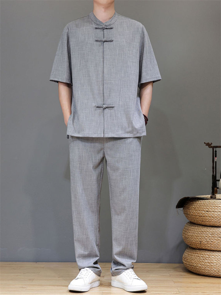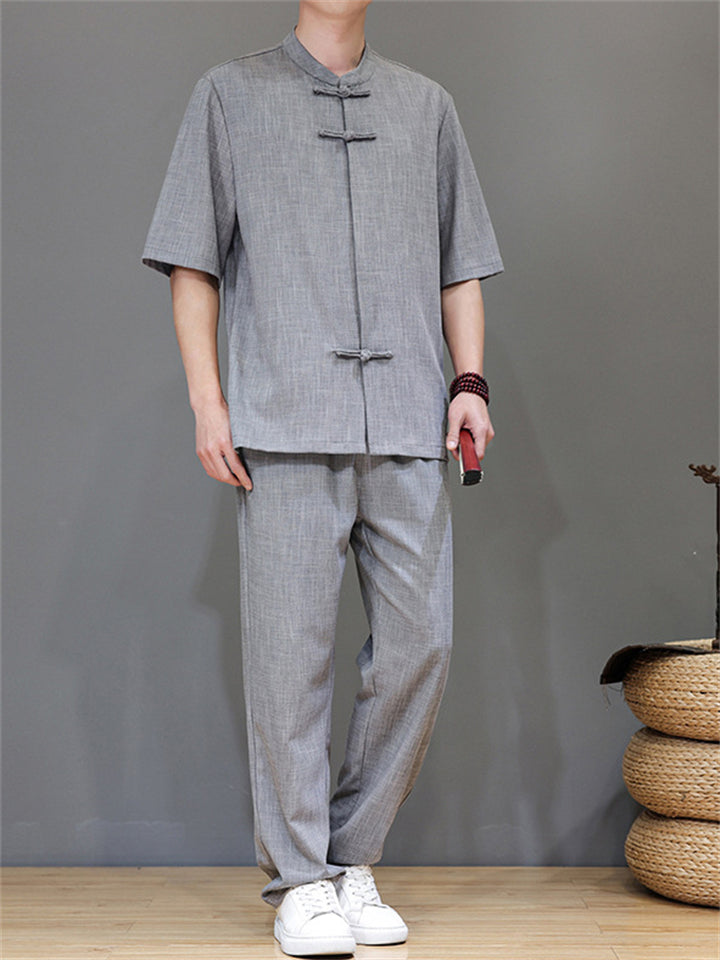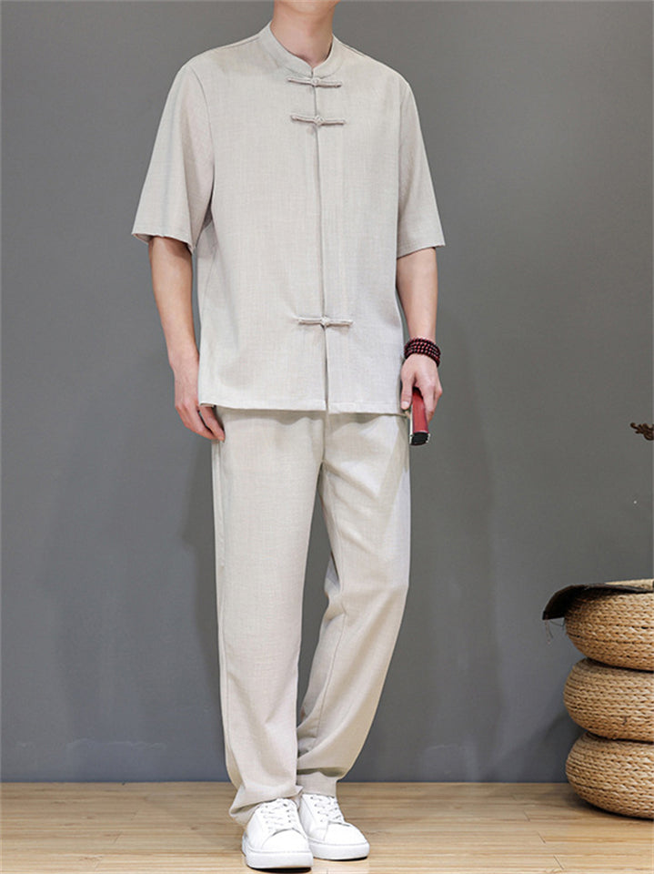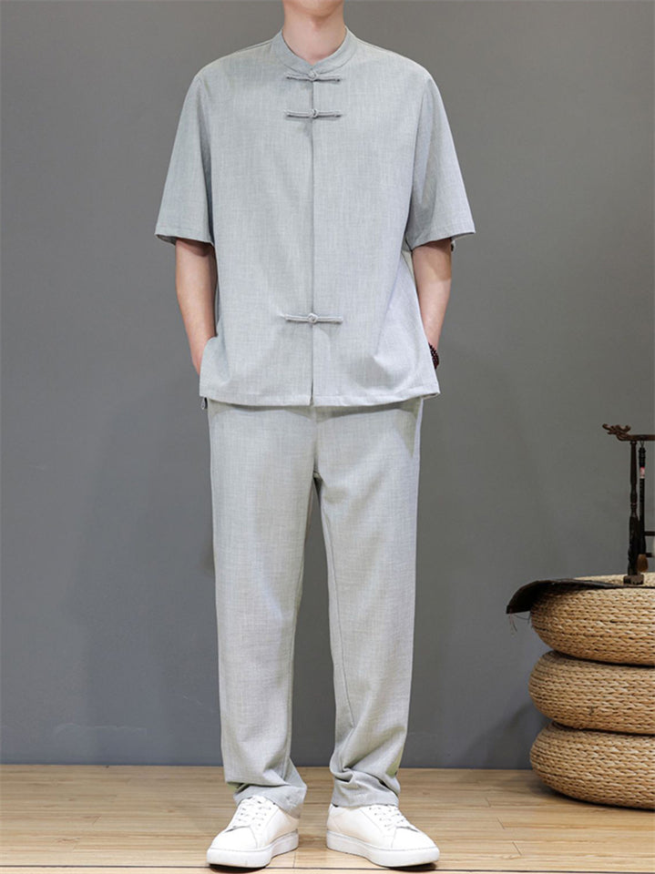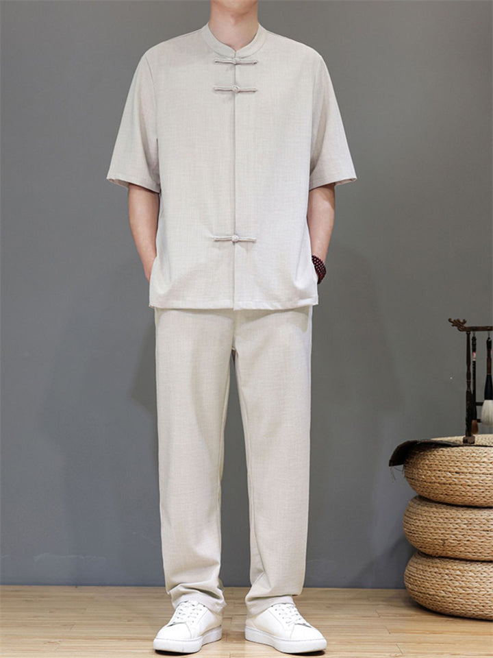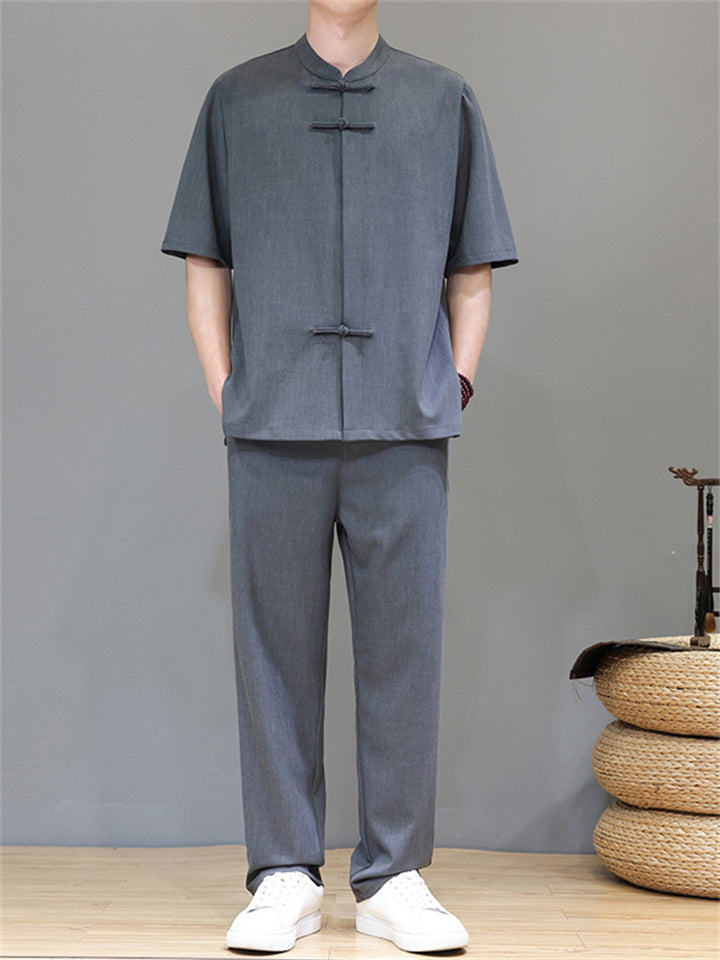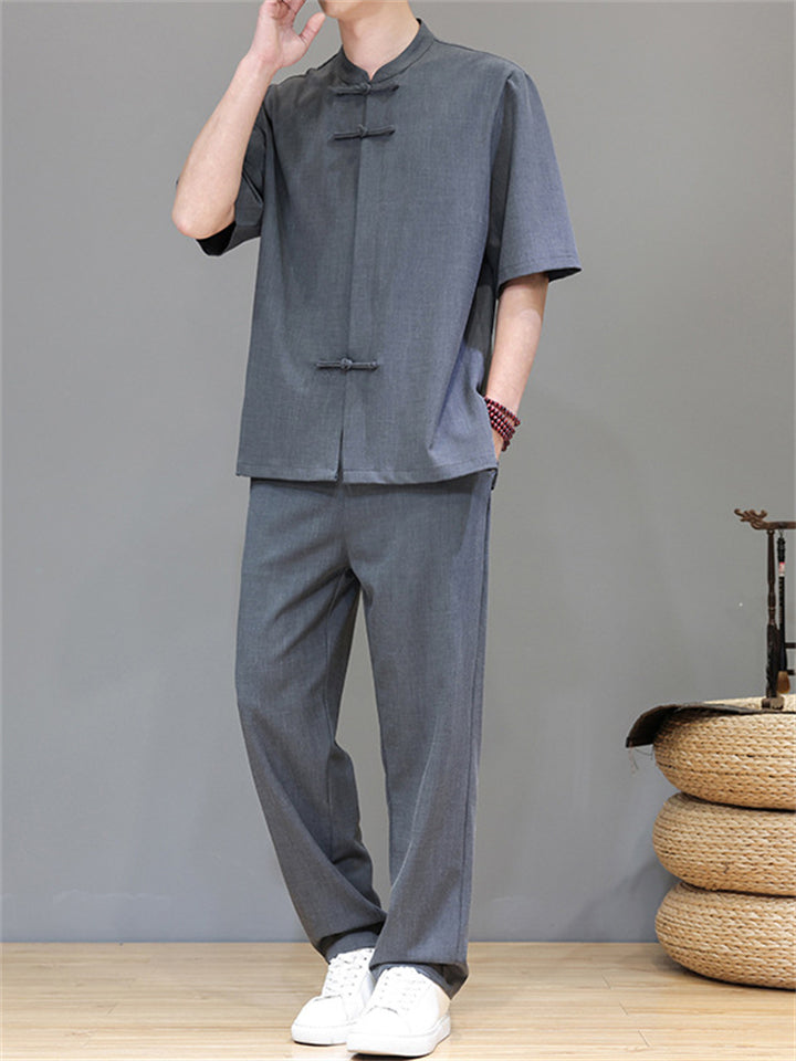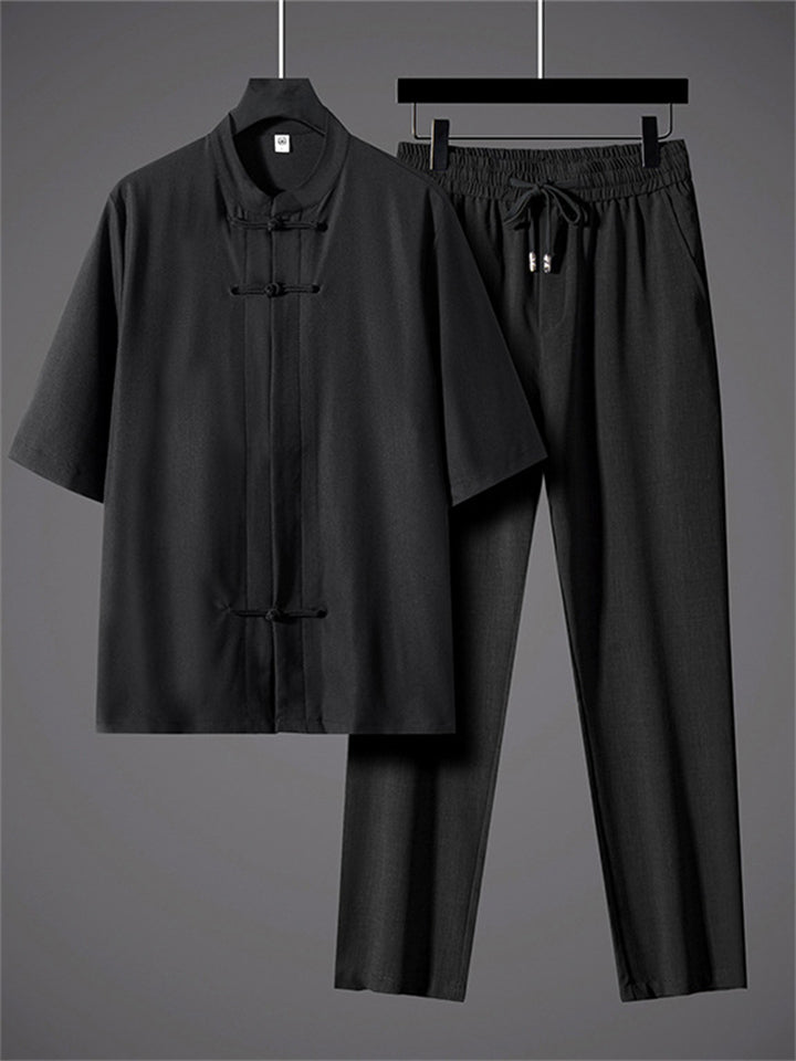 Men's 2Pcs Cool Zen Style Stand Collar Half Sleeve Solid Color Outfits