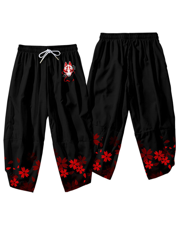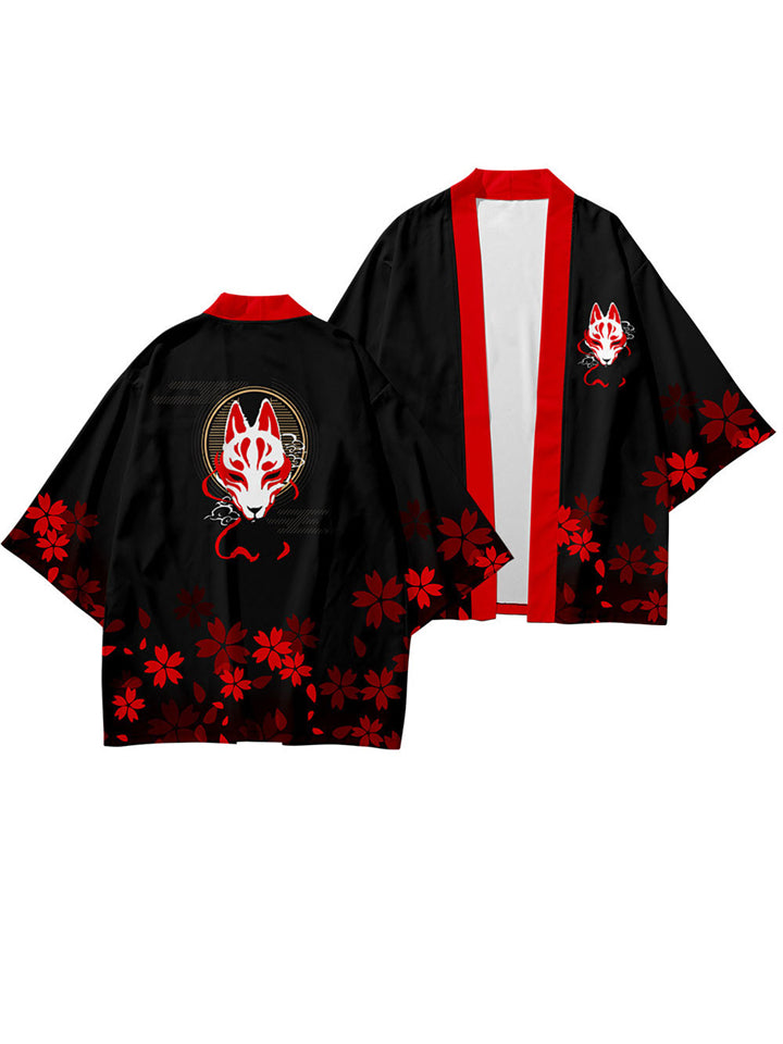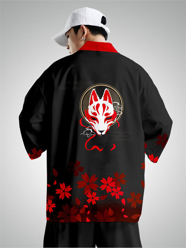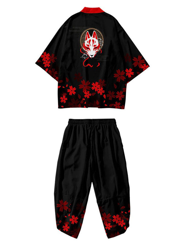 Men's Anime Red Fox Sakura Print Cardigan Shirt Casual Pants