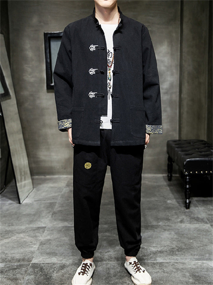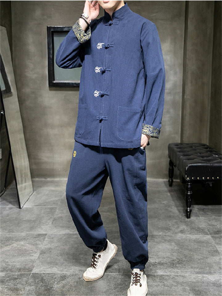 Men's 2Pcs Comfy Autumn Cotton Linen Solid Color TangSuit Outfit