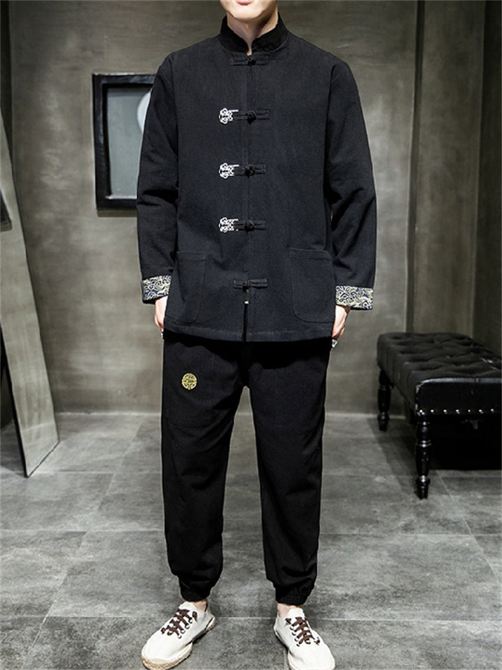 Men's 2Pcs Autumn Cotton Blend Corduroy Frog Button TangSuit Outfit