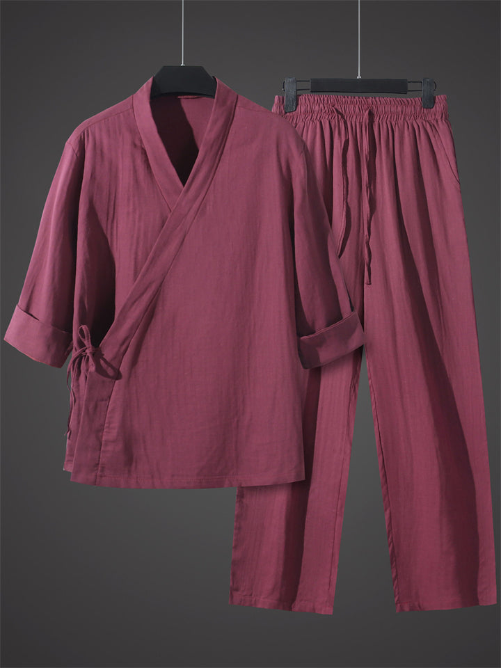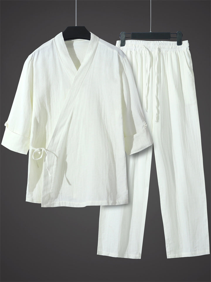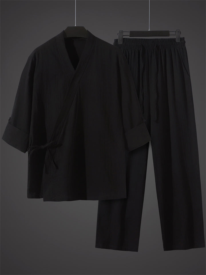 Men's 2Pcs Retro Chinese Style Casual Solid Color 3/4 Sleeve V Neck Outfits