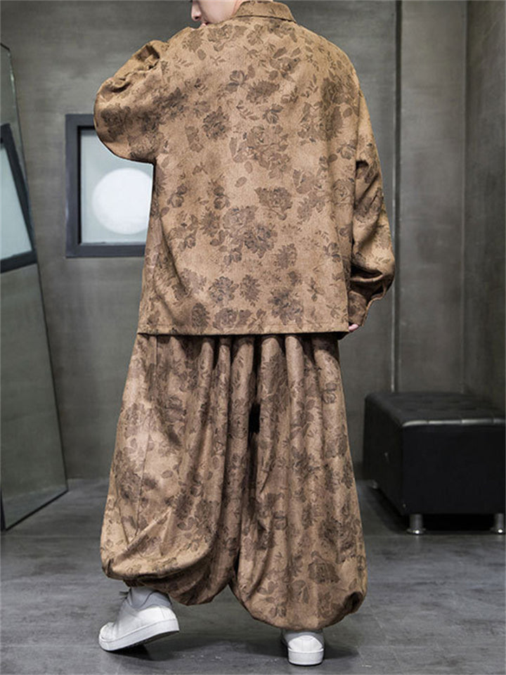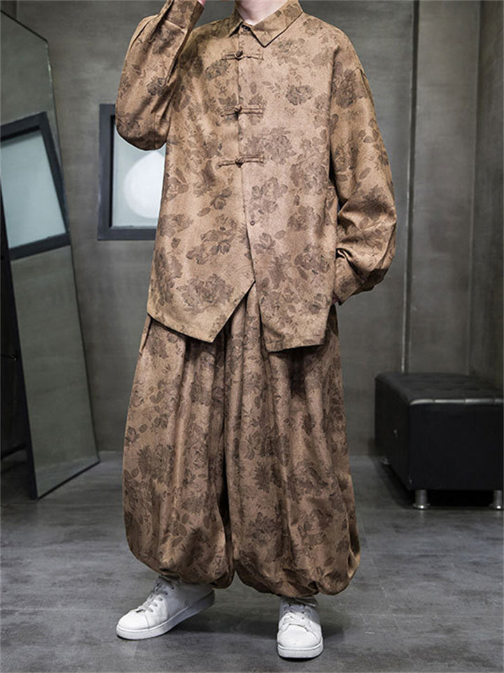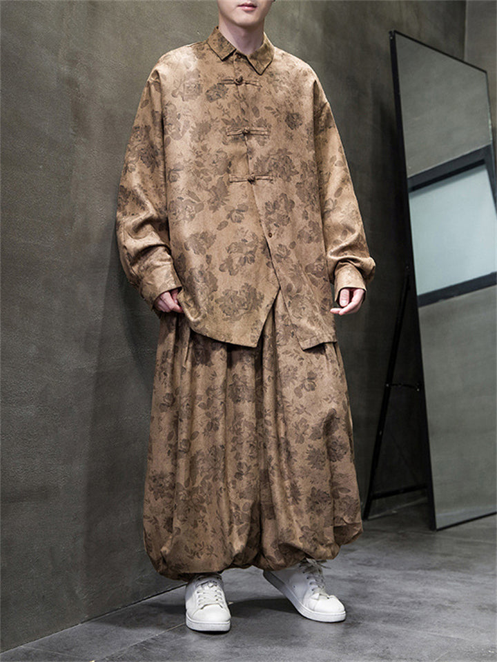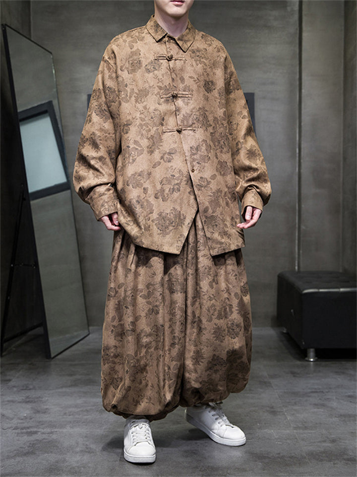 Men's Chinese Outfits Button-up Shirt and Loose Fit Pants