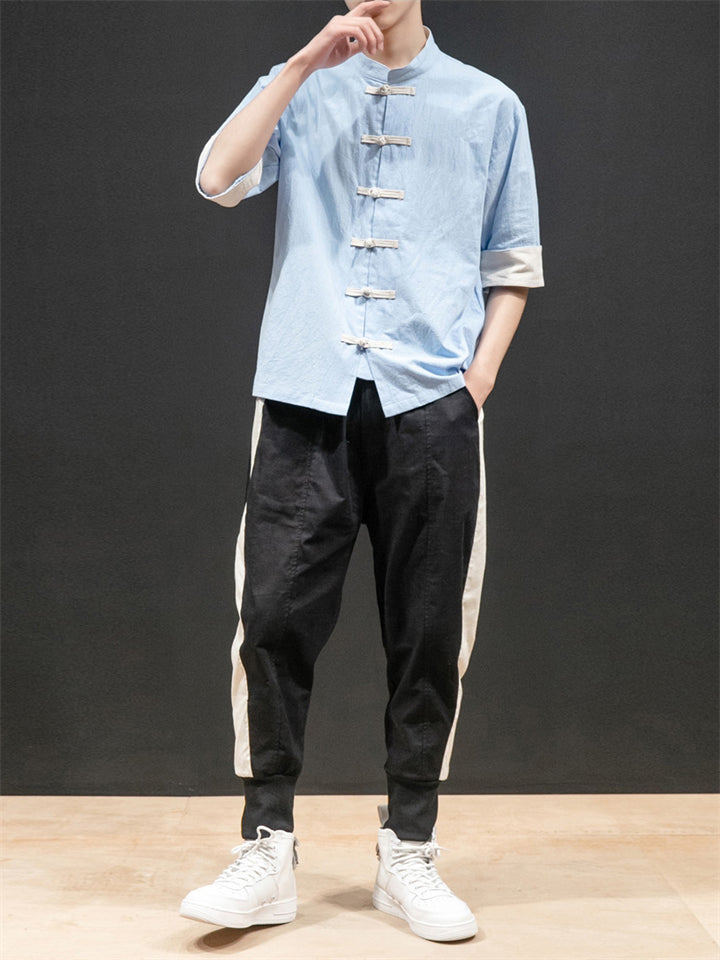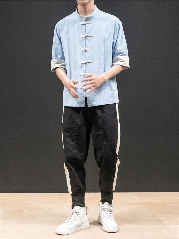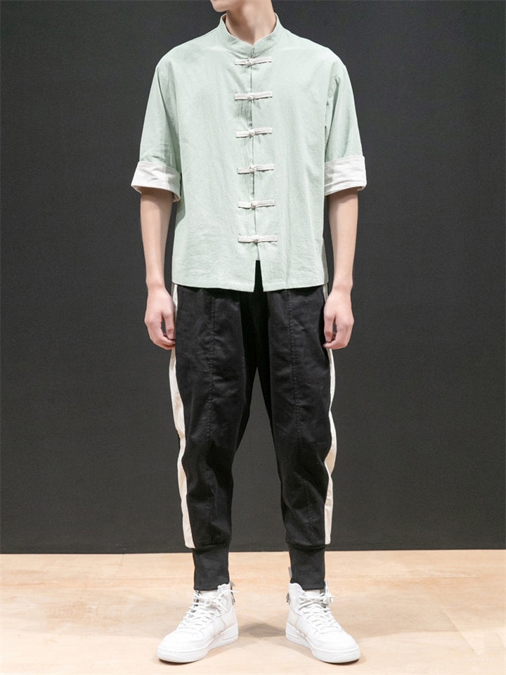 Men's 2Pcs Retro Chinese Style Casual Solid Color 3/4 Sleeve V Neck Outfits