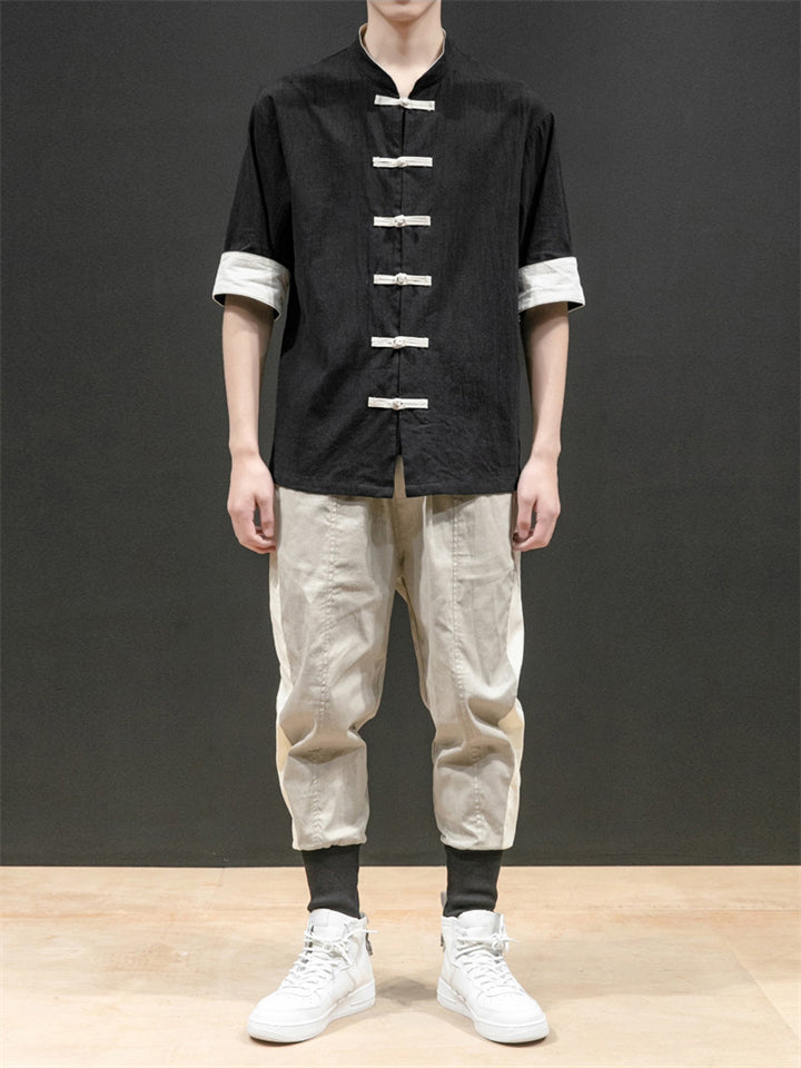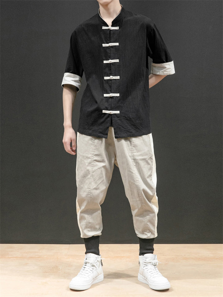 Men's 2Pcs Cool Zen Style Stand Collar Half Sleeve Solid Color Outfits