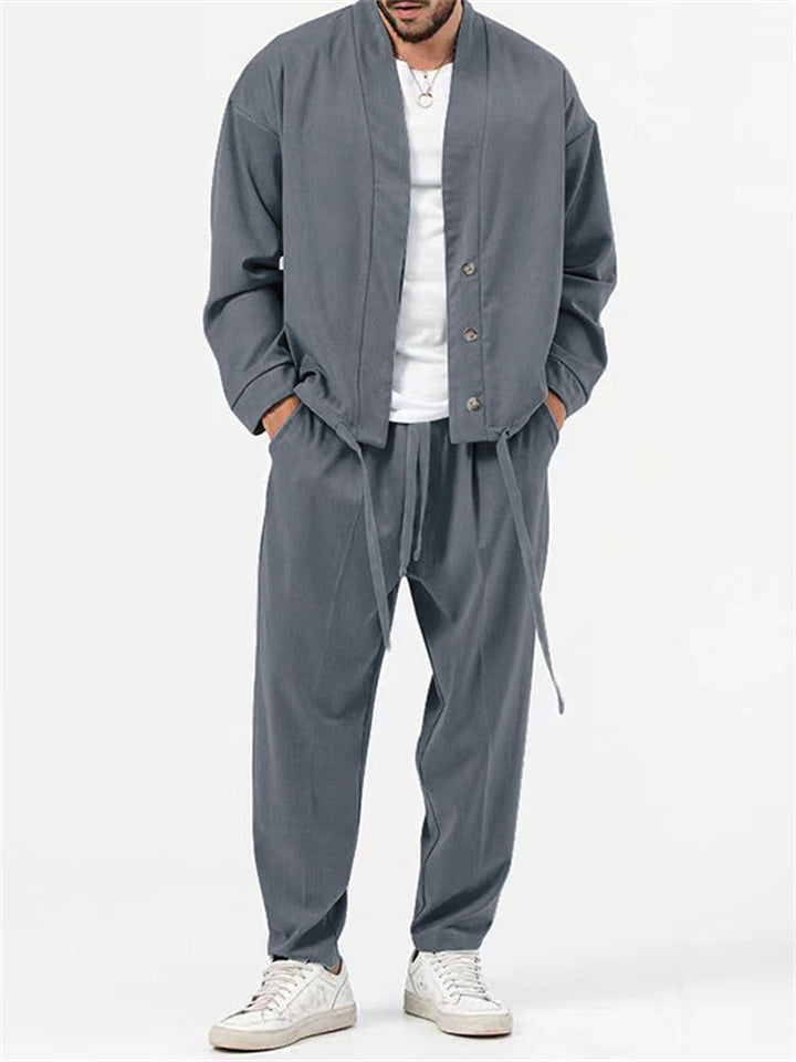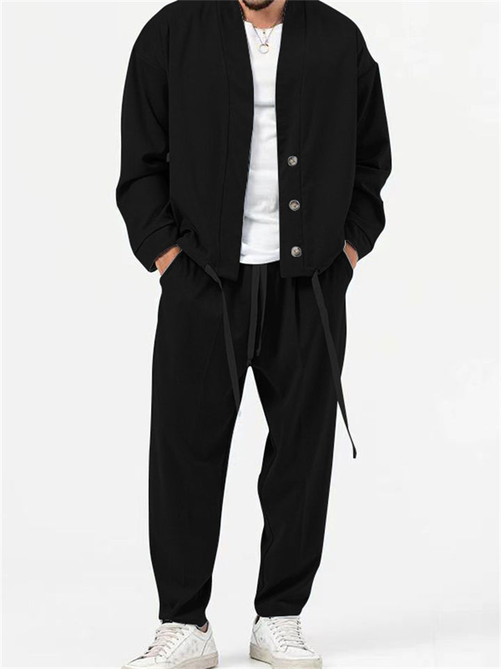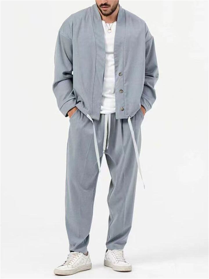 Men's 2Pcs Retro Chinese Style Casual Solid Color 3/4 Sleeve V Neck Outfits