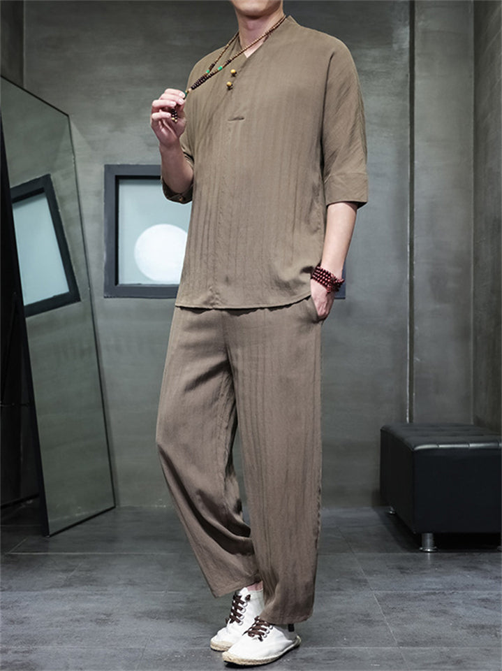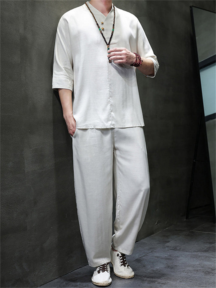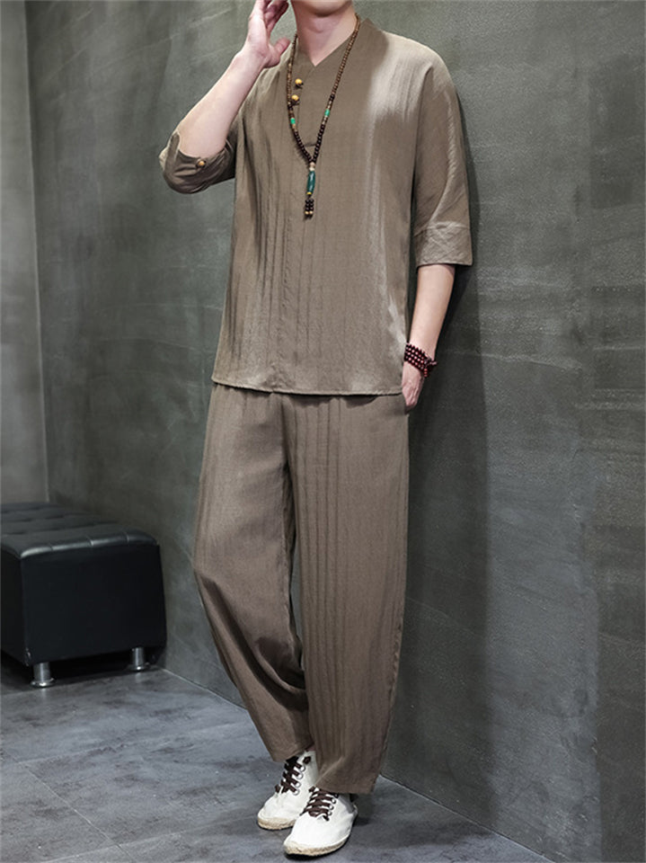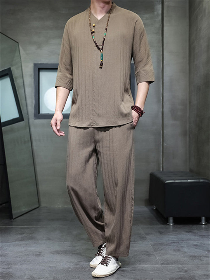 Men's 2Pcs Retro Chinese Style Casual Solid Color 3/4 Sleeve V Neck Outfits