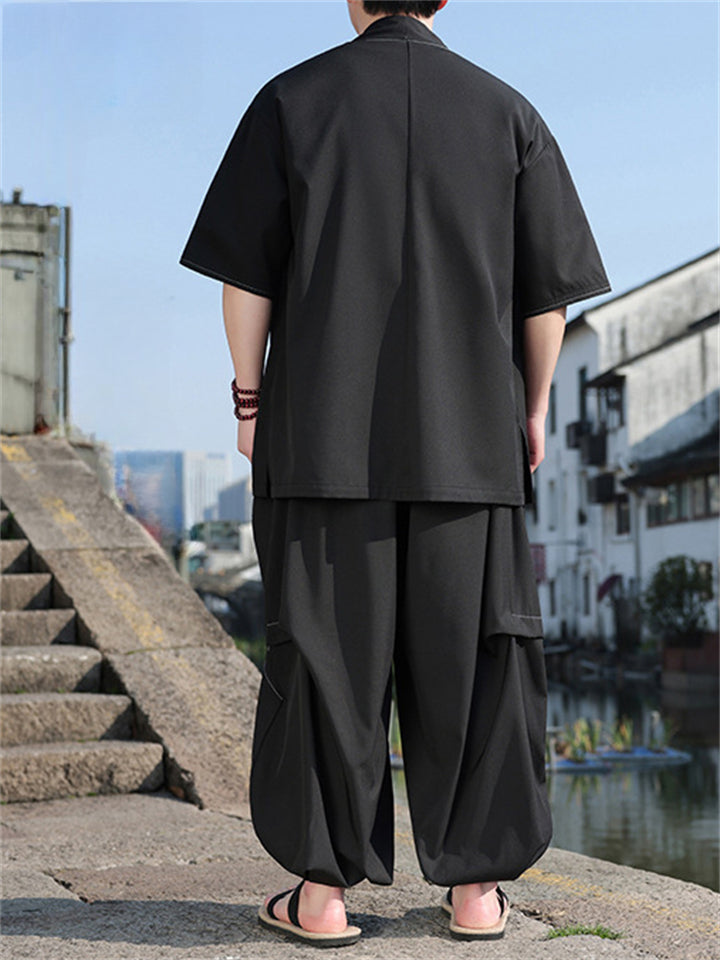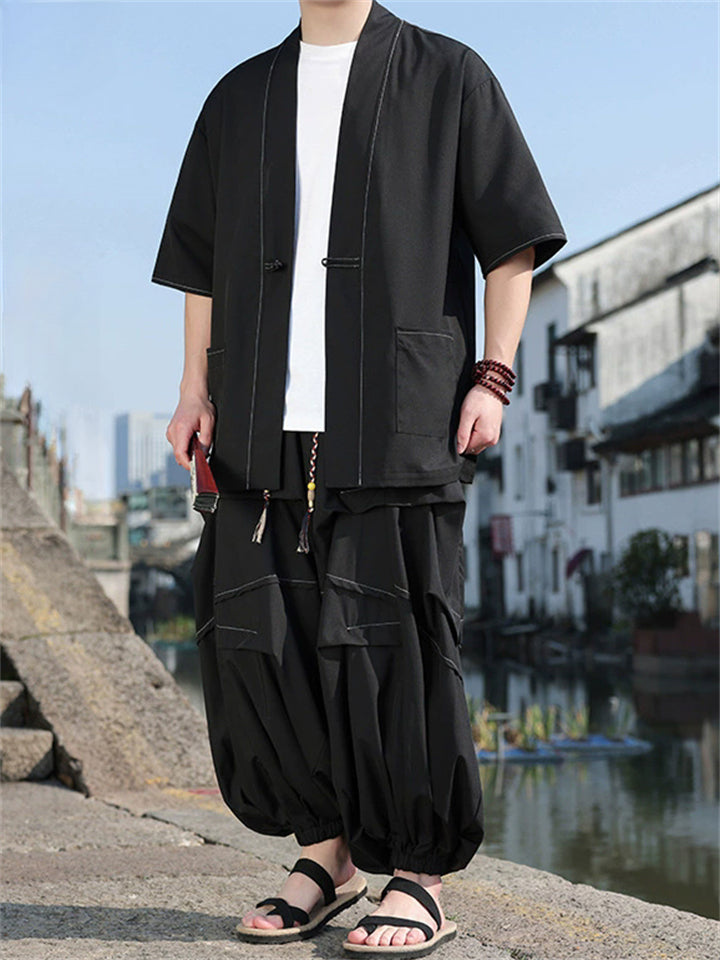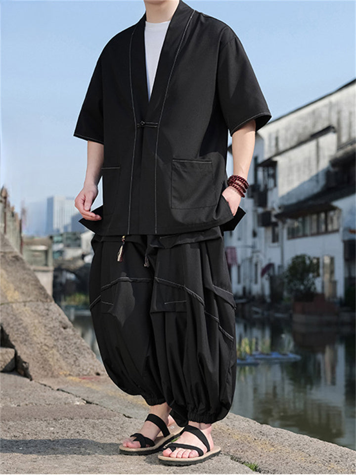 Oriental Style Cardigan Top and Wide Leg Pleated Pants Set for Men