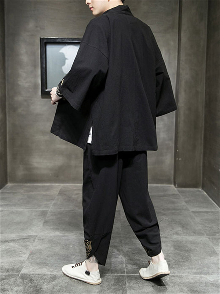 Men's 2Pcs Retro Chinese Style Casual Solid Color 3/4 Sleeve V Neck Outfits