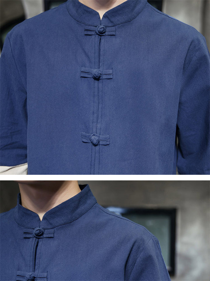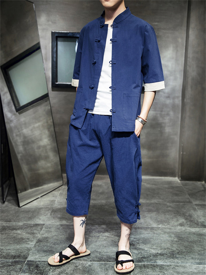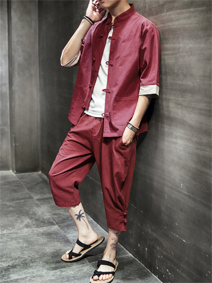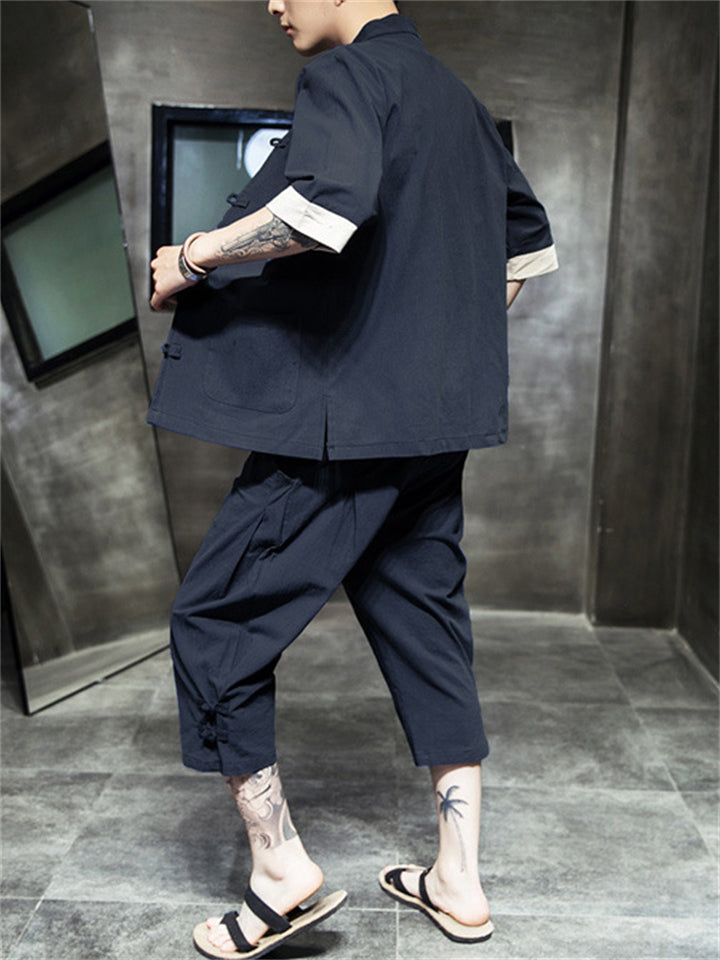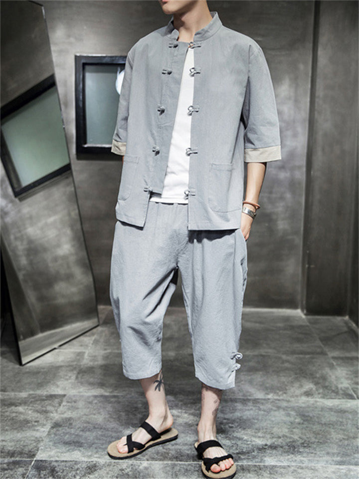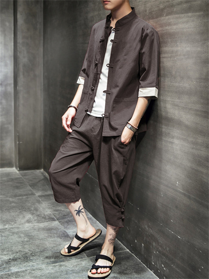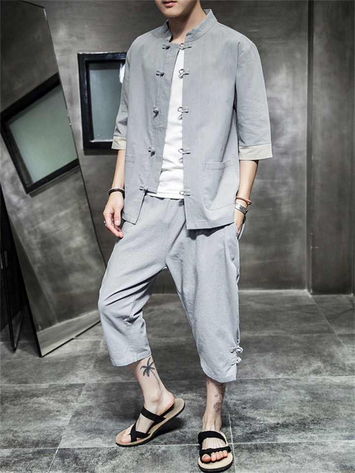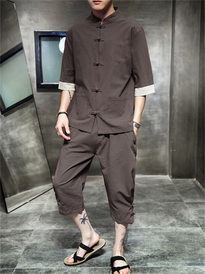 Men's 2Pcs Retro Chinese Style Casual Solid Color 3/4 Sleeve V Neck Outfits