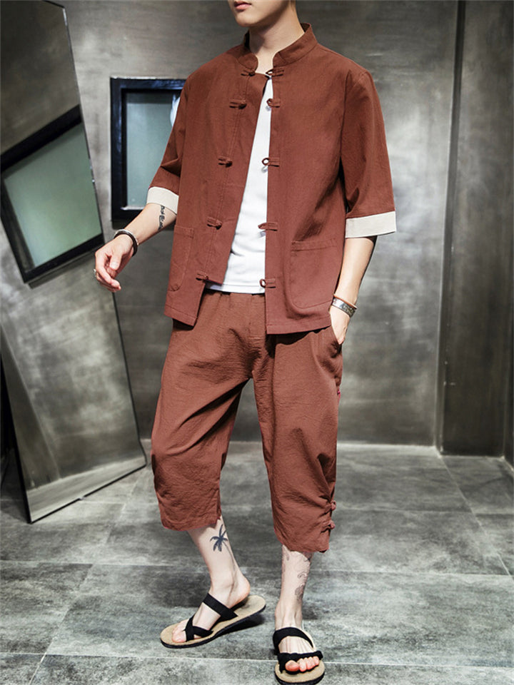 Men's 2Pcs Cool Zen Style Stand Collar Half Sleeve Solid Color Outfits