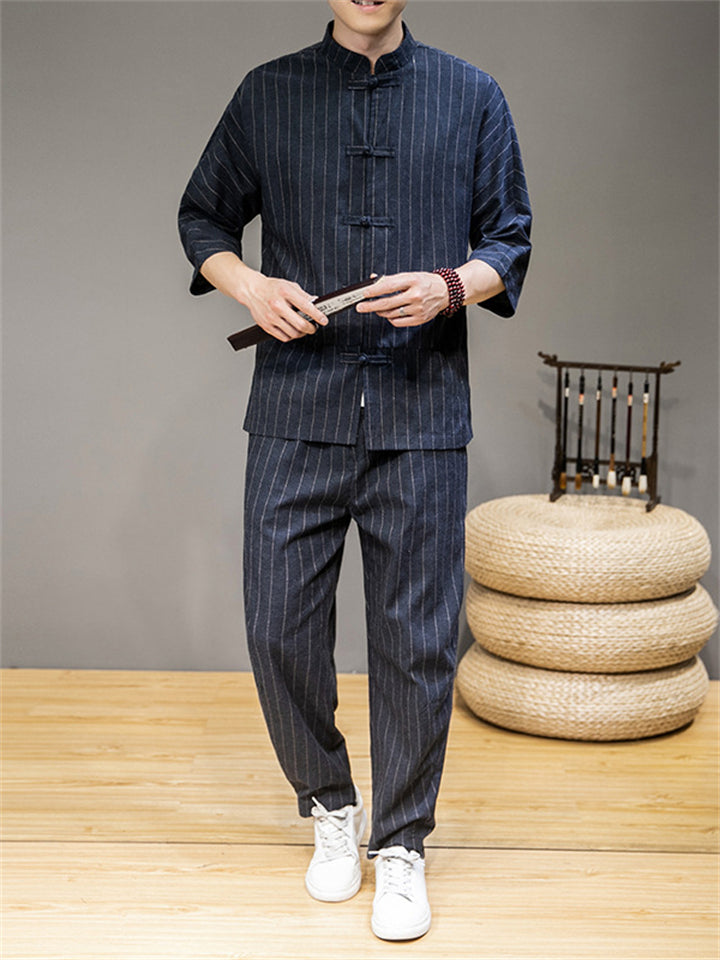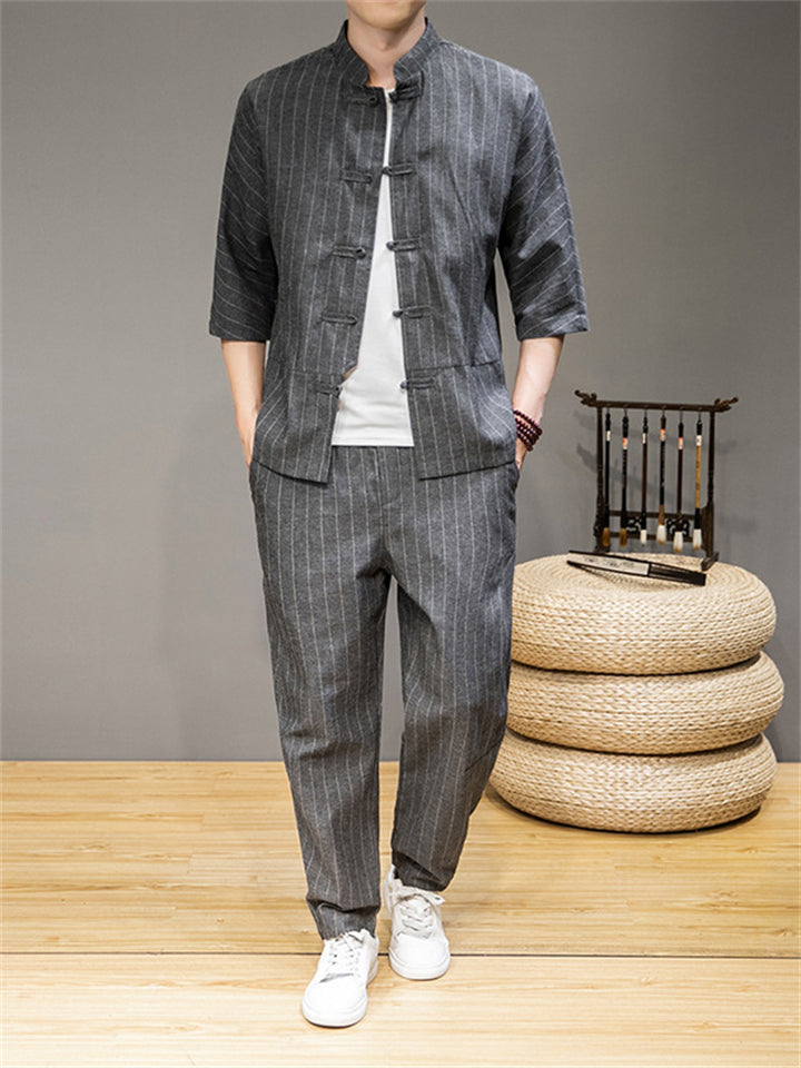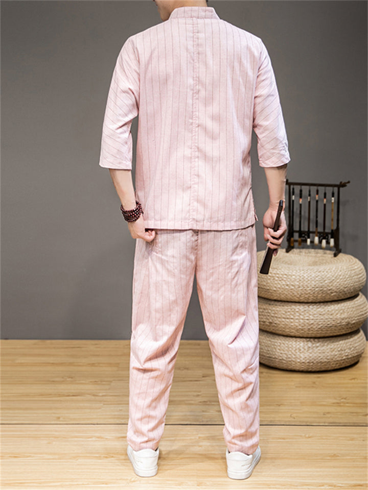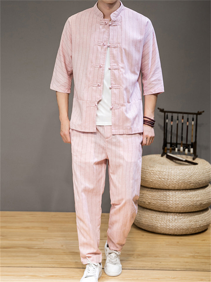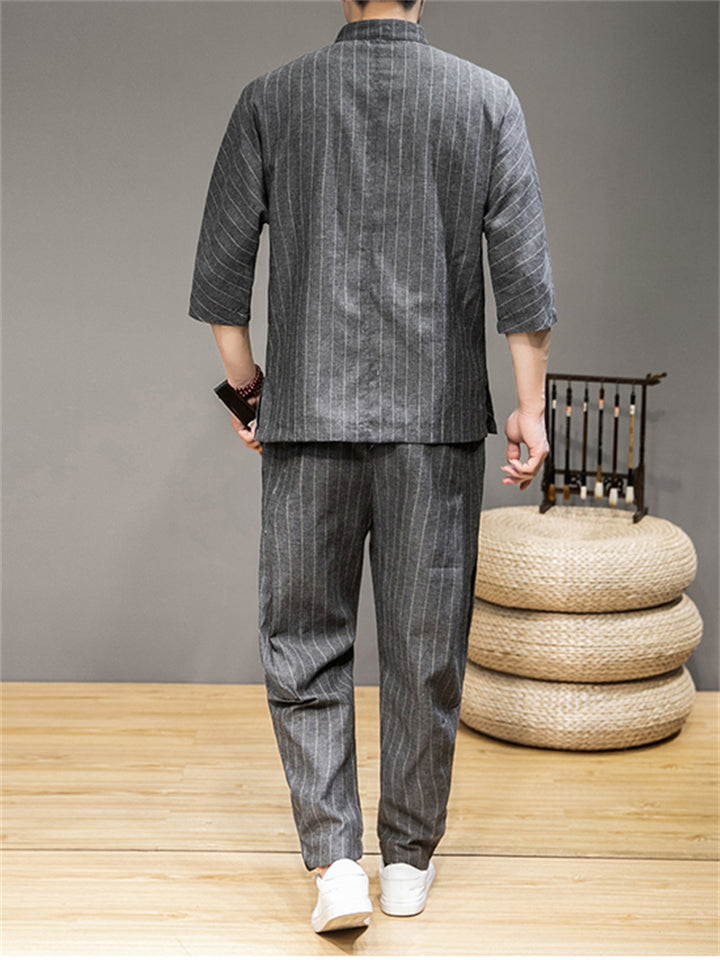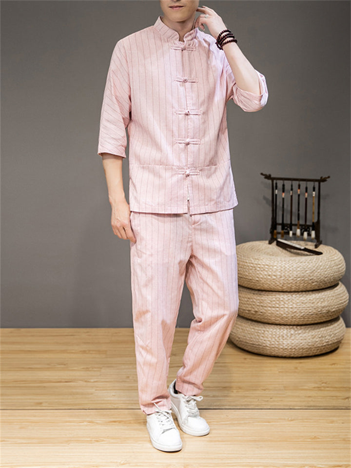 Men's 2Pcs Retro Chinese Style Casual Solid Color 3/4 Sleeve V Neck Outfits