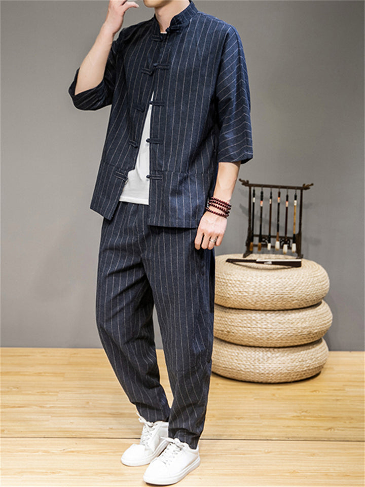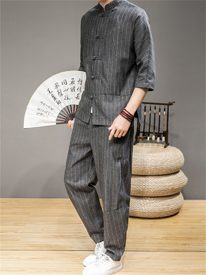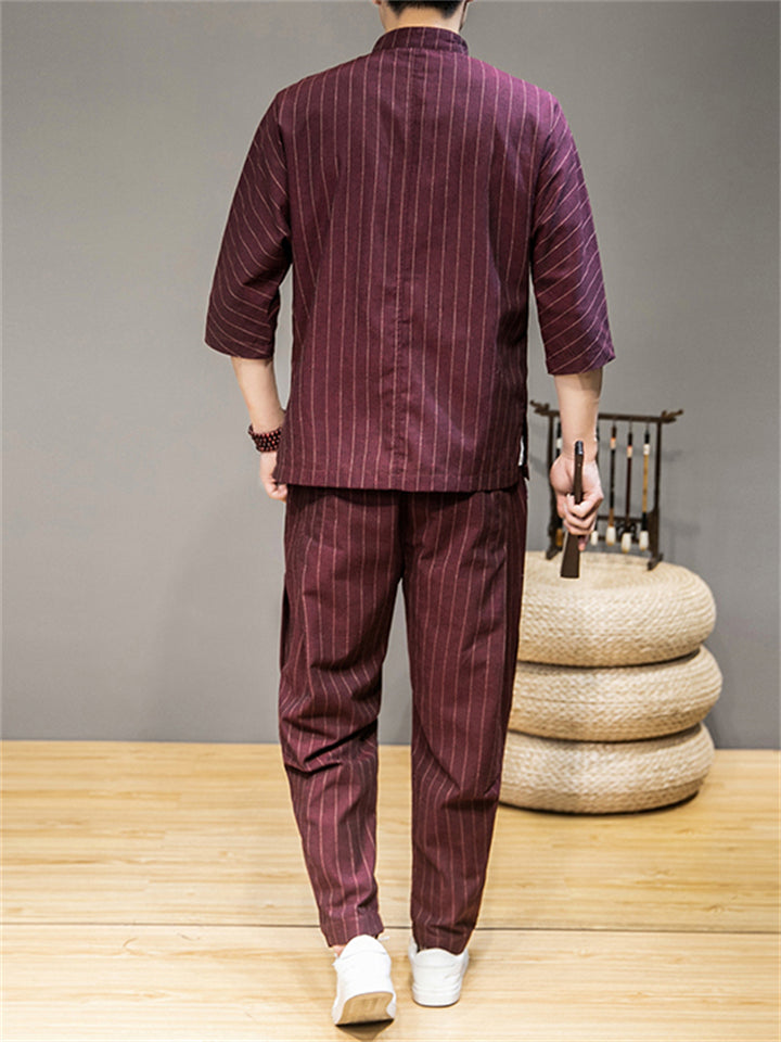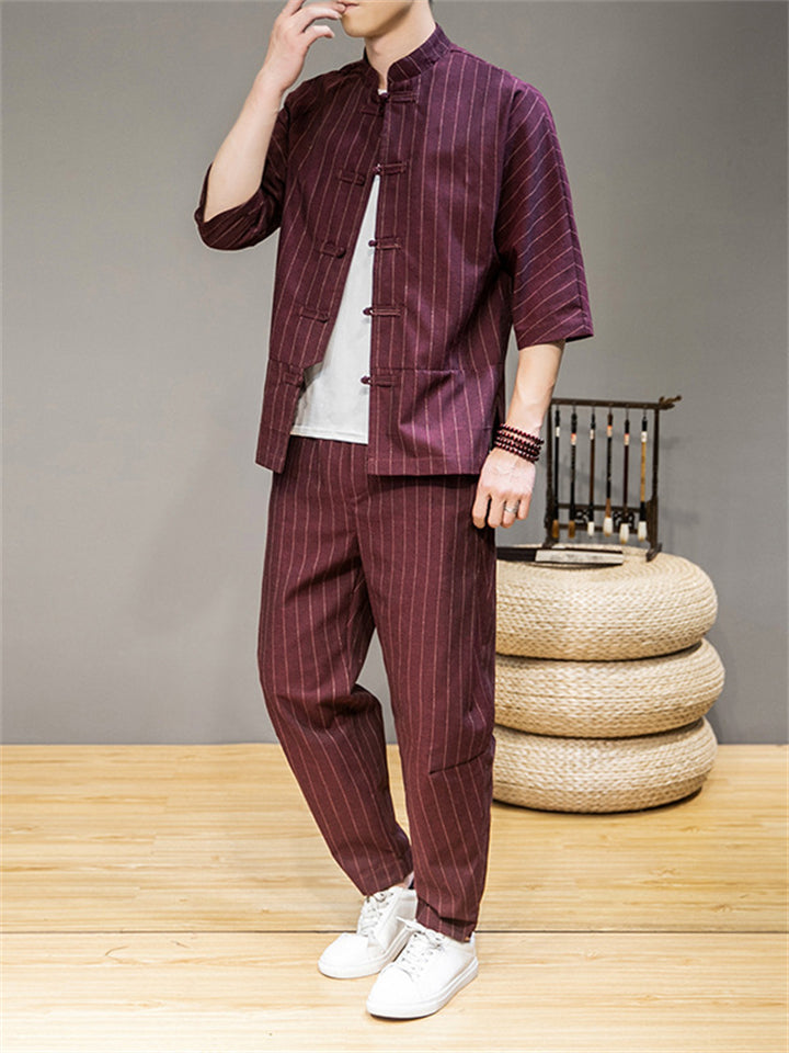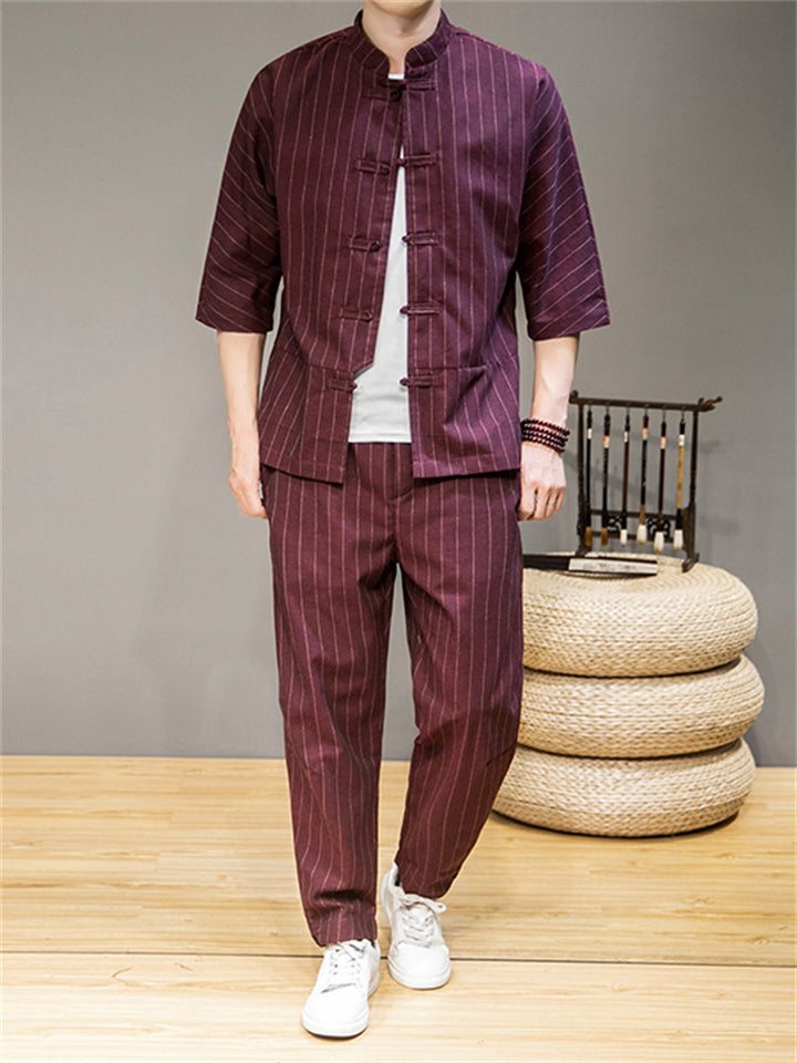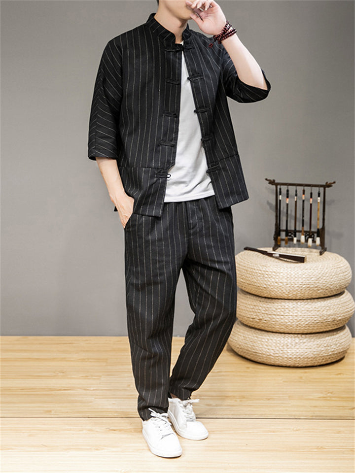 Men's 2Pcs Retro Chinese Style Casual Solid Color 3/4 Sleeve V Neck Outfits