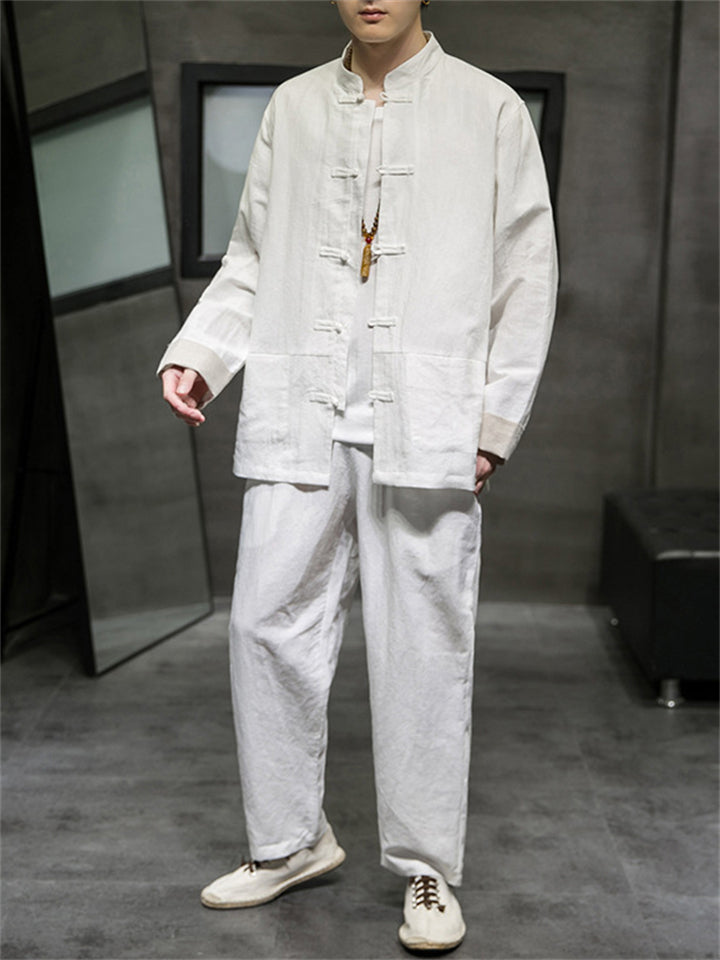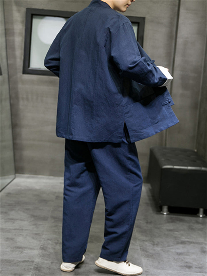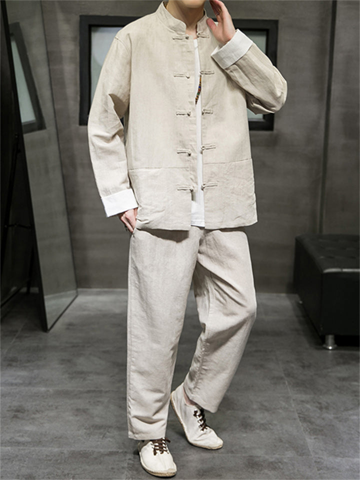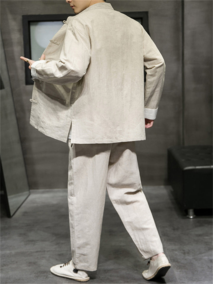 Men's 2Pcs Comfy Autumn Cotton Linen Solid Color TangSuit Outfit
