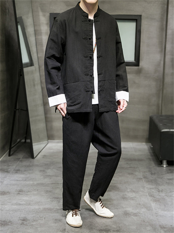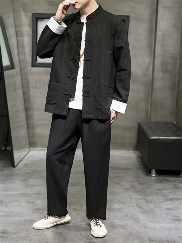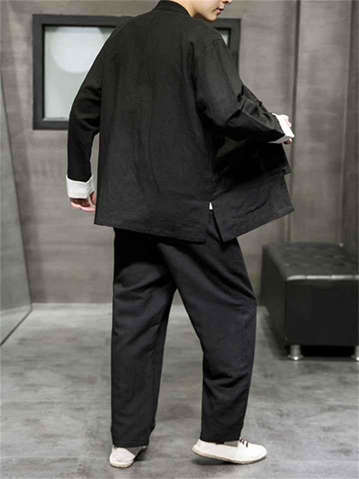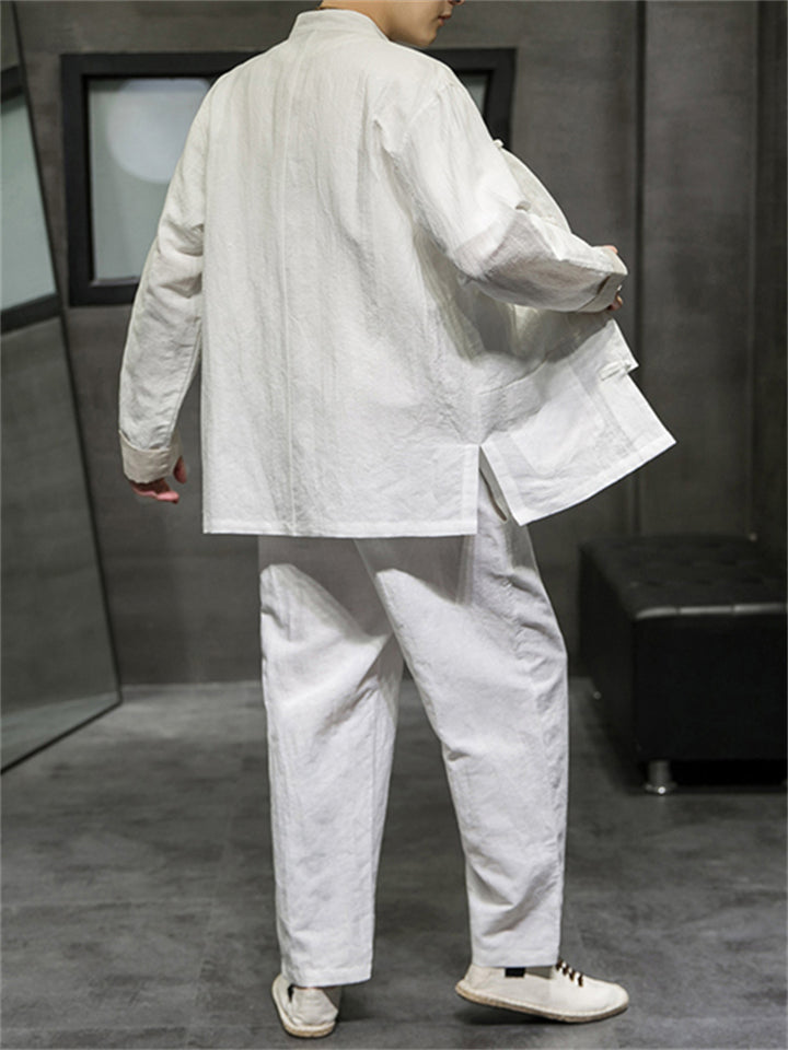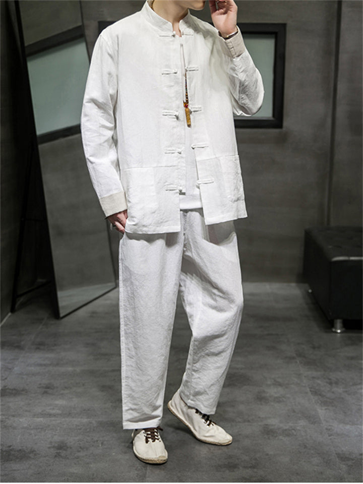 Men's 2Pcs Comfy Autumn Cotton Linen Solid Color TangSuit Outfit
