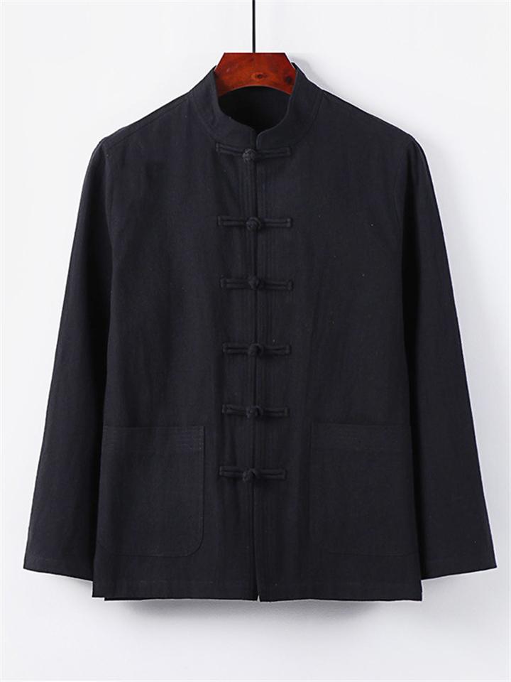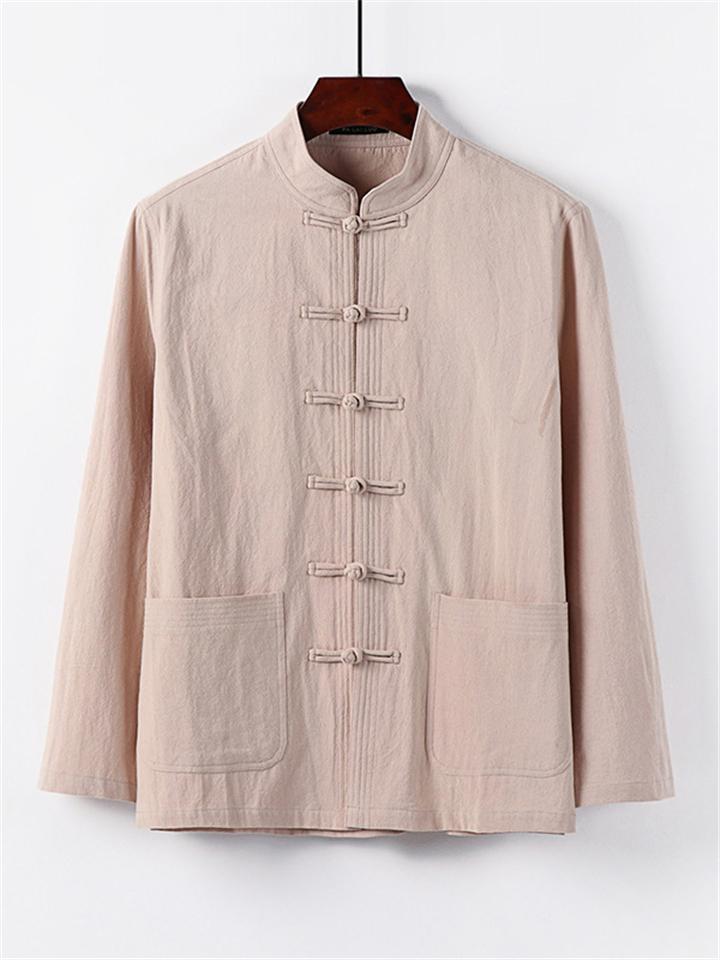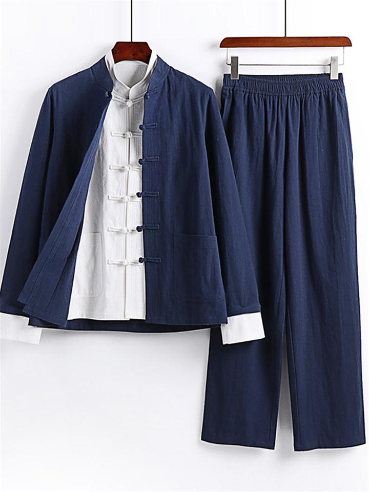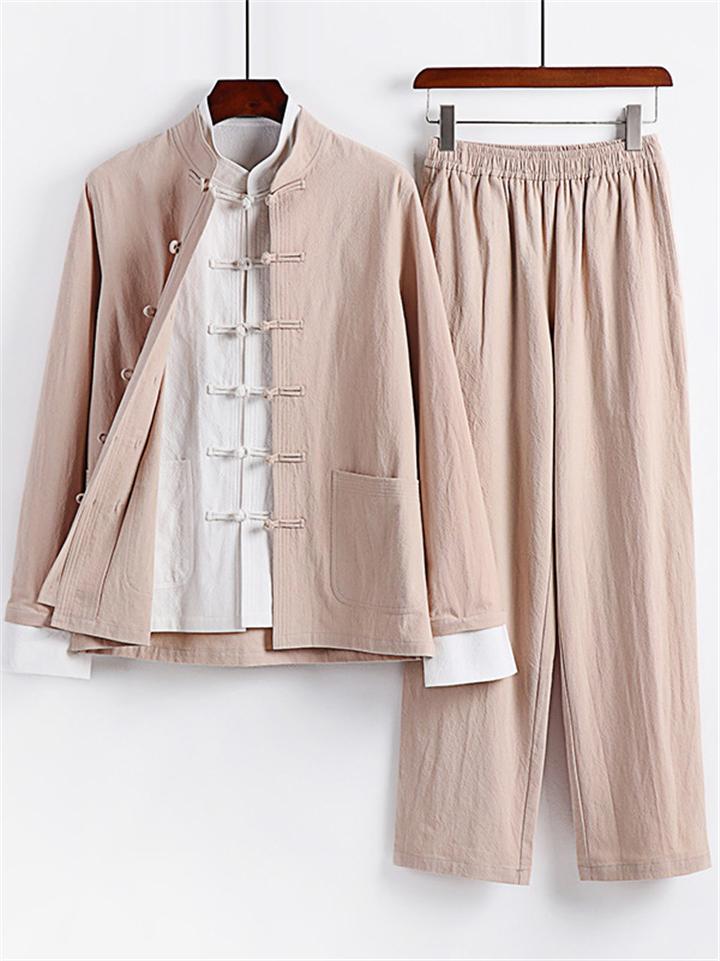 Men's 2Pcs Comfy Autumn Cotton Linen Solid Color TangSuit Outfit