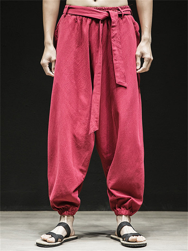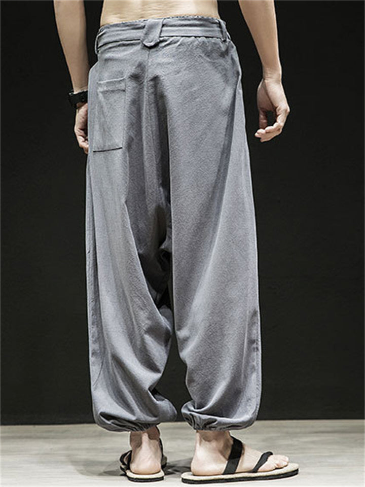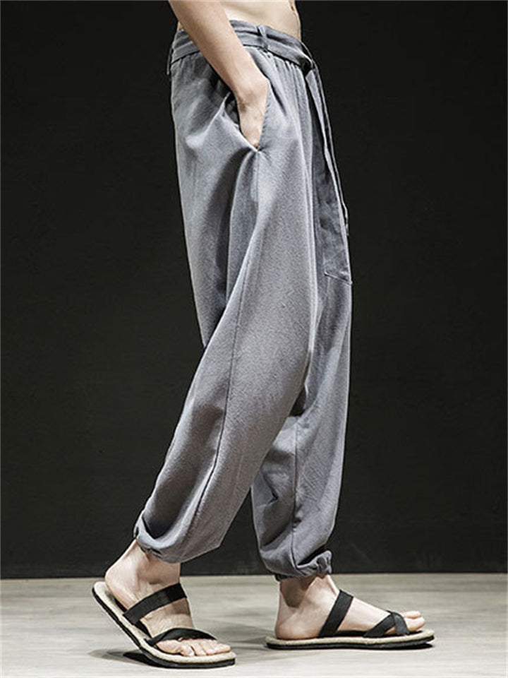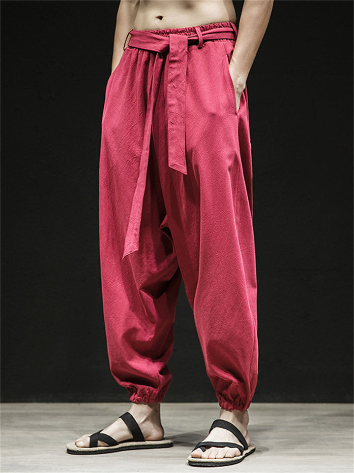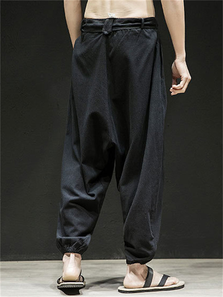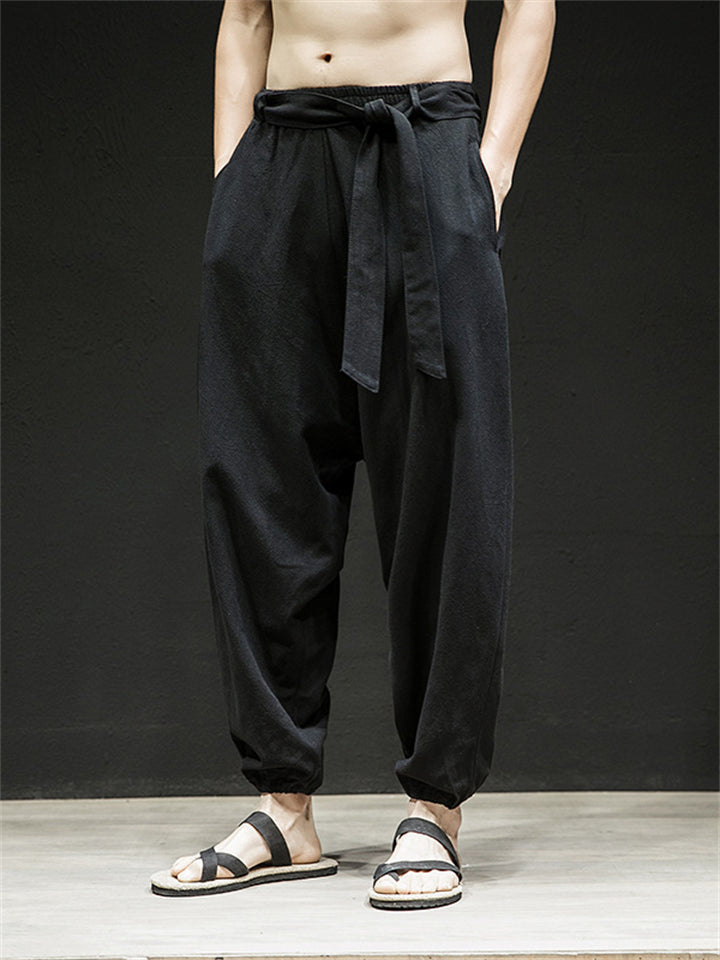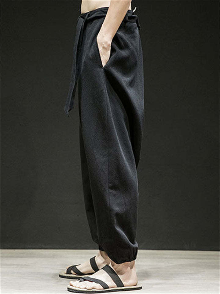 Vintage Japanese Street Style Drawstring Linen Pants for Men