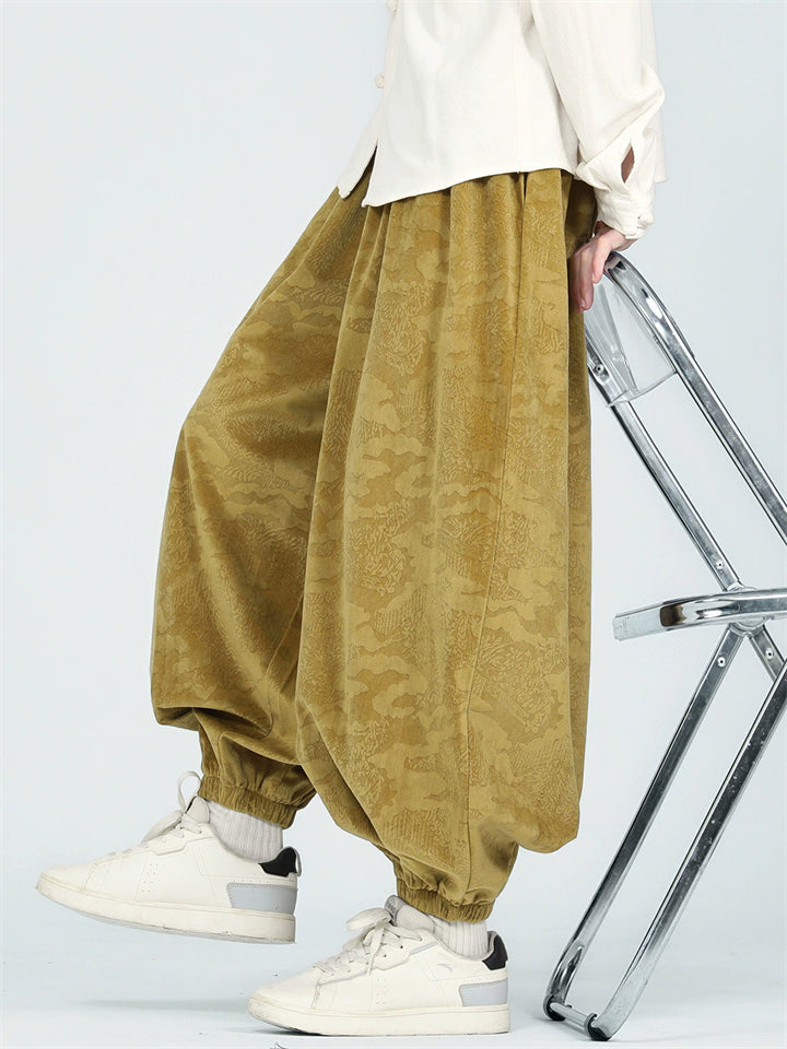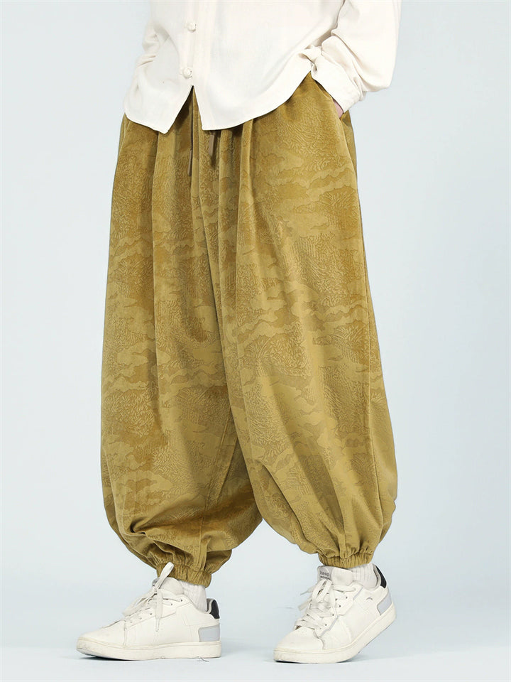 Male's Chinese Style Retro Solid Color Jacquard Wide Leg Bloomers Pants