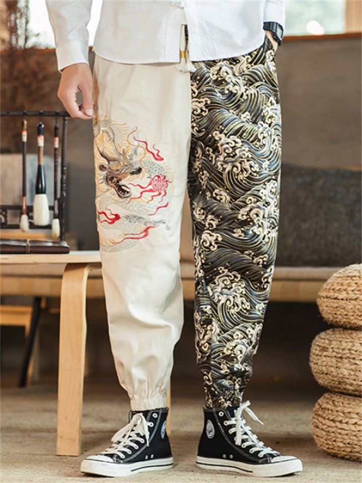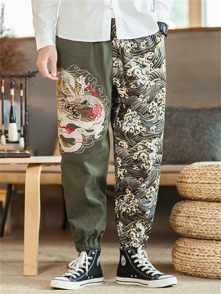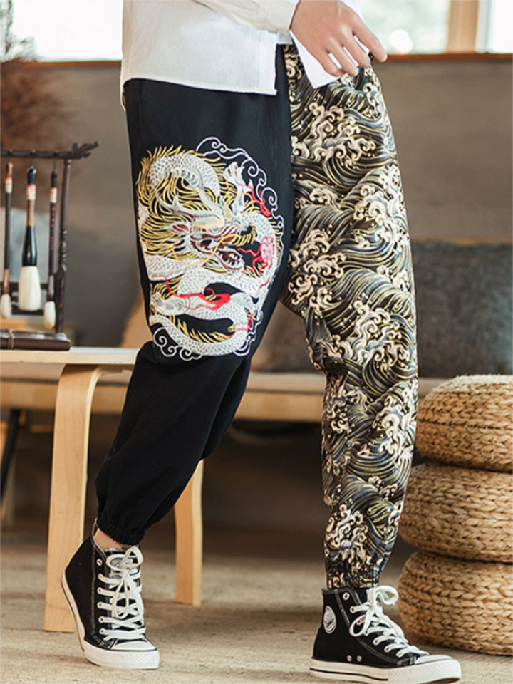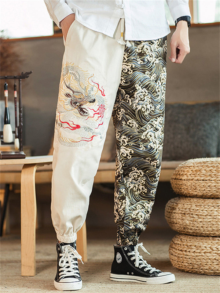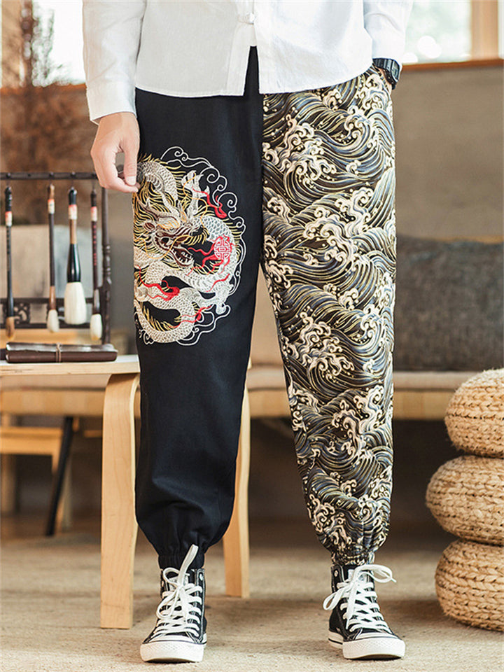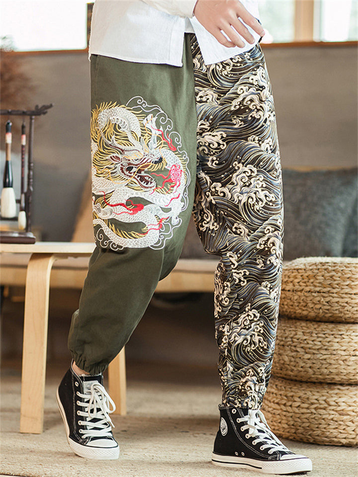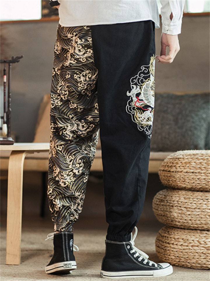 Men's Ancient Loong Sea Wave Embroidery Vintage Pants