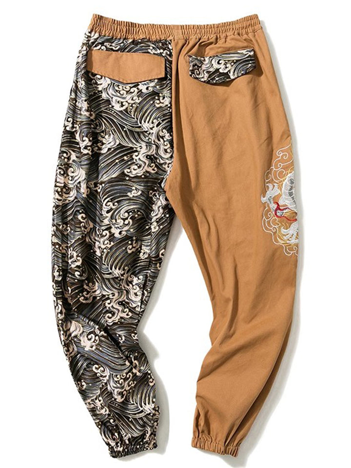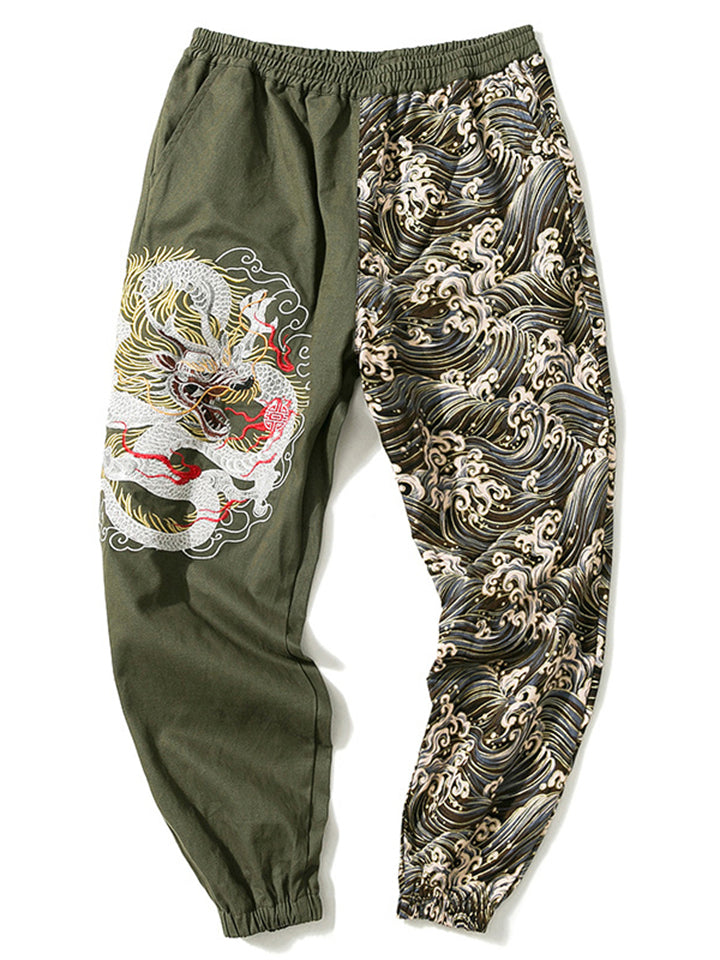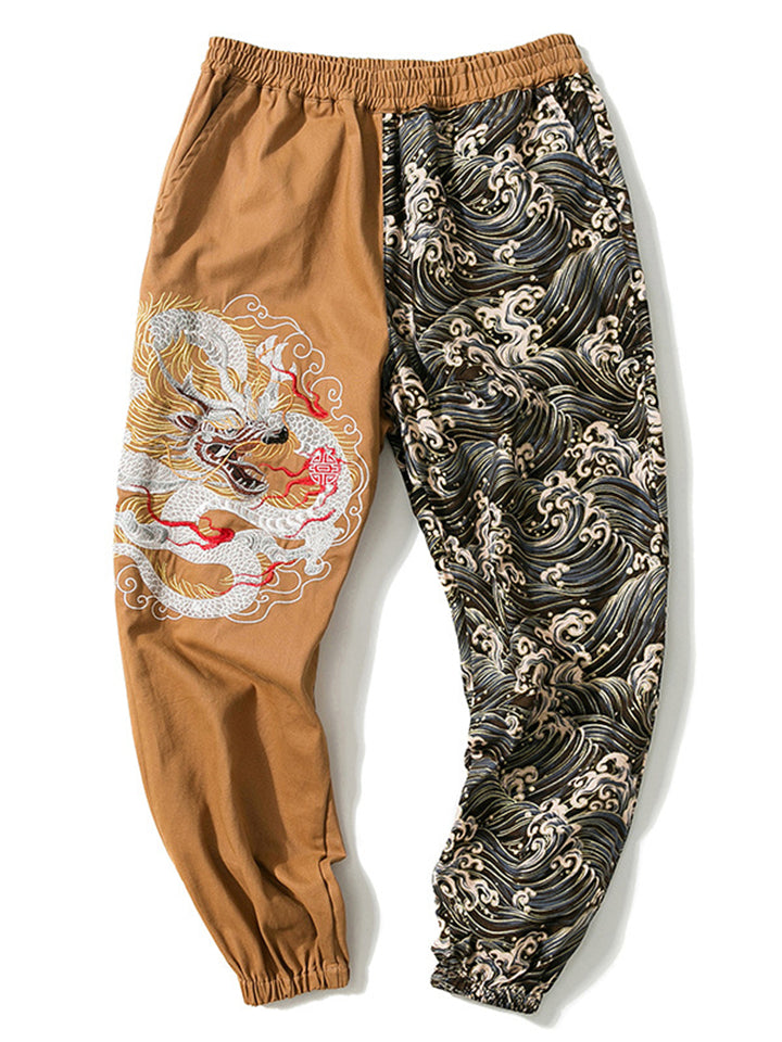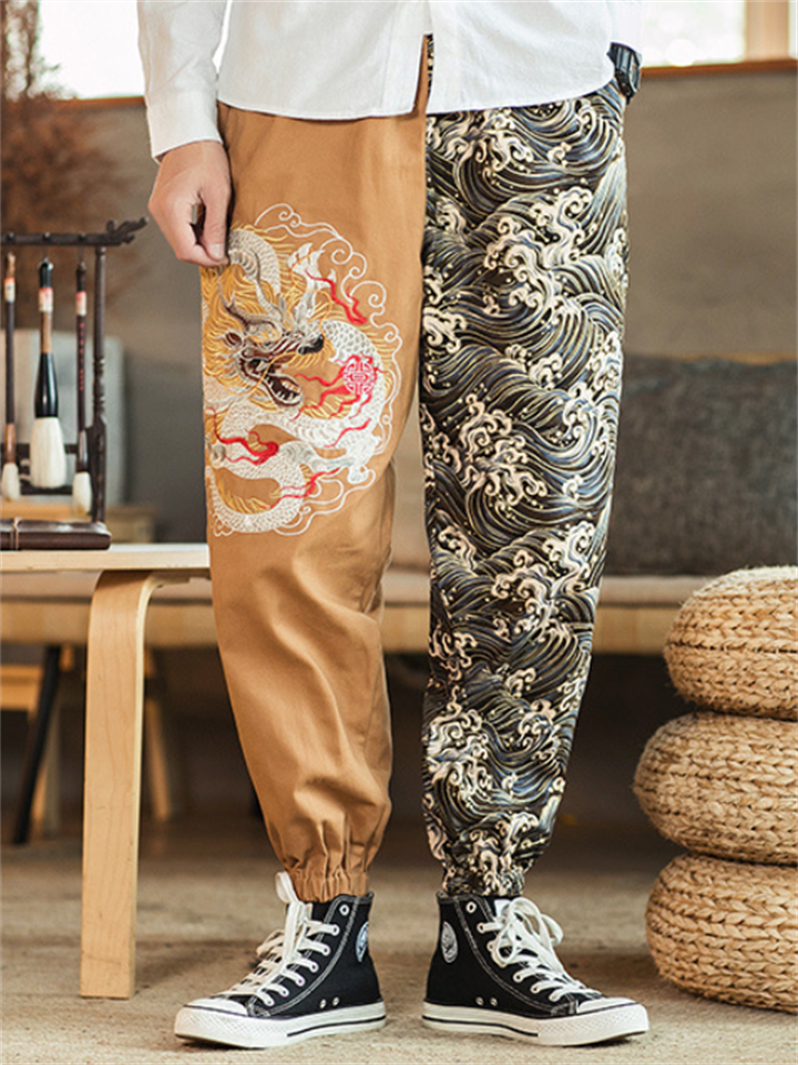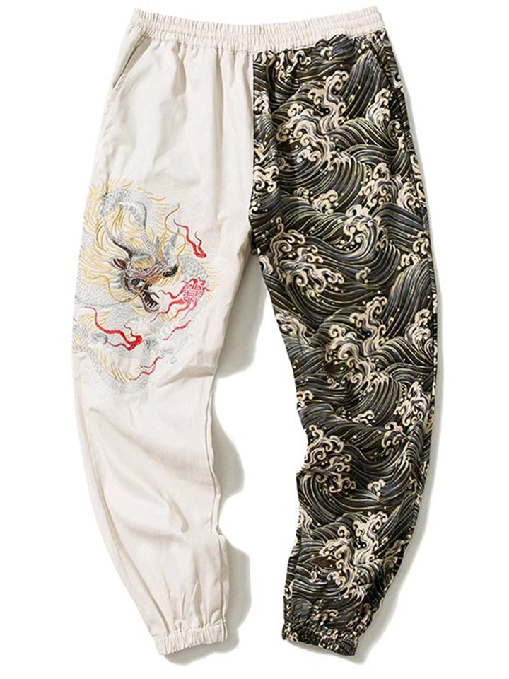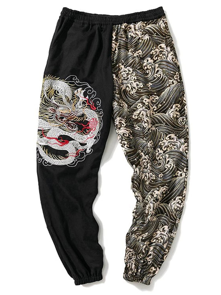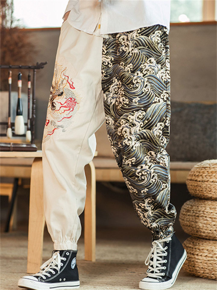 Men's Ancient Loong Sea Wave Embroidery Vintage Pants