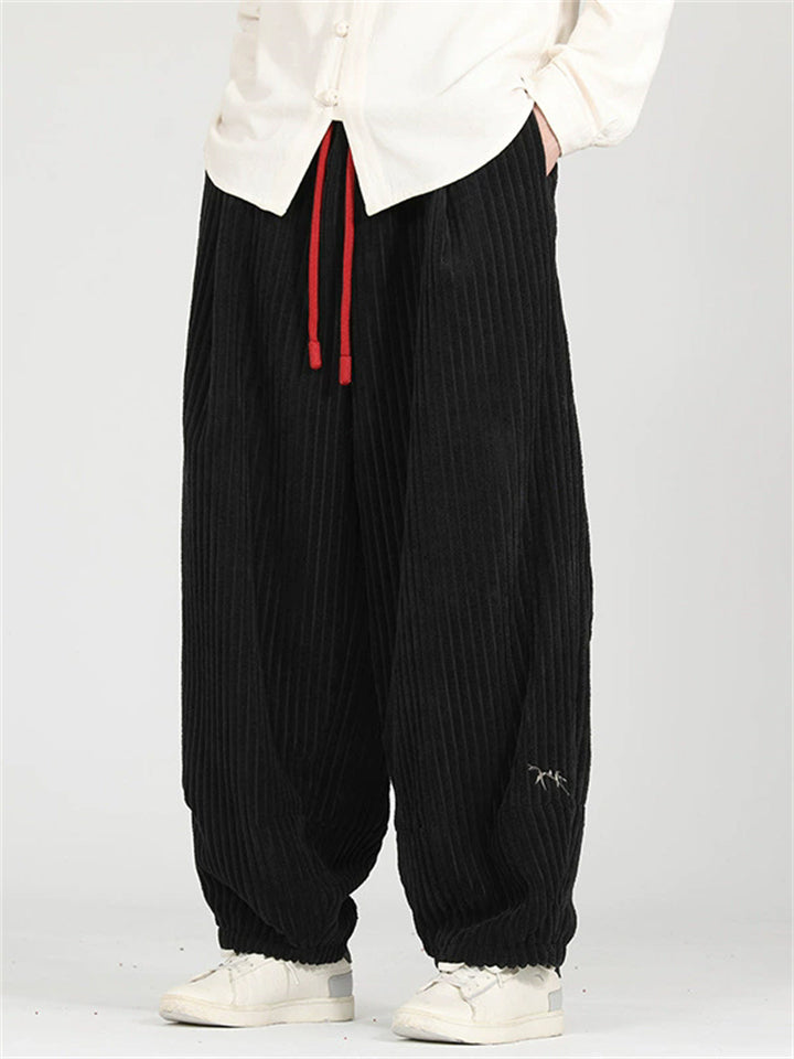 Men's Autumn Chinese Style Embroidered Corduroy Drawstring Wide Leg Pants