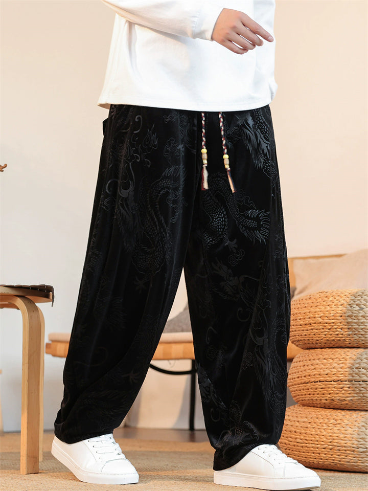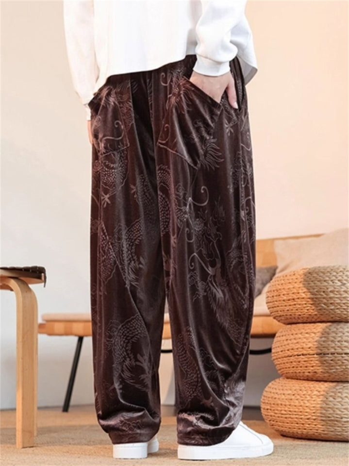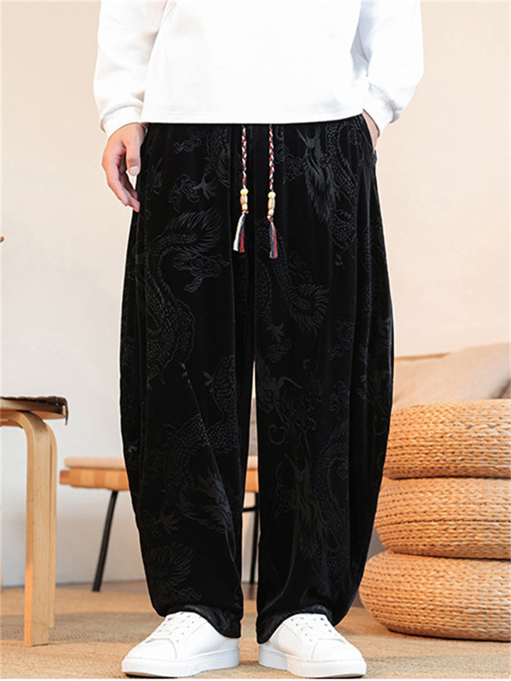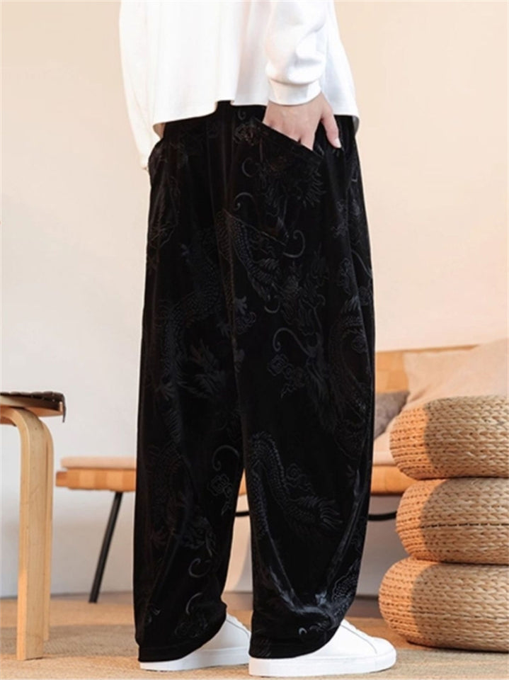 Men's Autumn Chinese Style Loong Pattern Velvet Wide Leg Pants