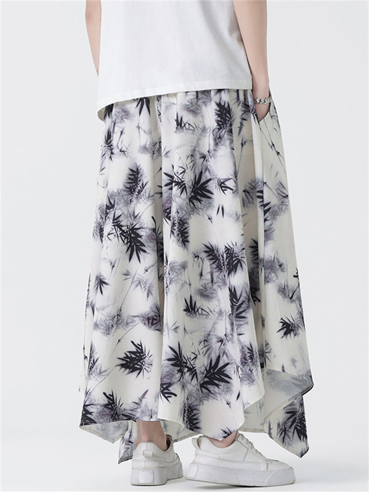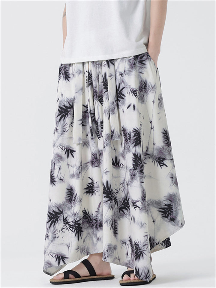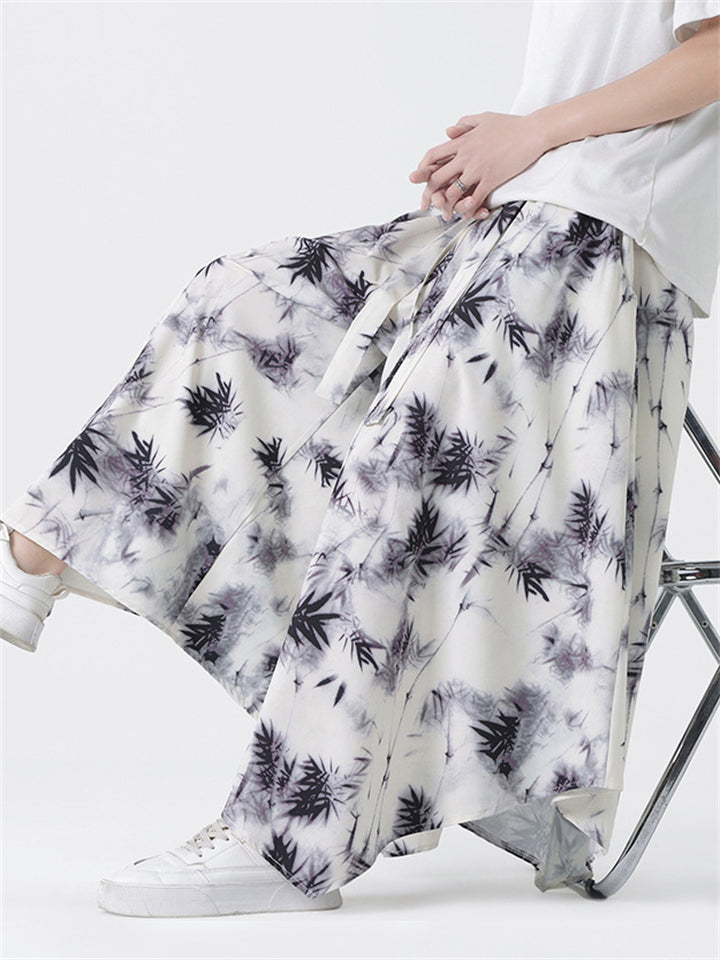 Men's Black Bamboo Leaf Print Loose Ice Silk Pants