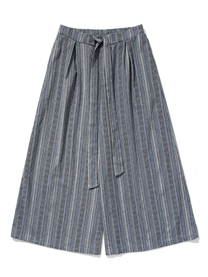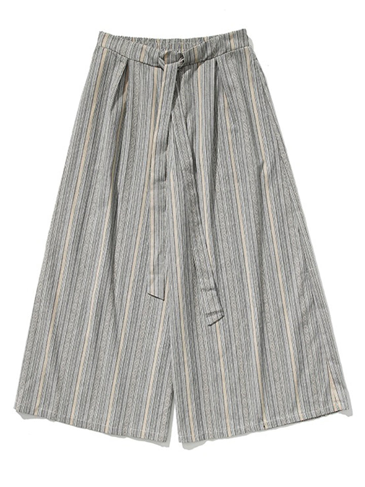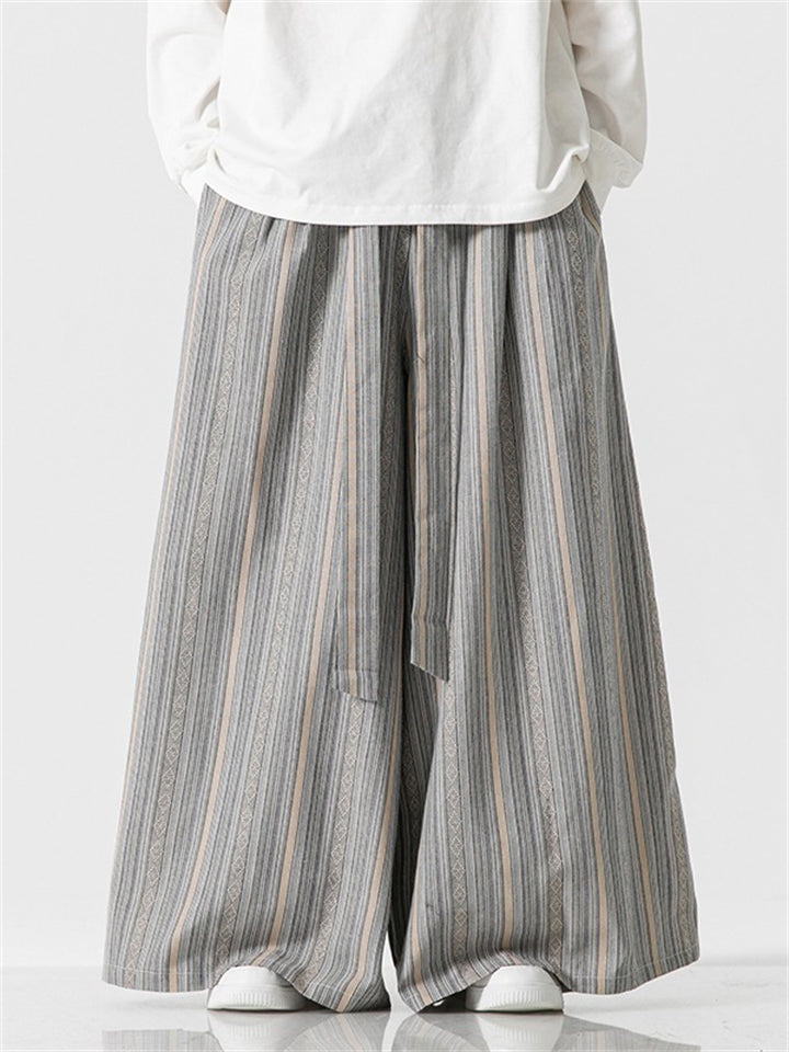 Men's Bohemian Cotton Linen Lace Up Striped Wide Leg Pants