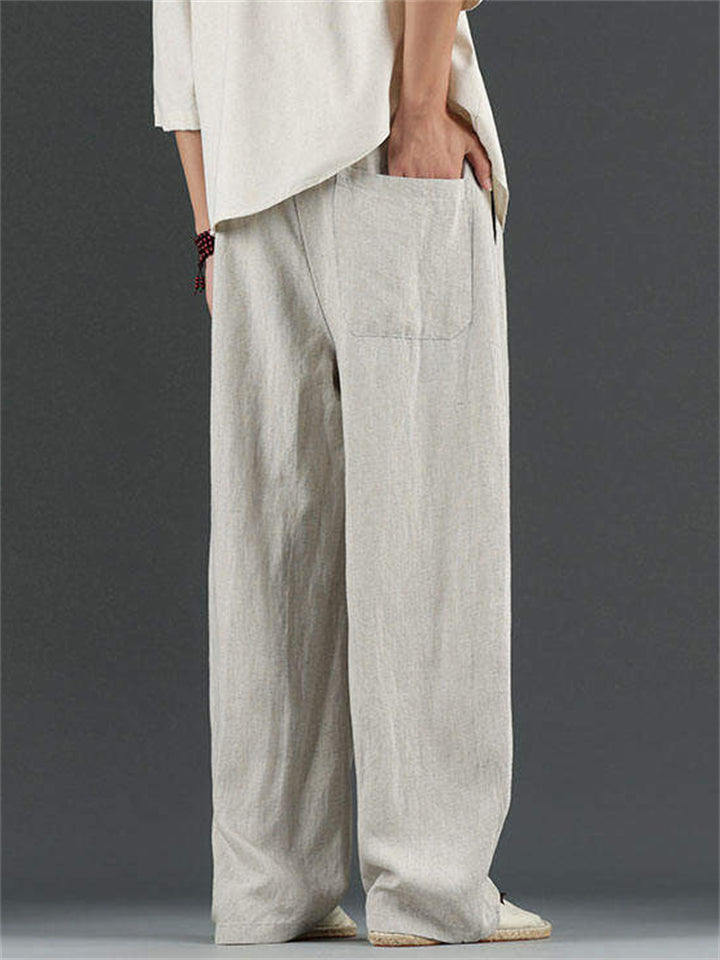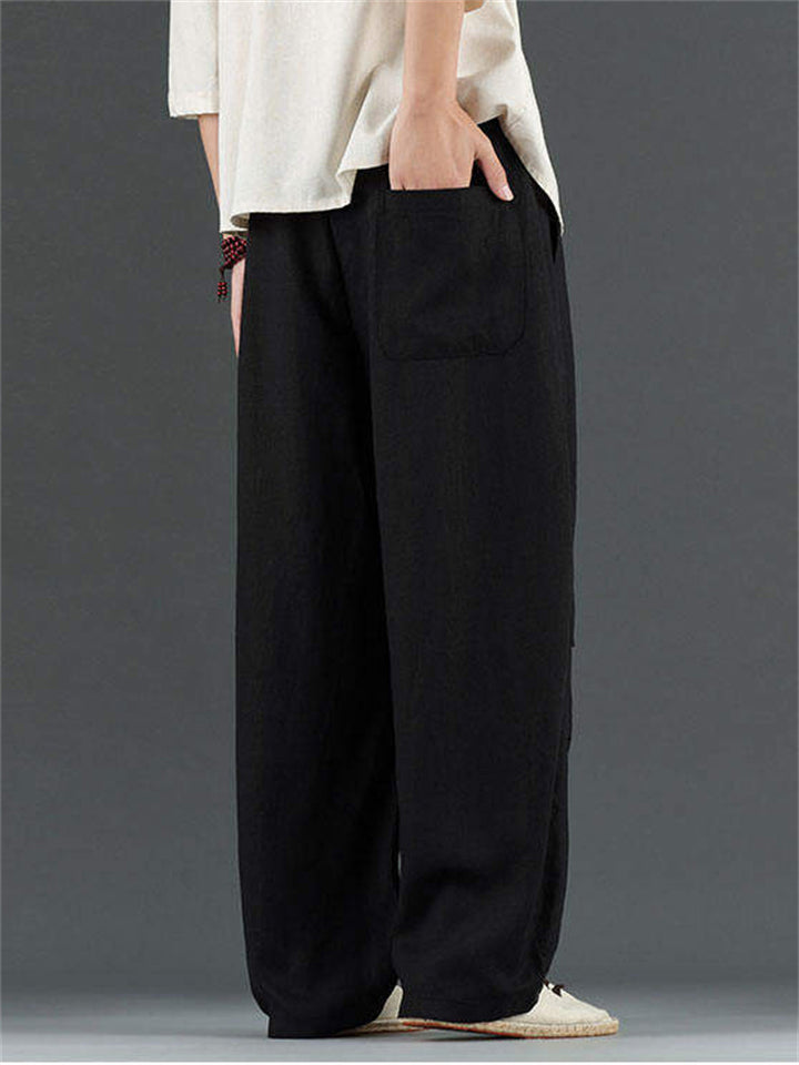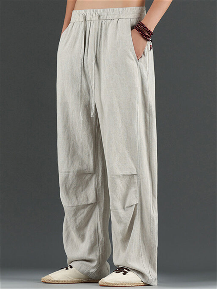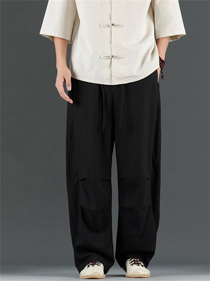 Men's Casual Chinese Style Solid Color Linen Drawstring Scimitar Pants