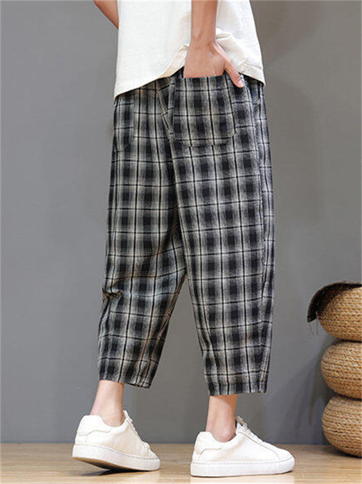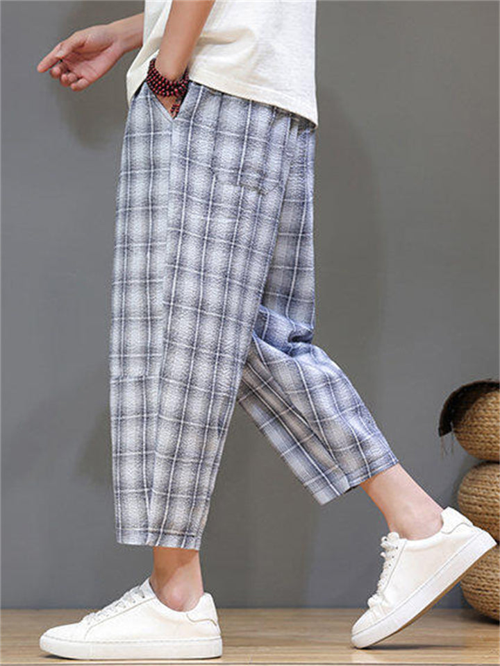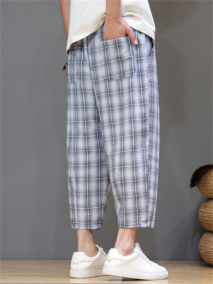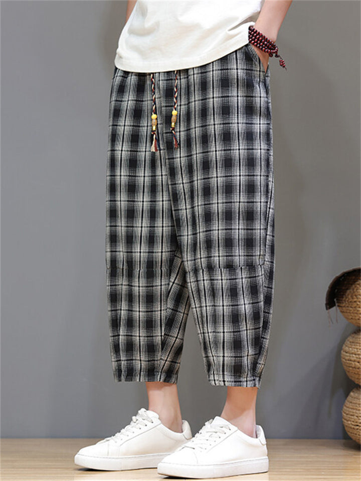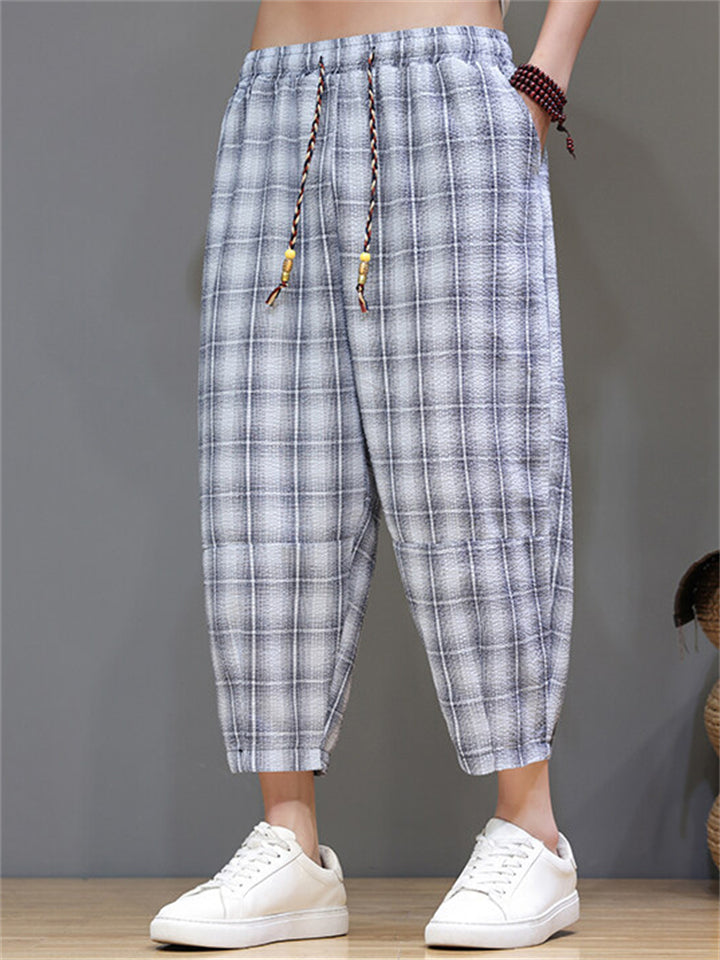 Men's Casual Drawstring Wide Leg Plaid Capri Pants