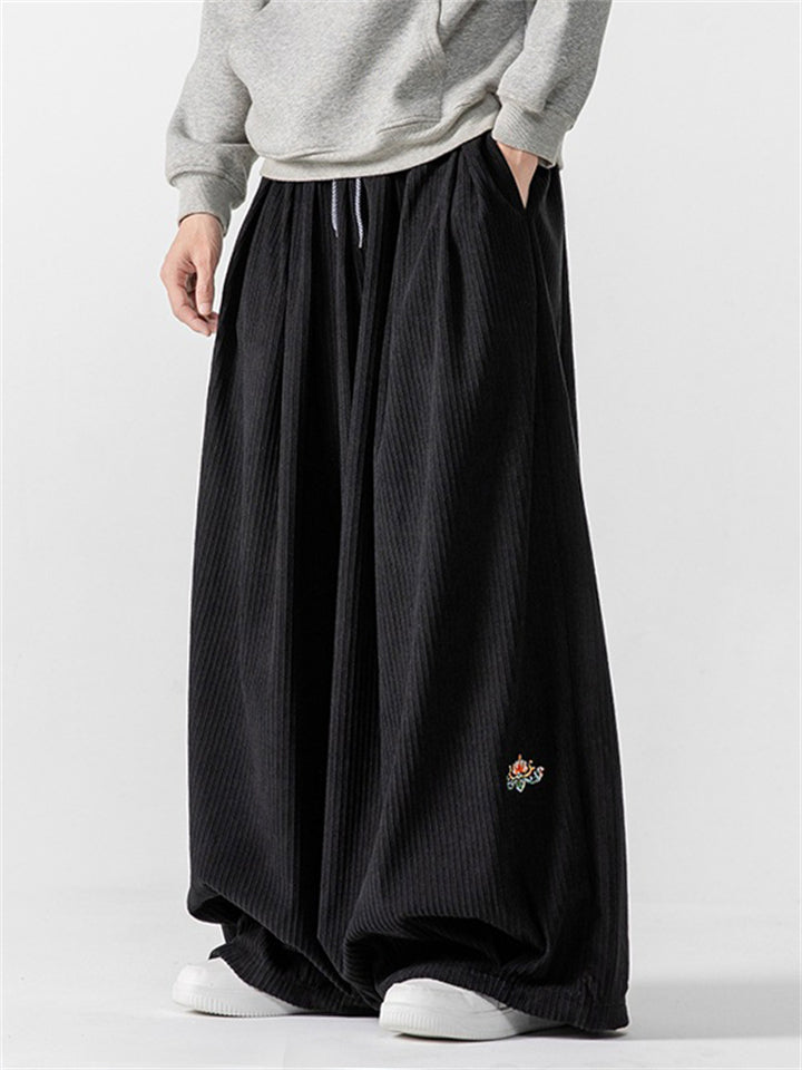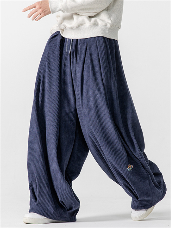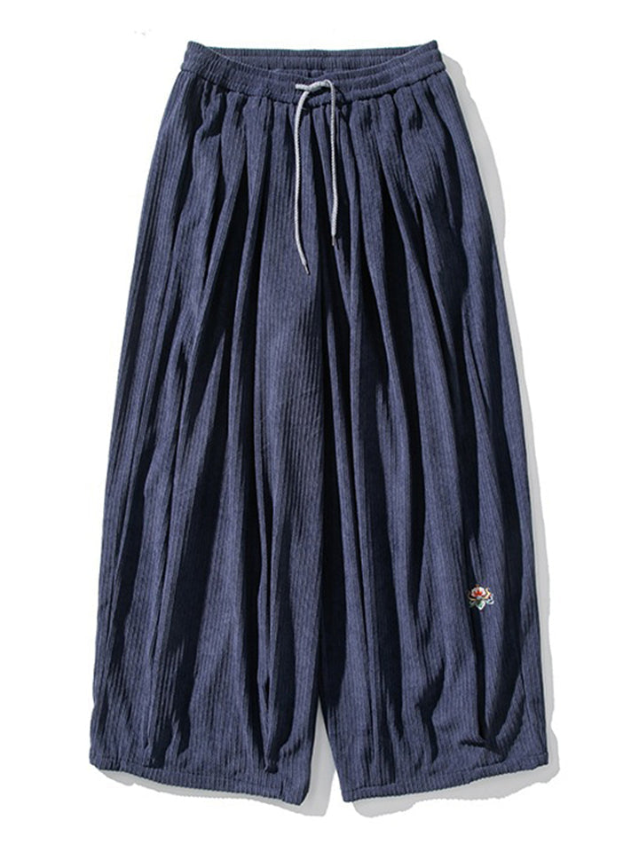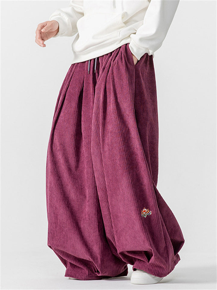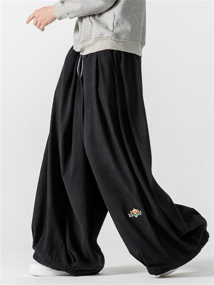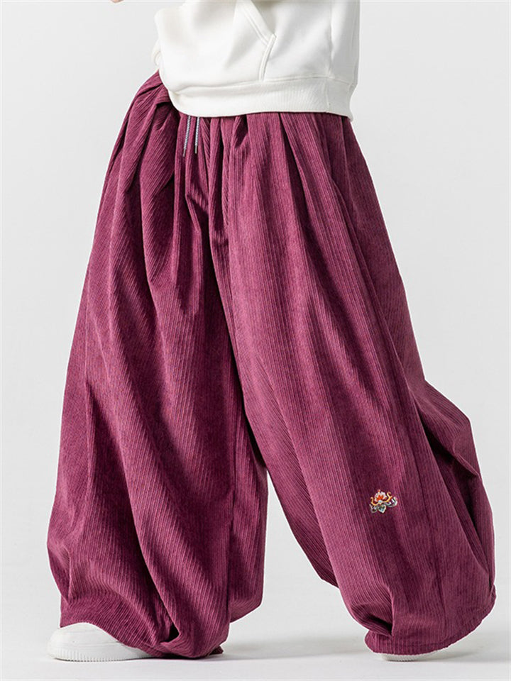 Men's Chinese Lotus Embroidery Warm Corduroy Baggy Pants