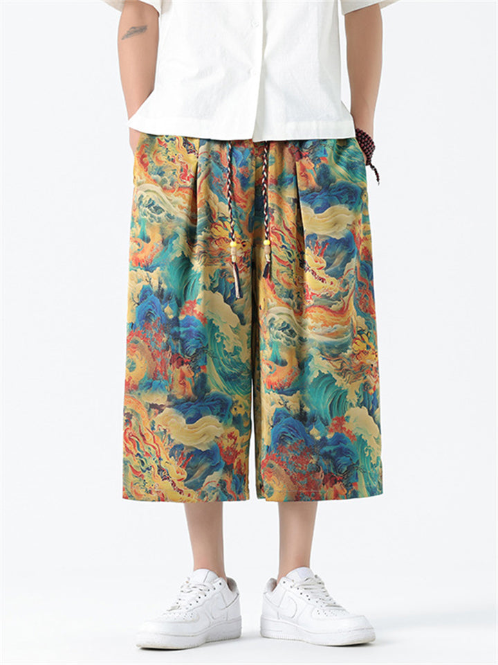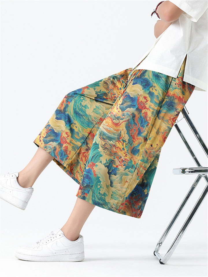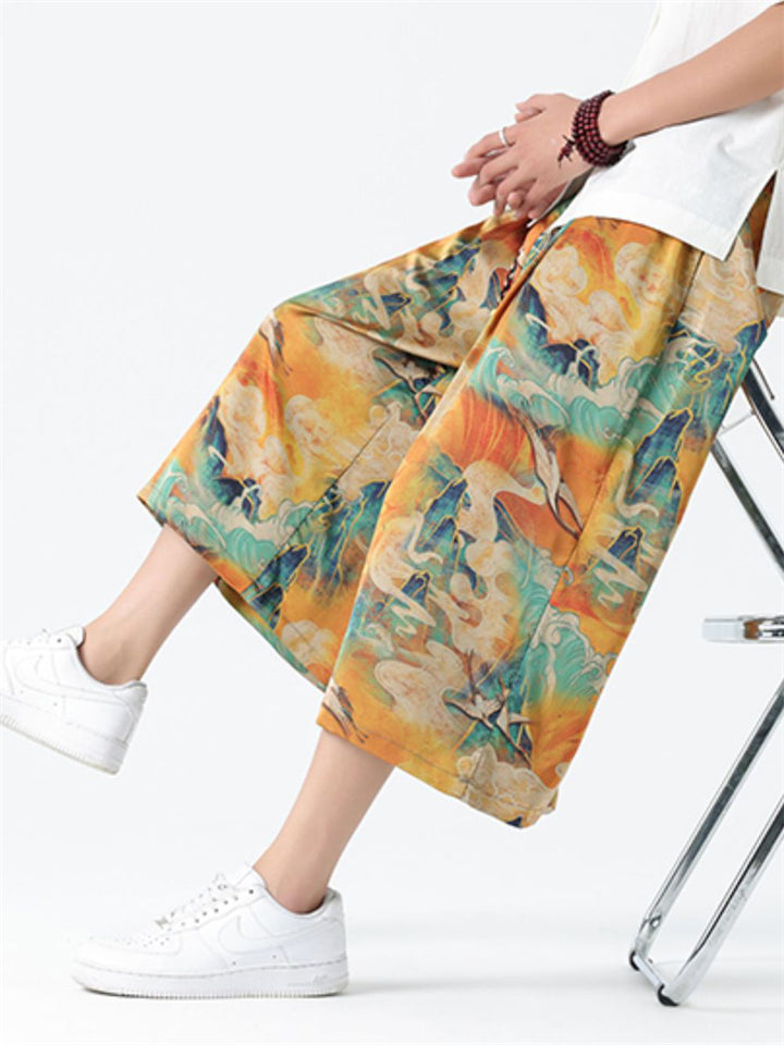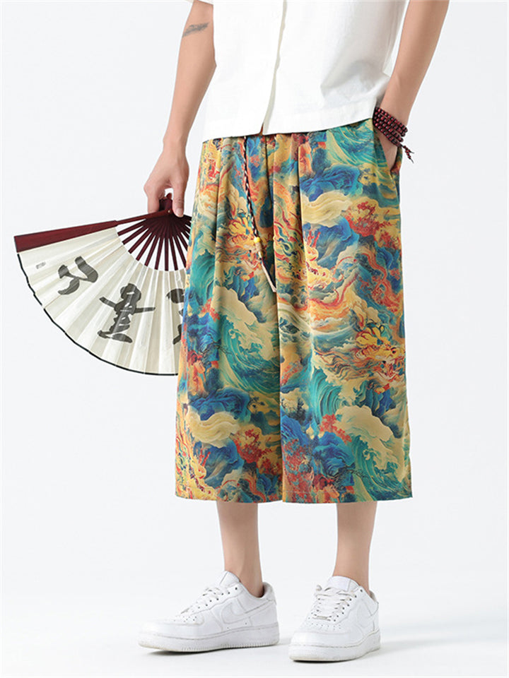 Men's Chinese Style Ancient Dragon & Crane Print Cropped Pants