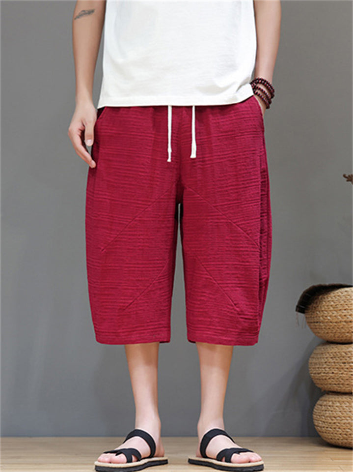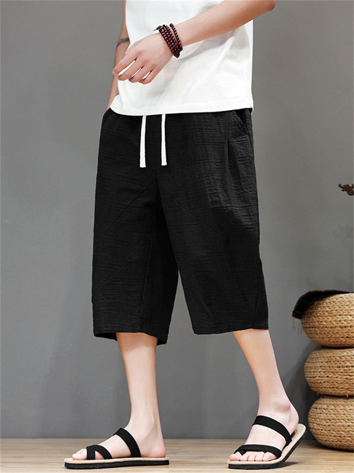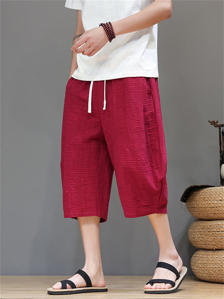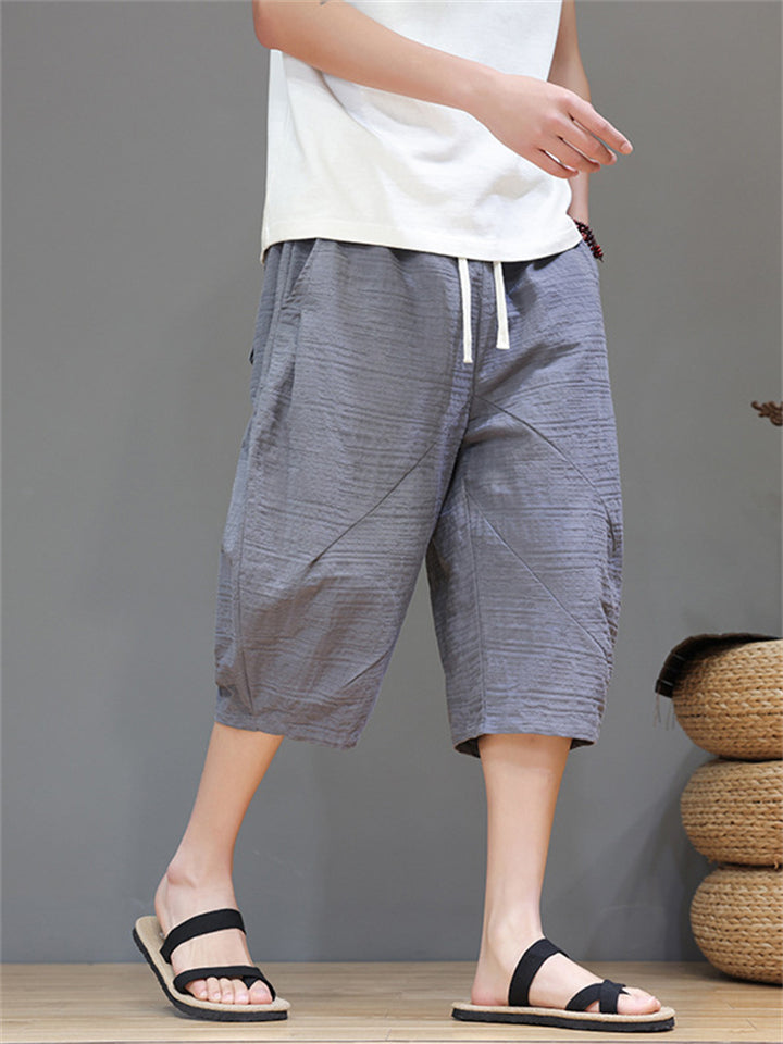 Men's Cotton Linen Solid Color Texture Drawstring Capri Pants