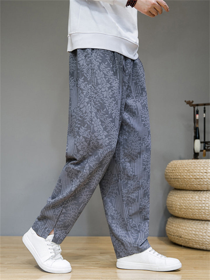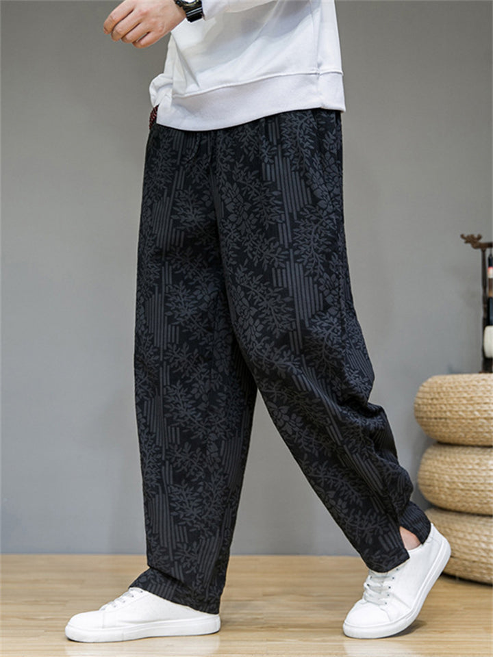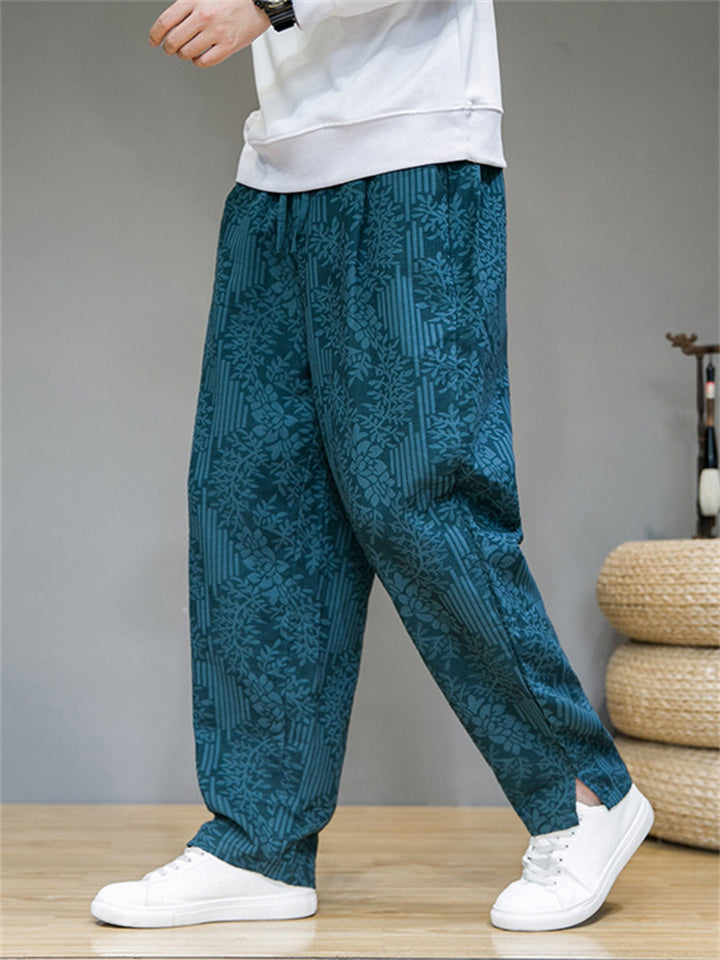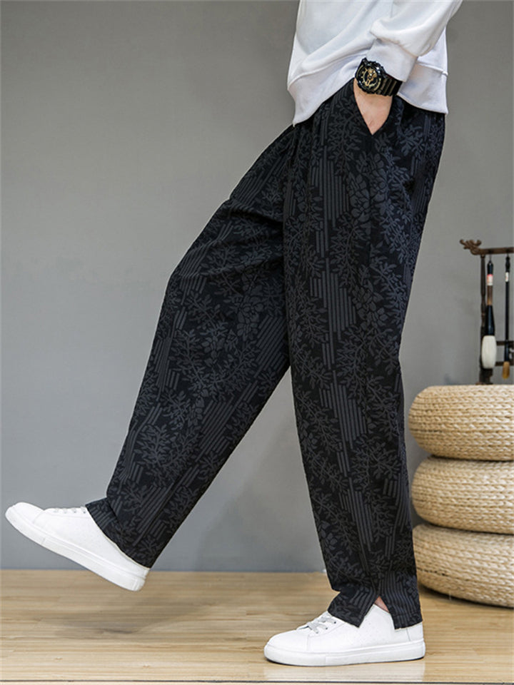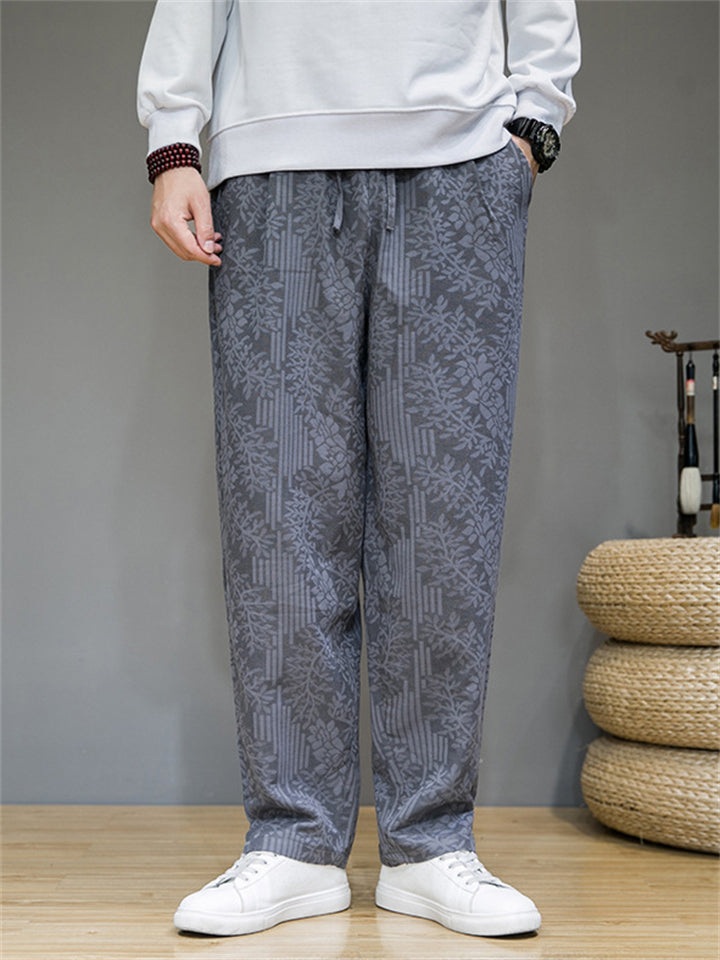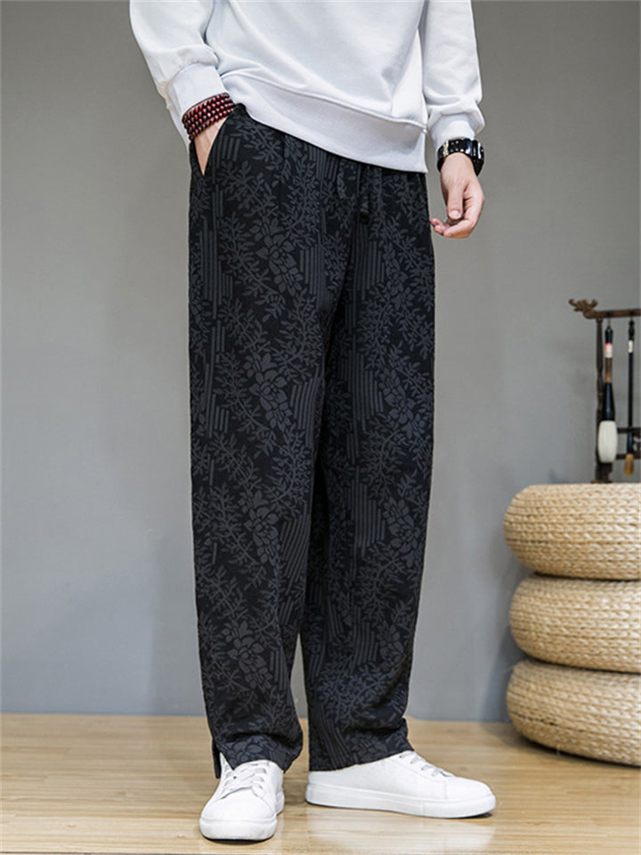 Men's Leaf Jacquard Side Slit Drawstring Casual Pants