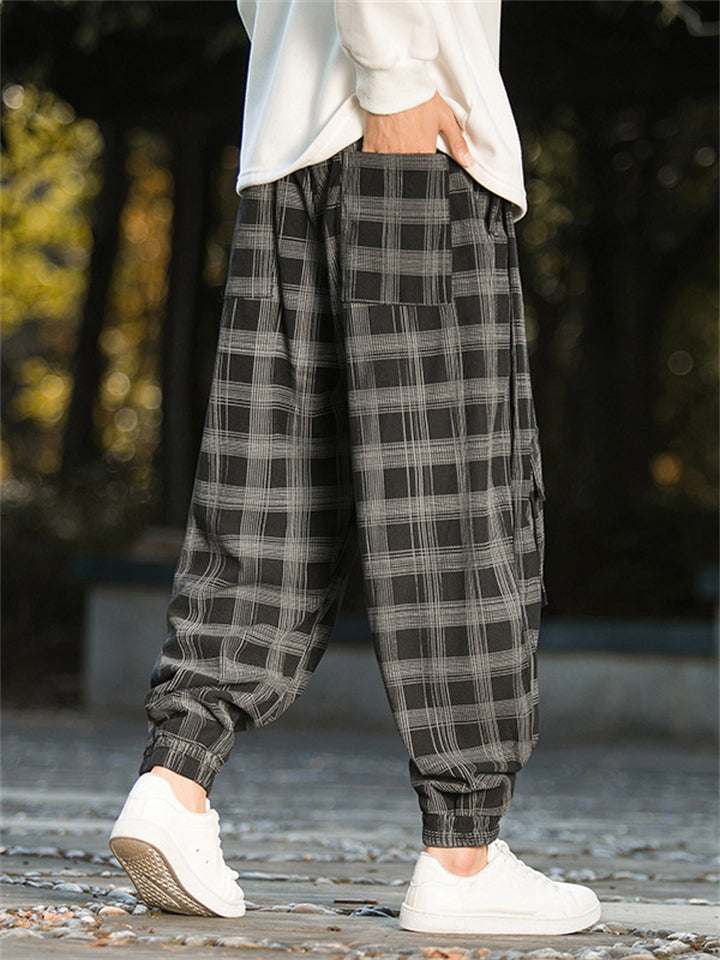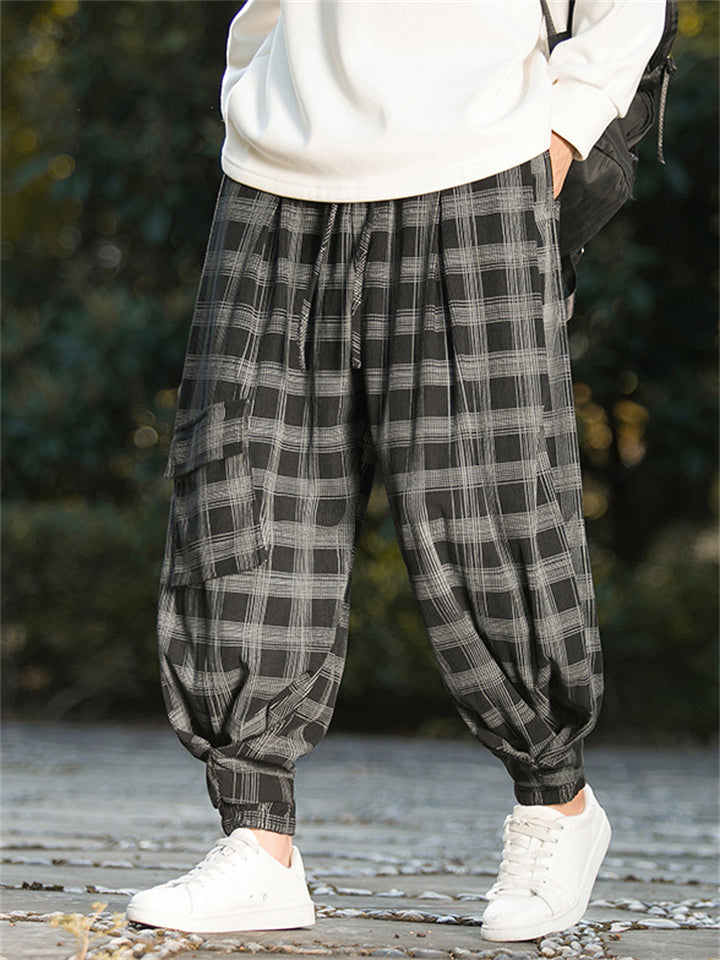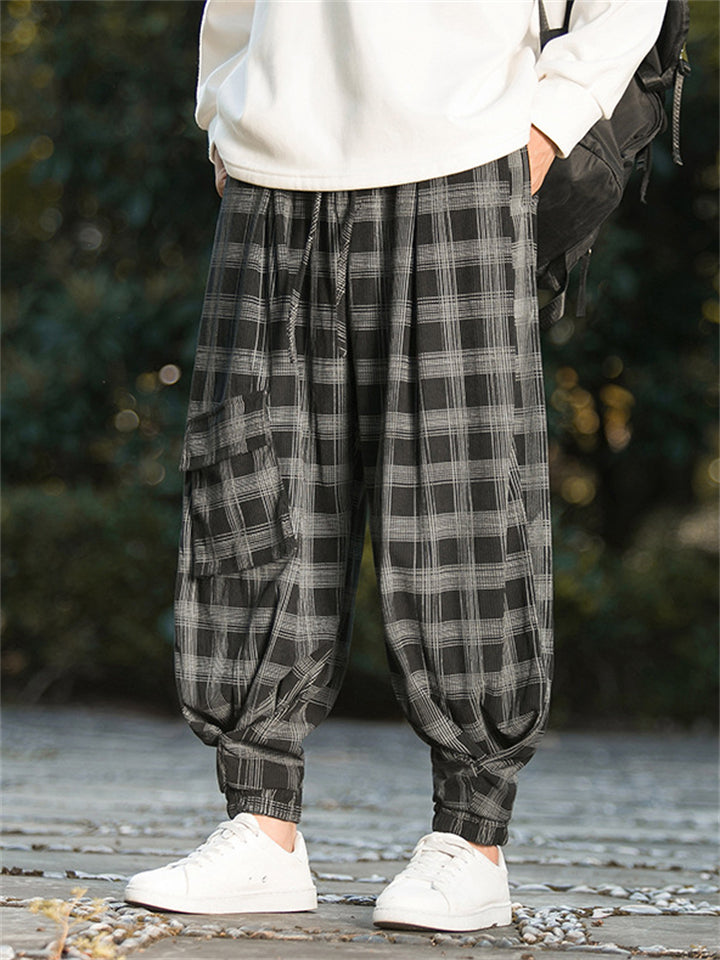 Men's Plaid Corduroy Patch Pockets Drawstring Casual Pants