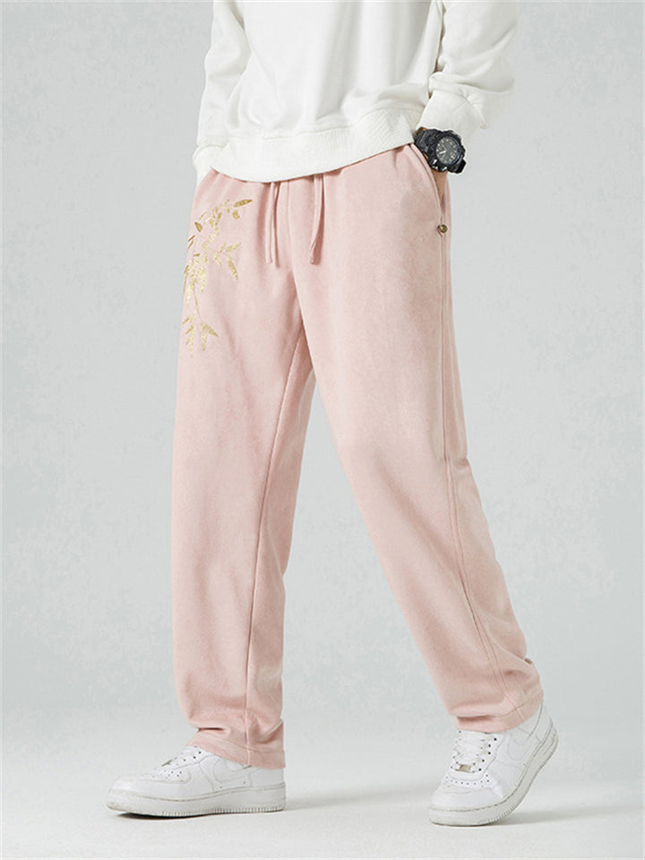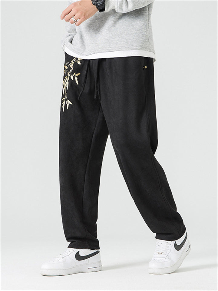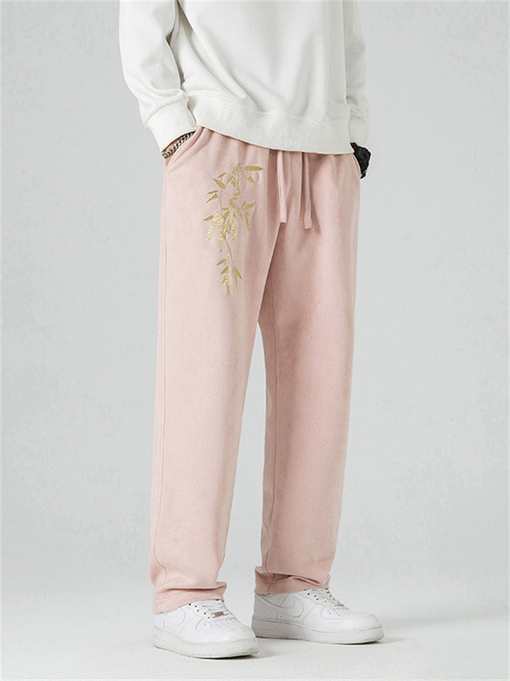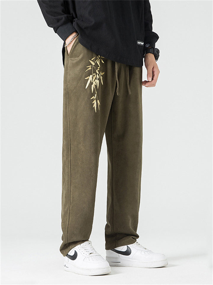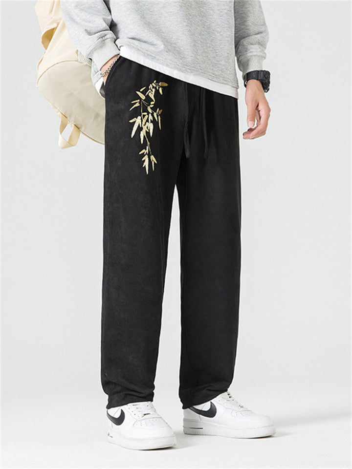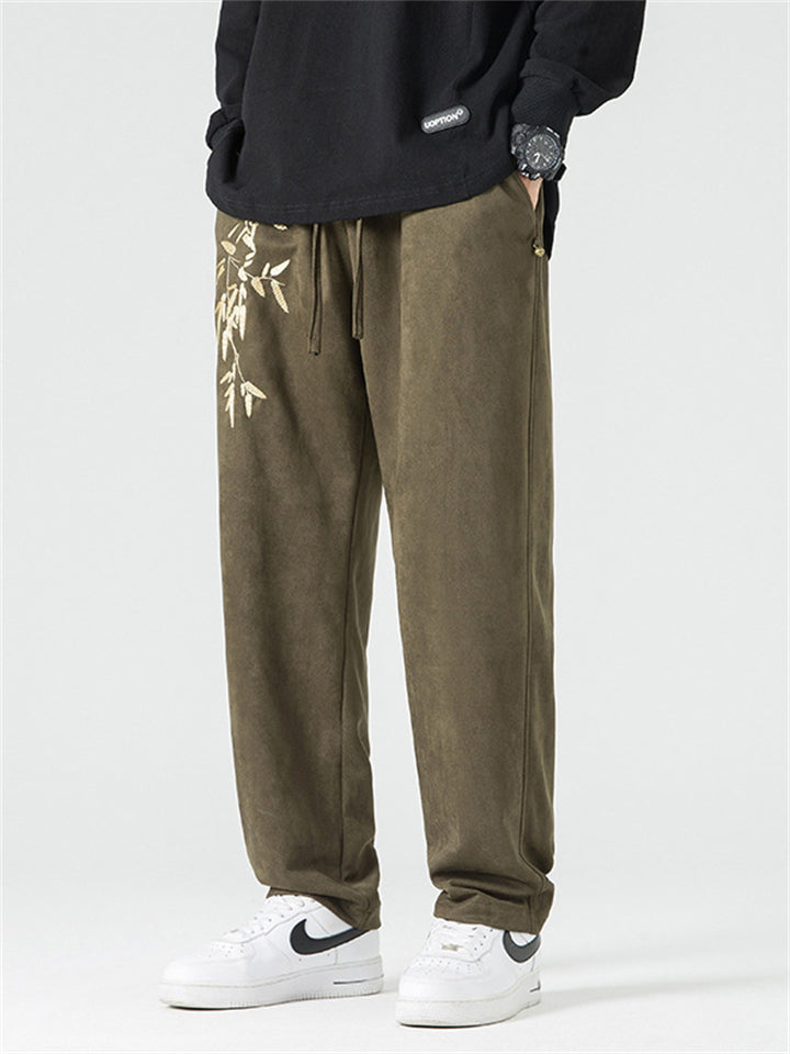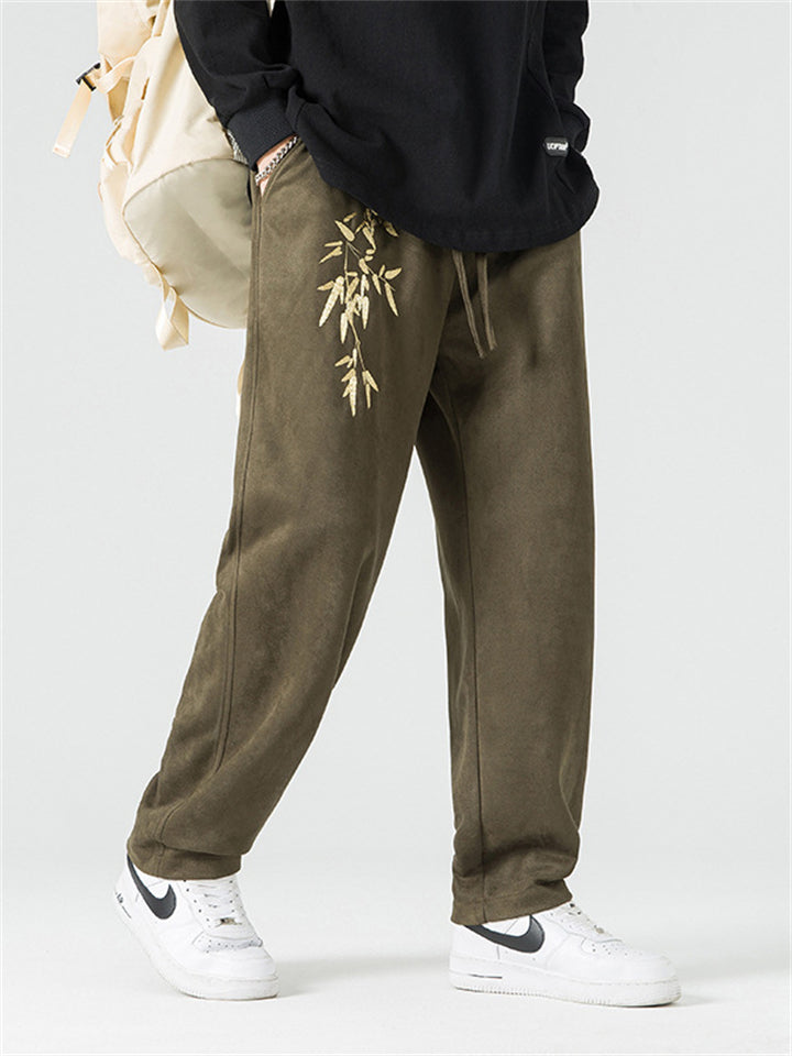 Men's Retro Gold Bamboo Leaf Embroidery Faux Suede Trousers