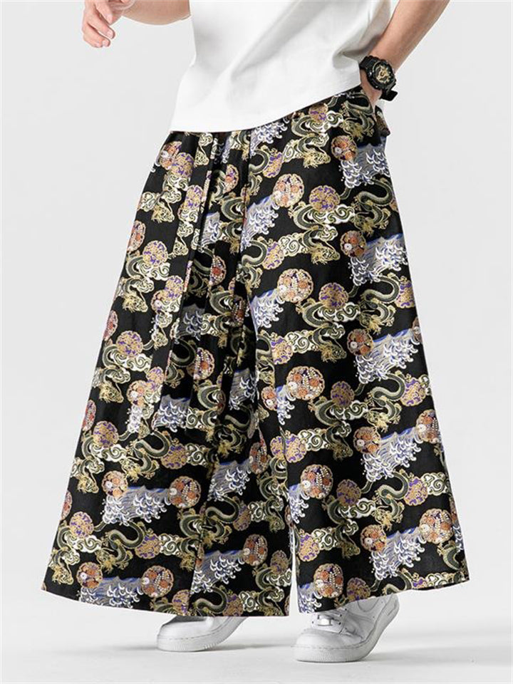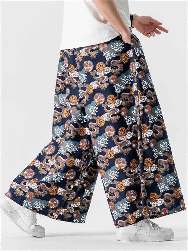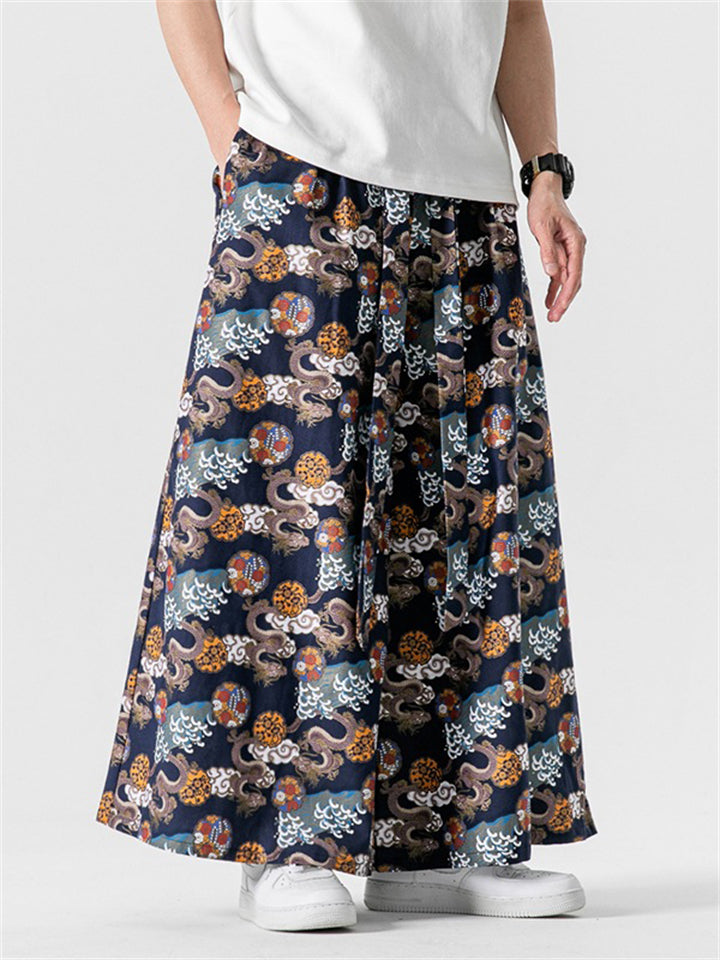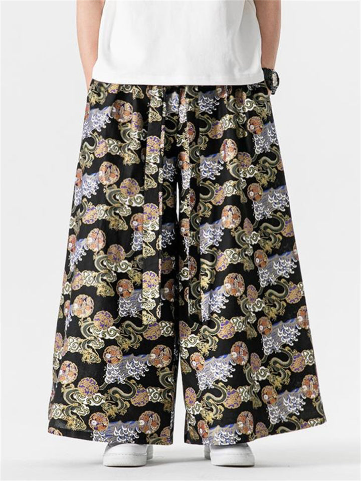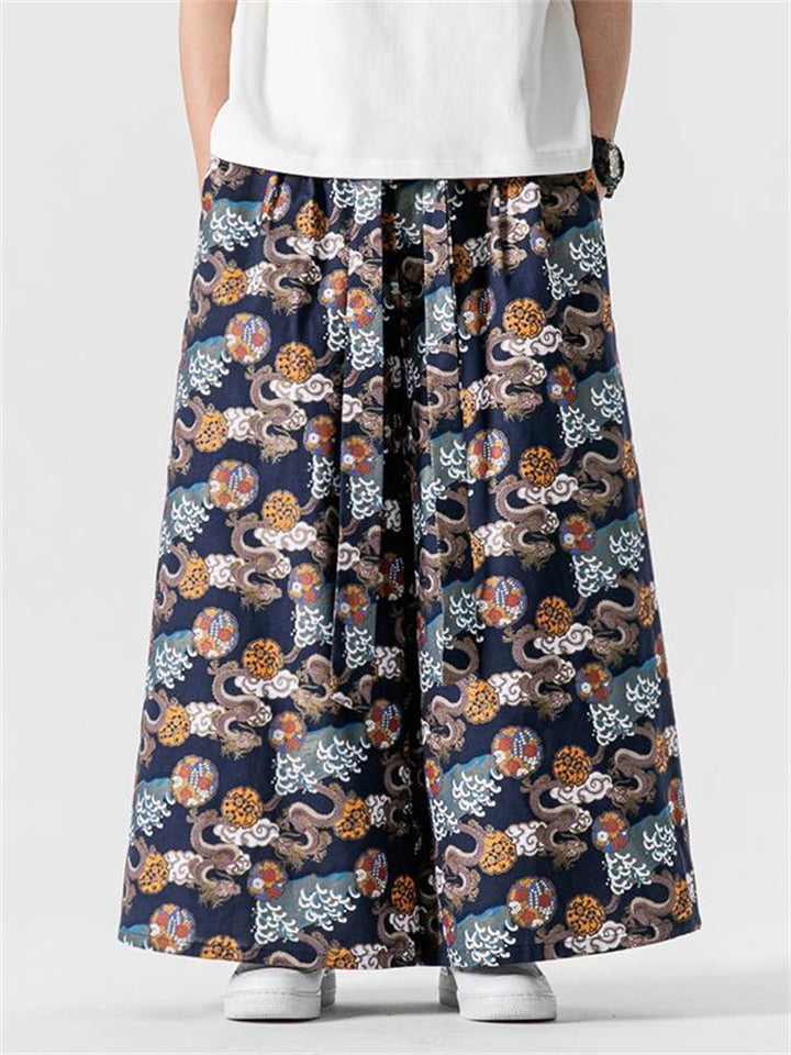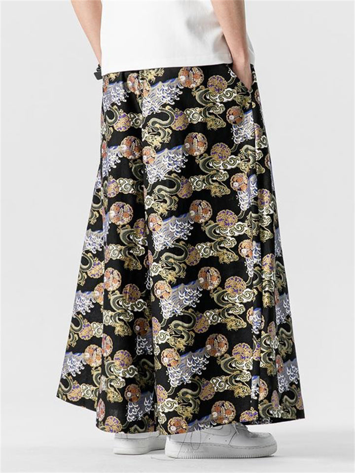 Men's Retro Loong Print Lace Up Loose Straight-Leg Hakama Pants