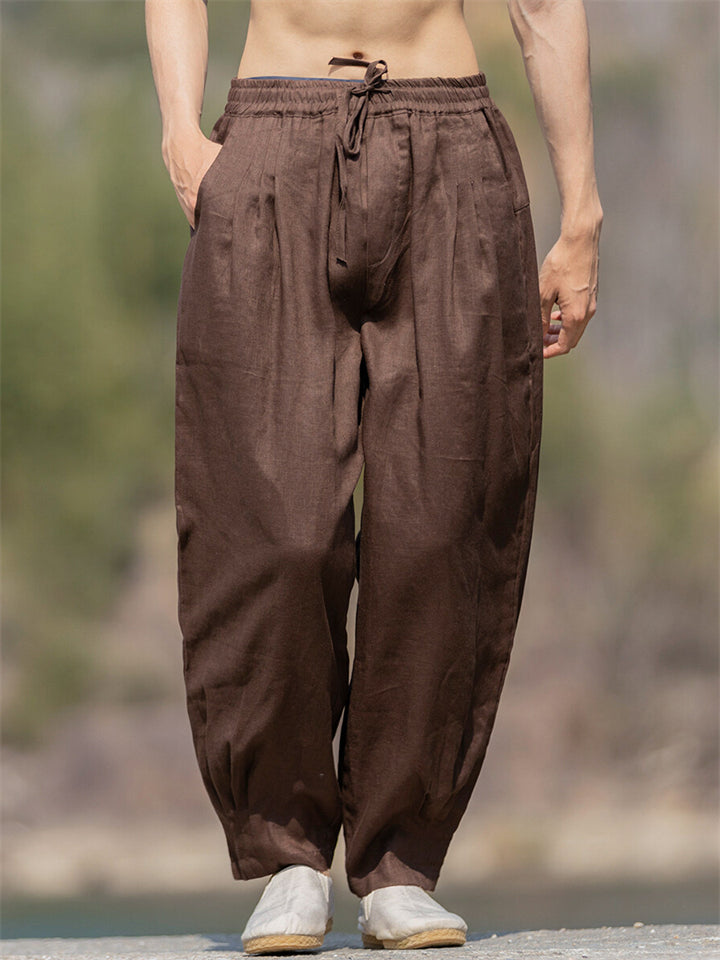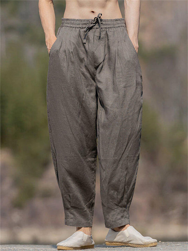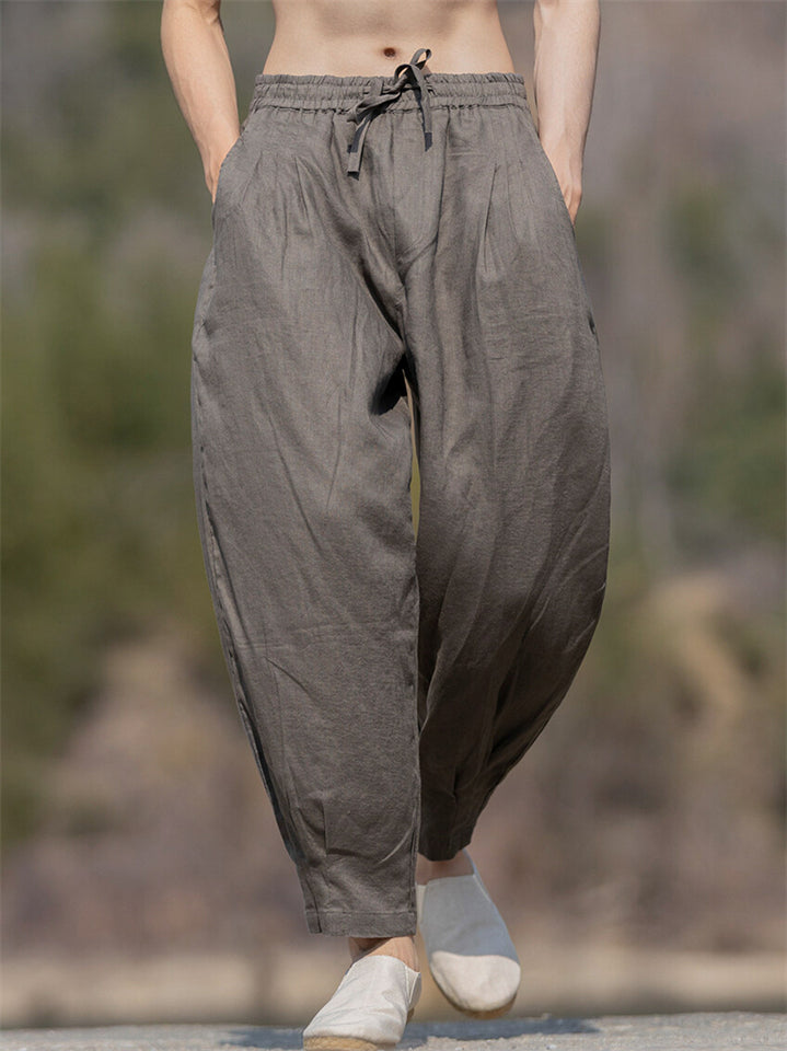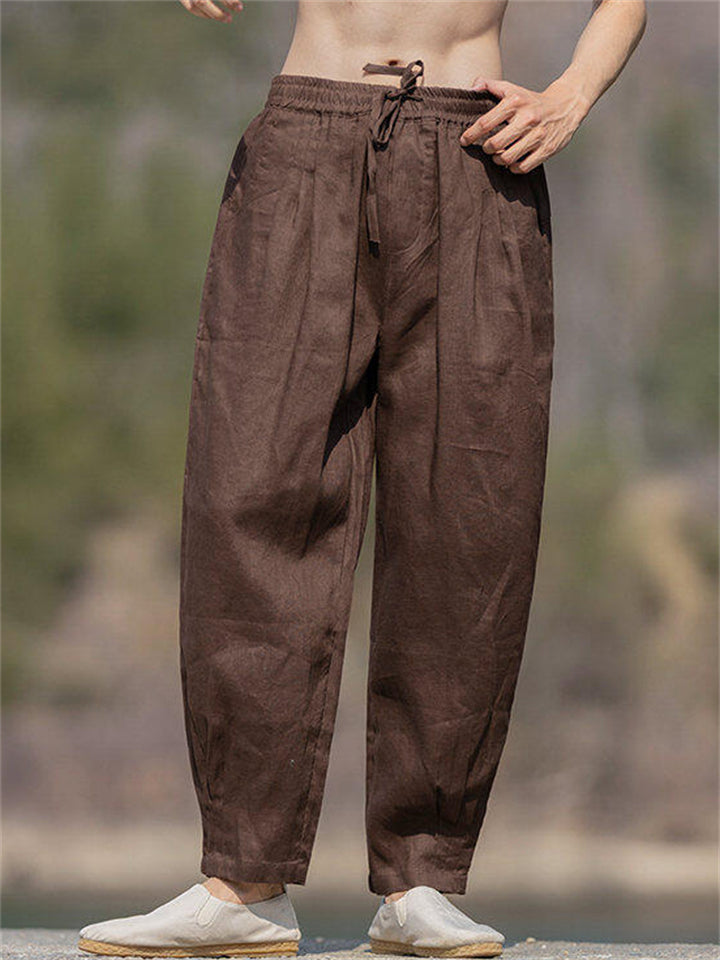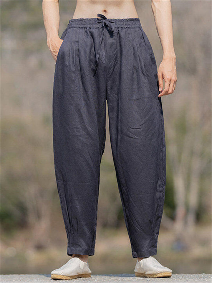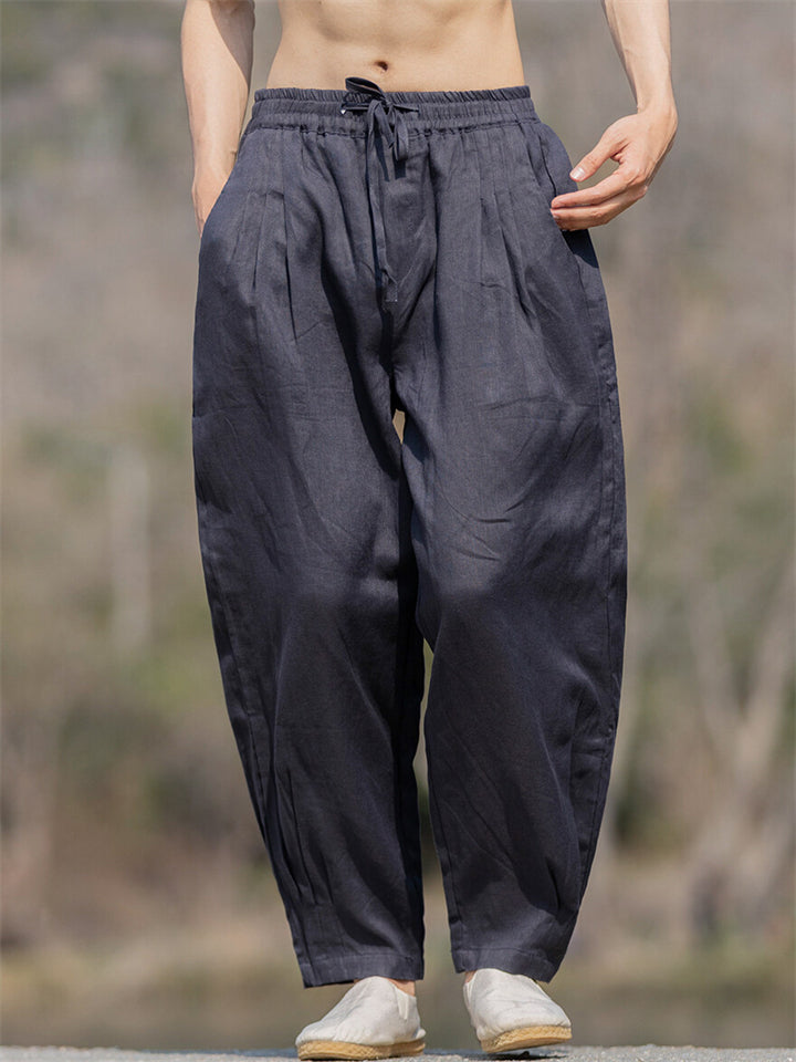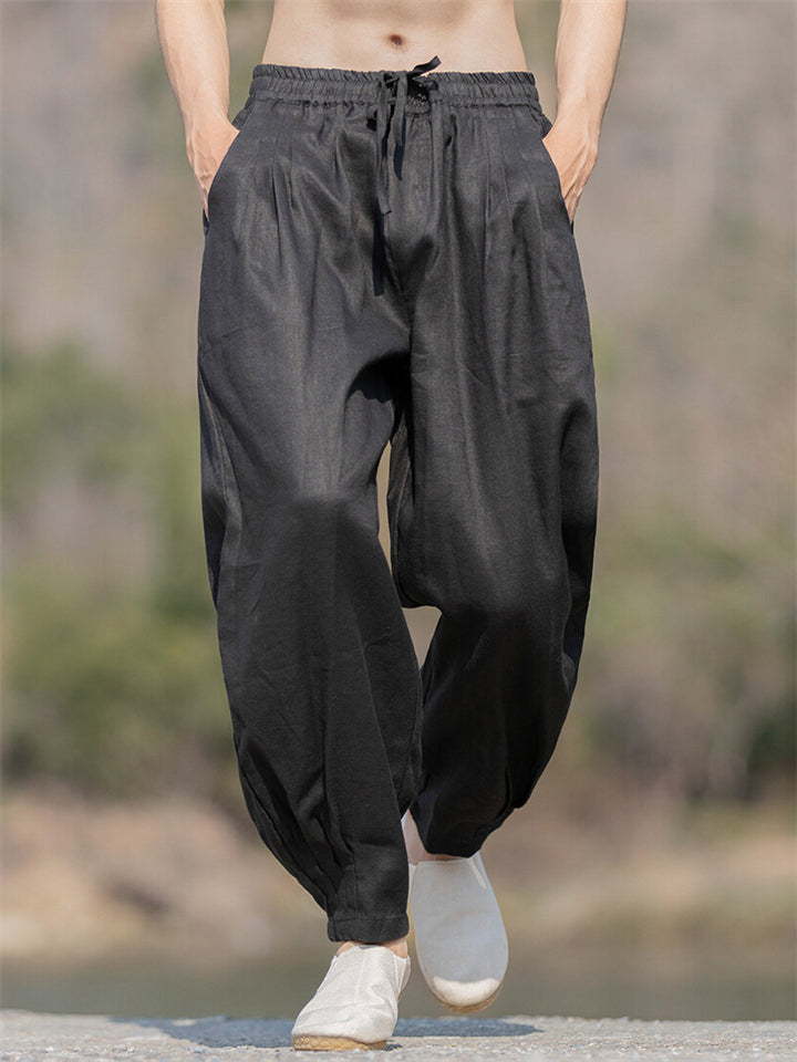 Vintage Japanese Street Style Drawstring Linen Pants for Men