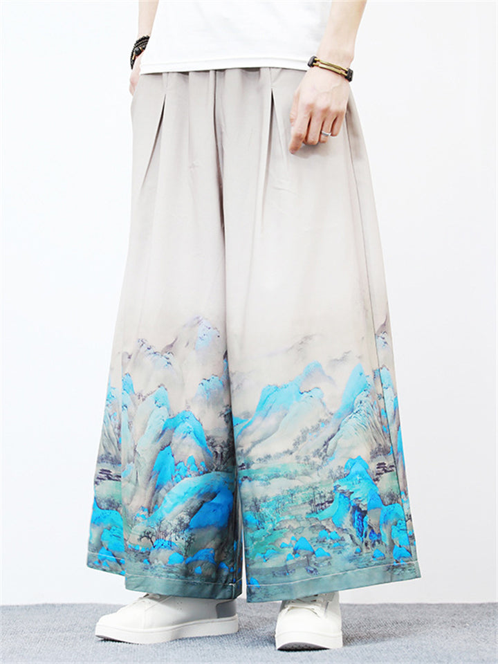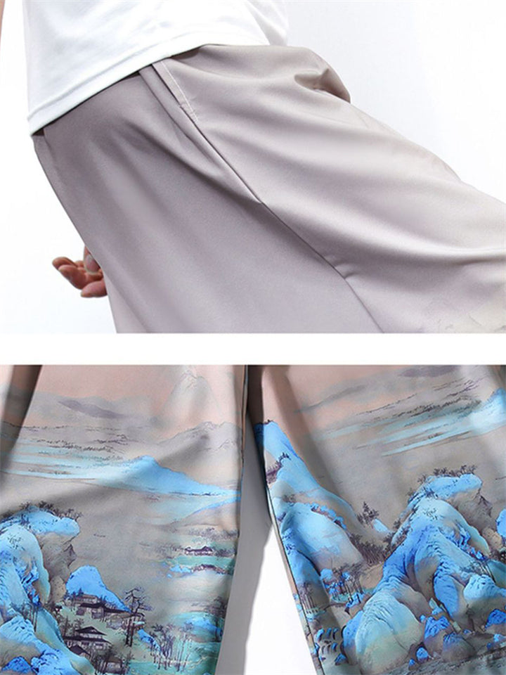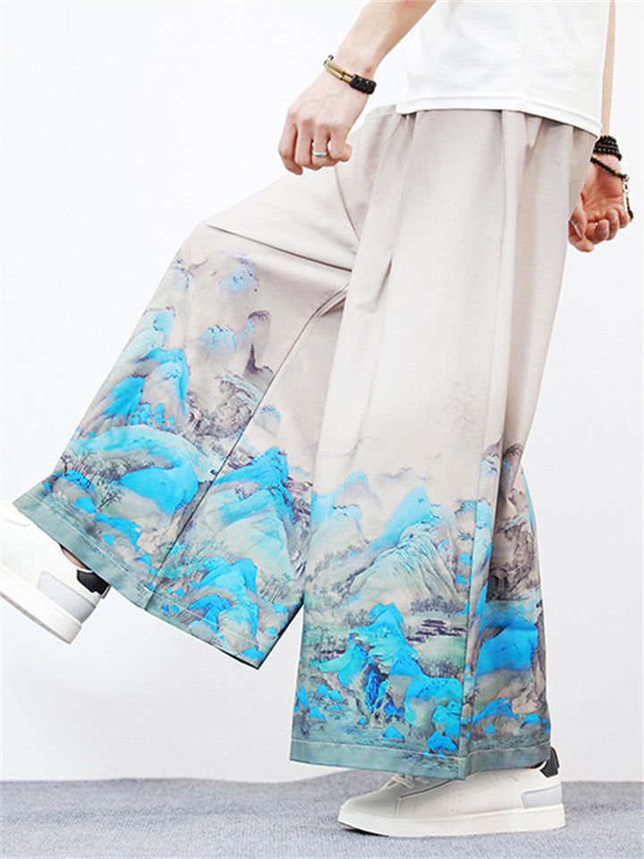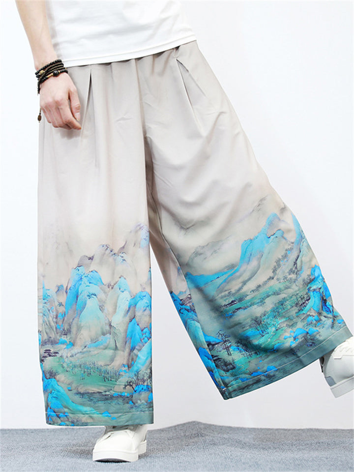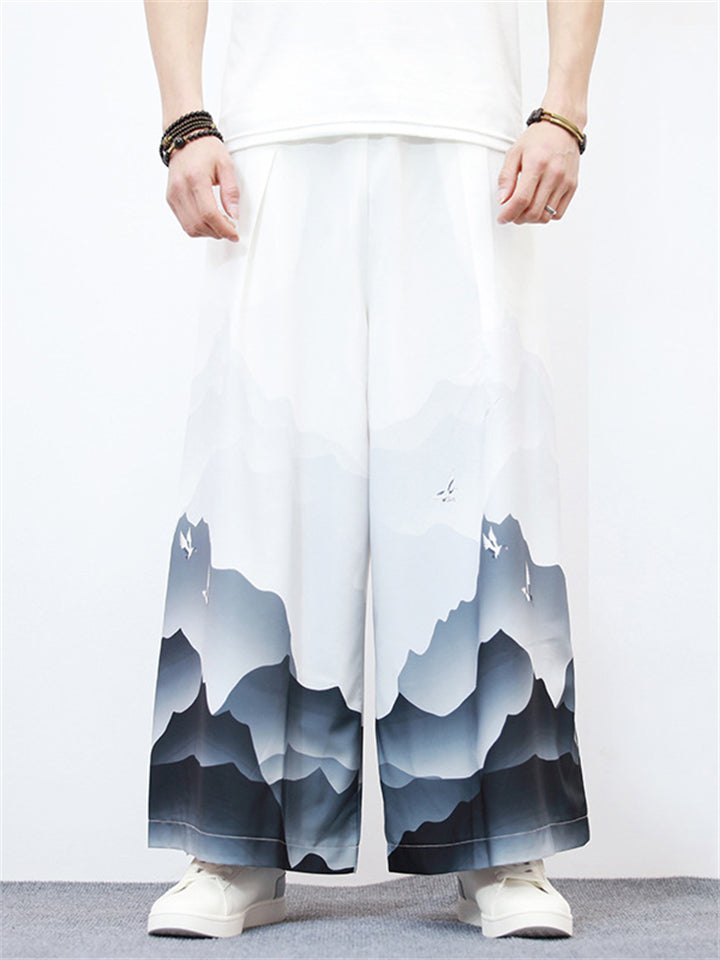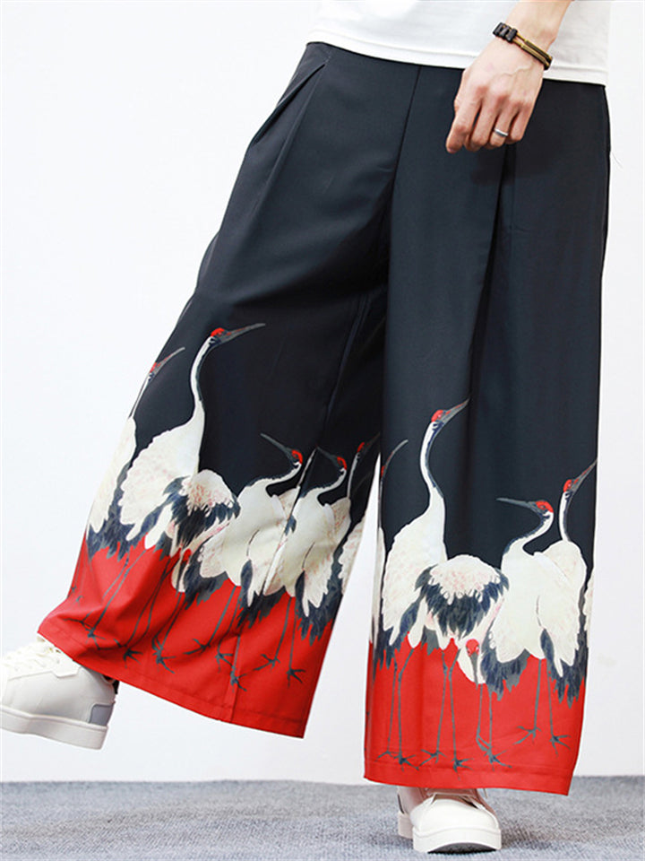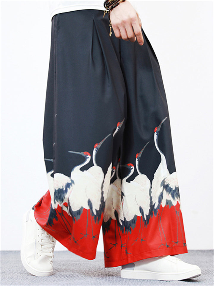 Men's Unique White Crane Landscape Print Wide-Leg Pants