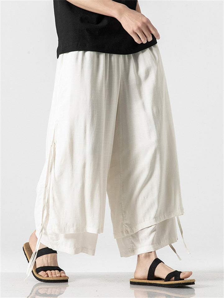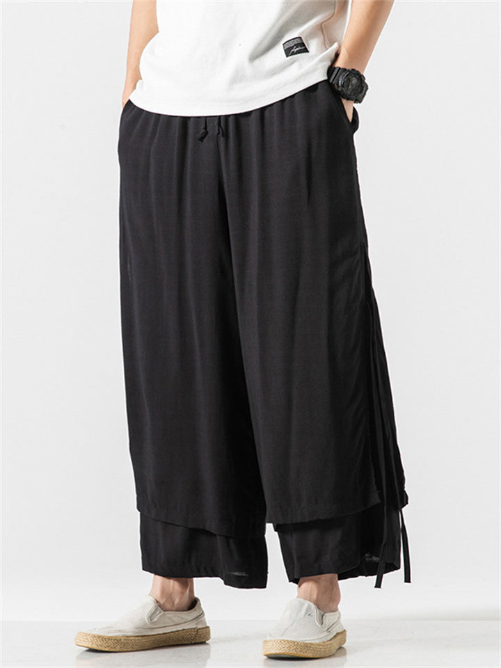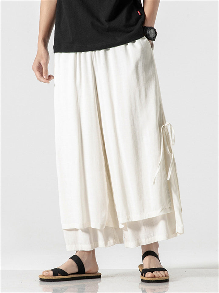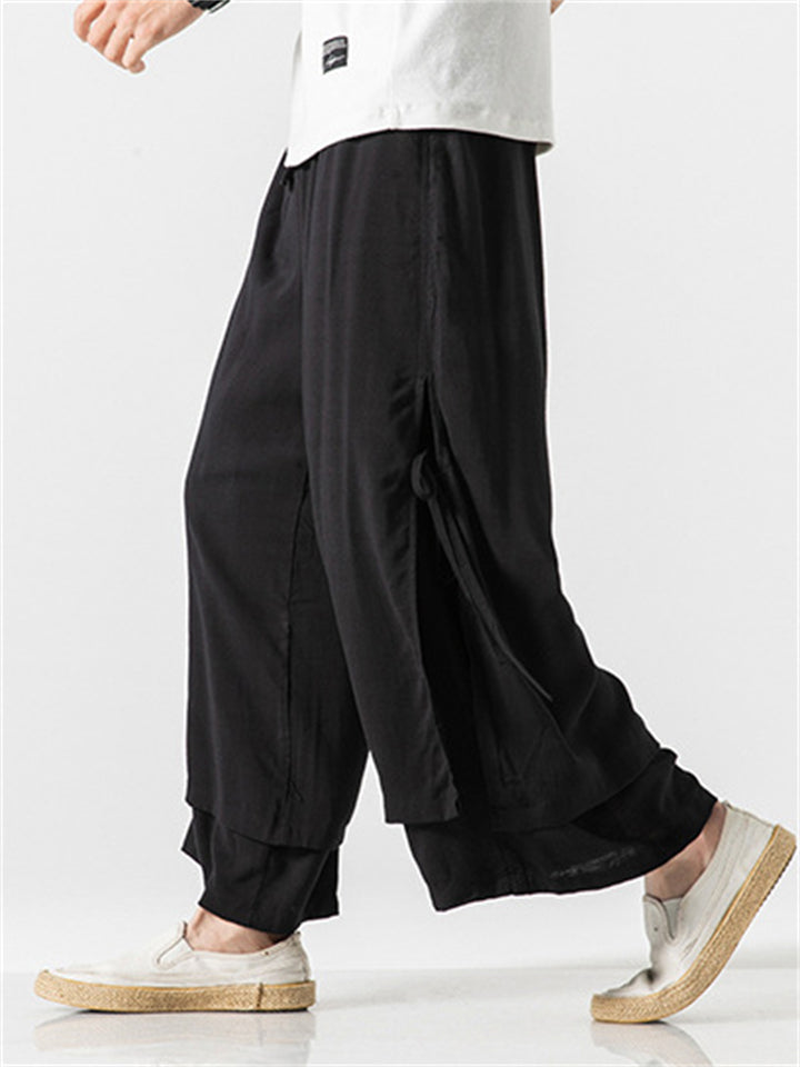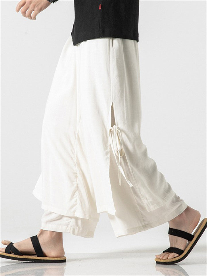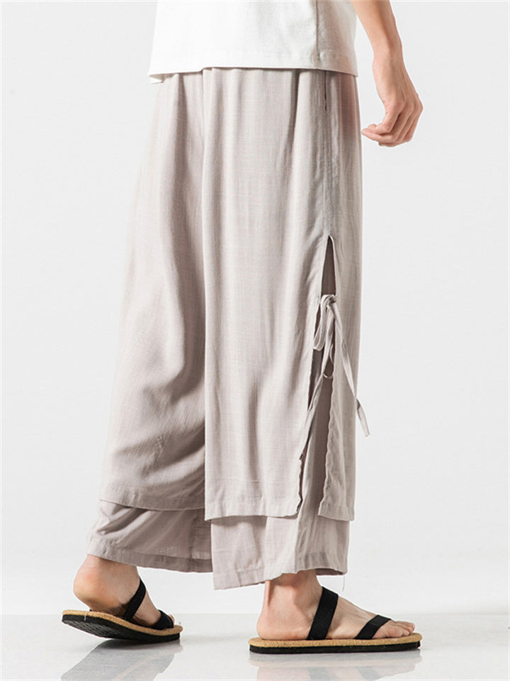 Men's Zen Buddhism Layered Side Slit Lace Up Linen Pants