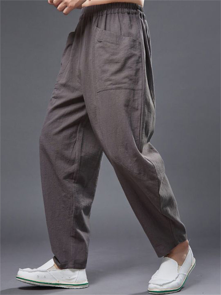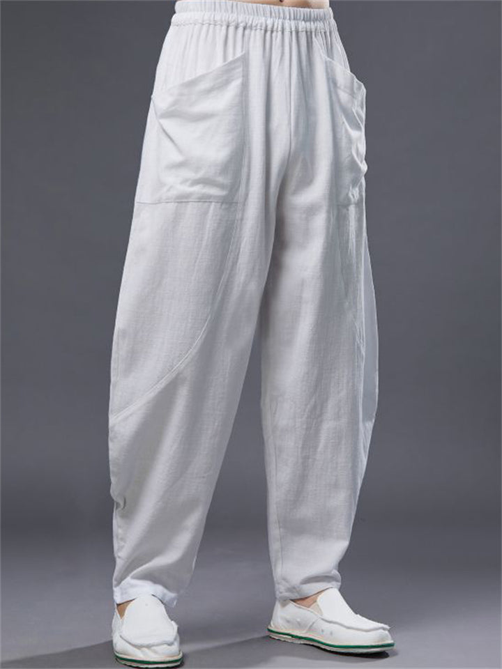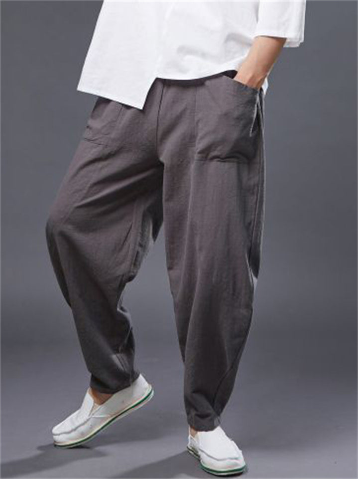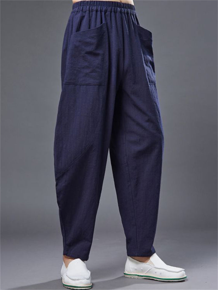 Ramie Loose Front Pockets Elastic Waist Harem Pant for Men