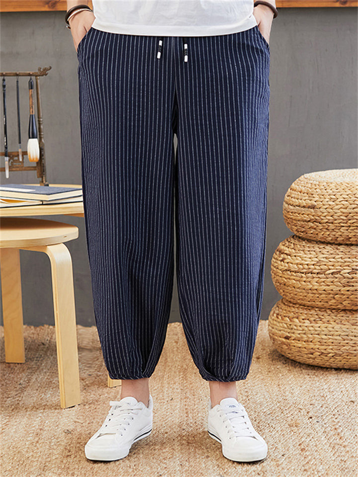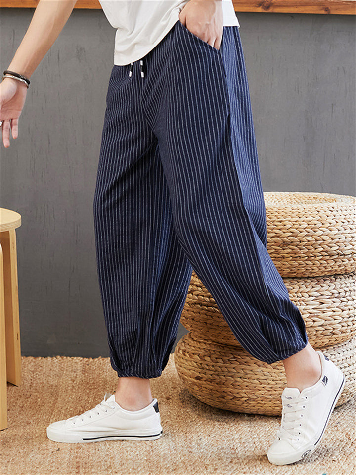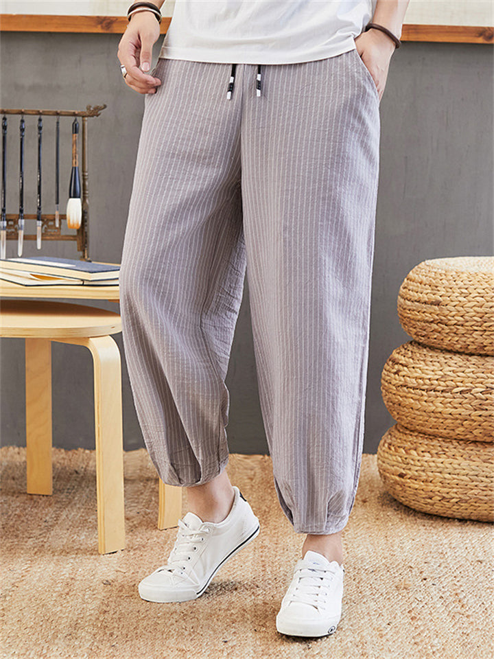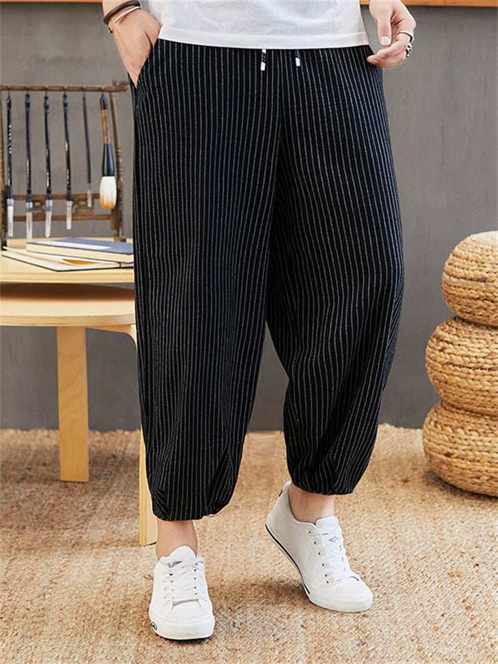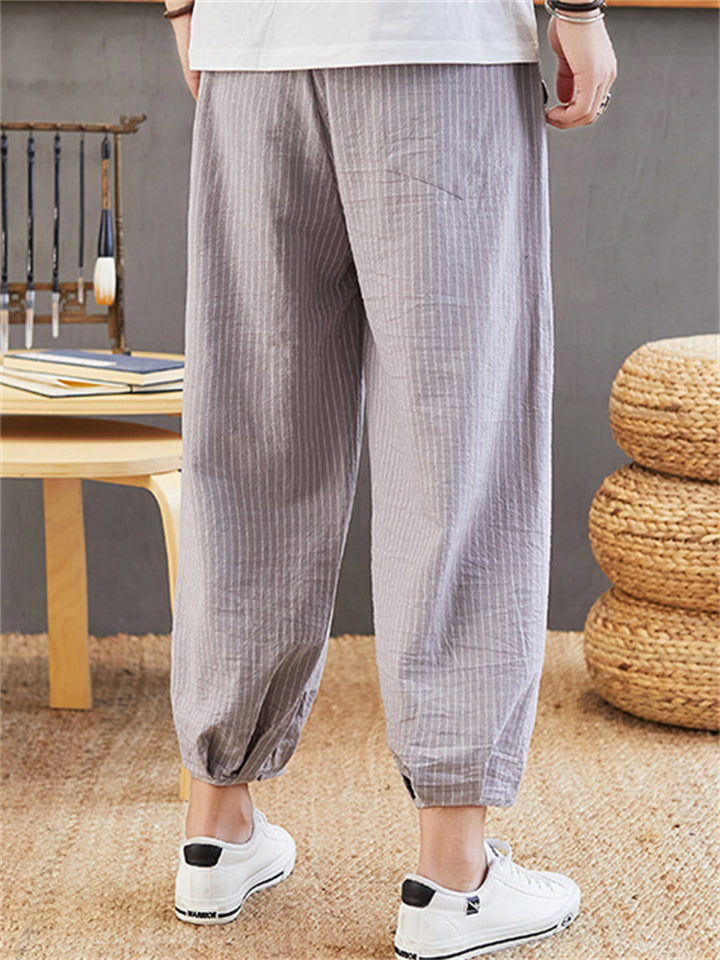 Soft Pure Cotton Ankle-Tied Stripe Lantern Pants for Men