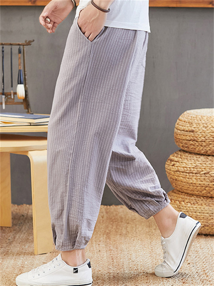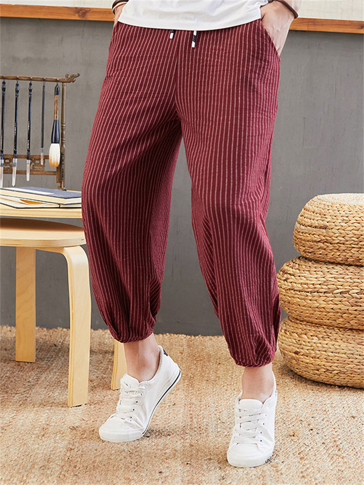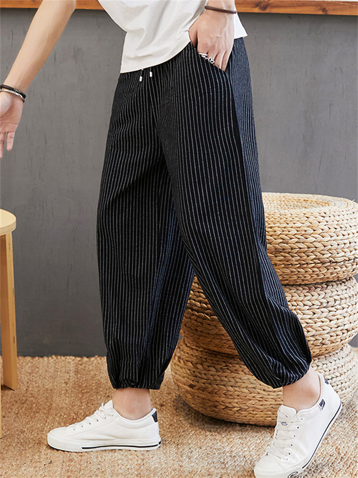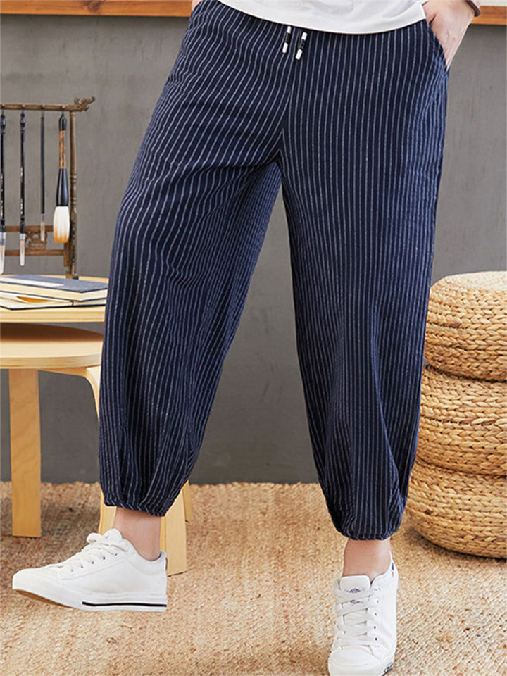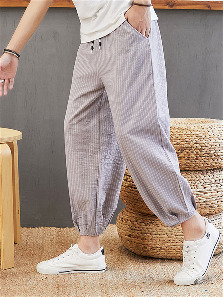 Soft Pure Cotton Ankle-Tied Stripe Lantern Pants for Men