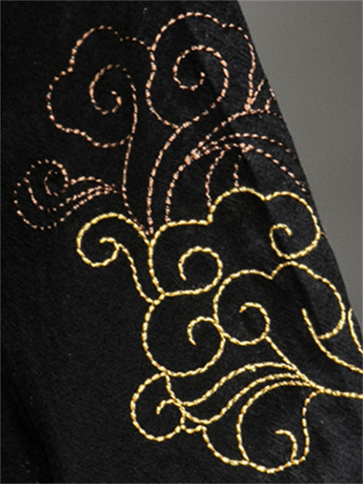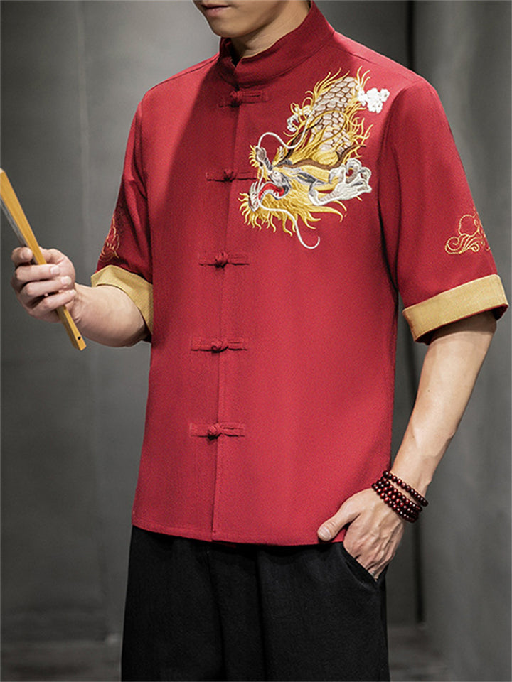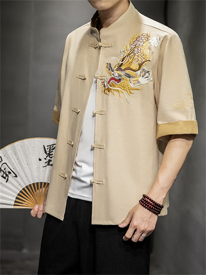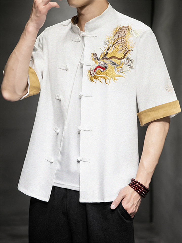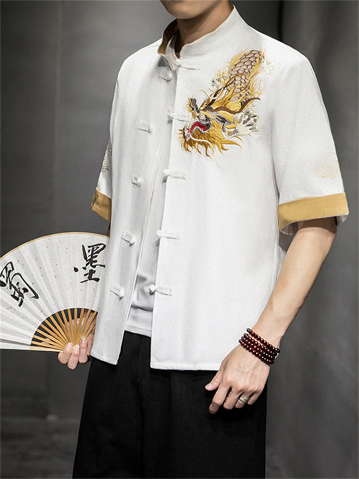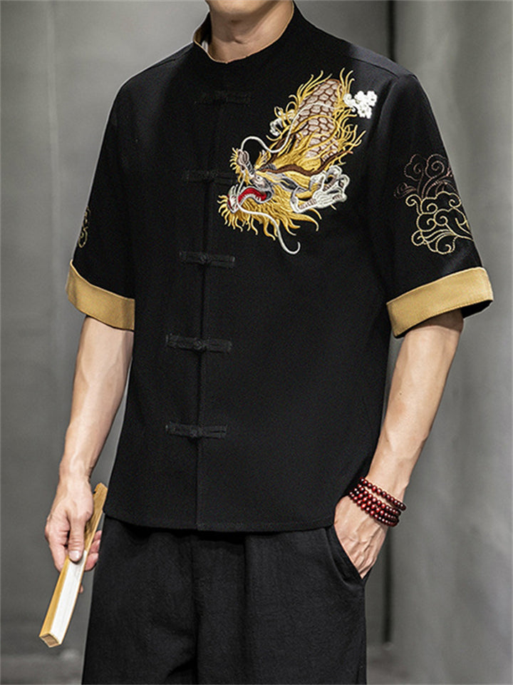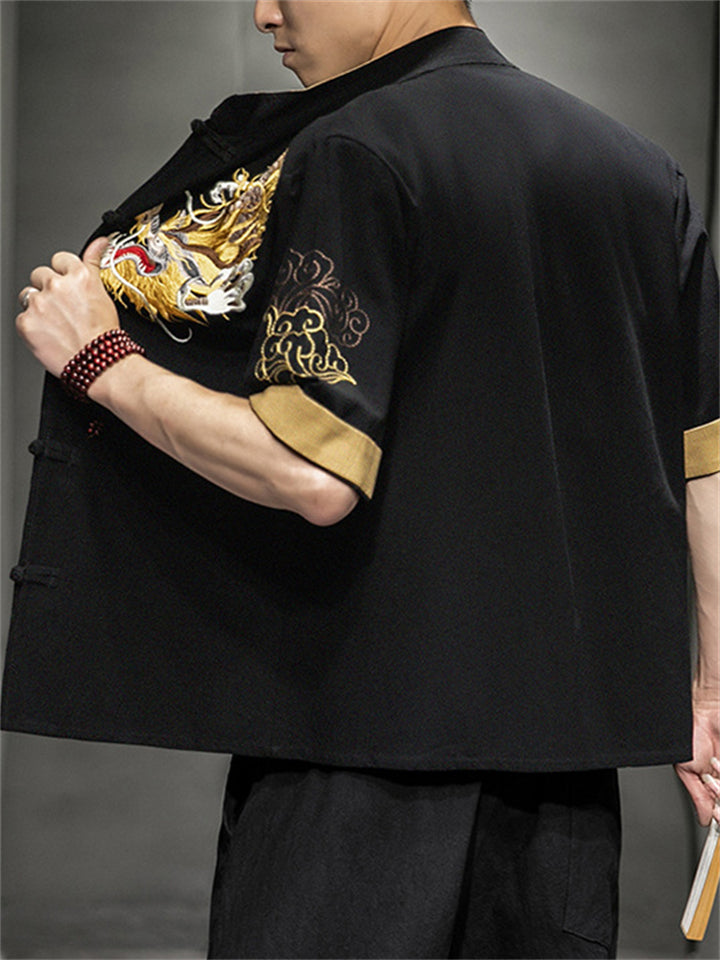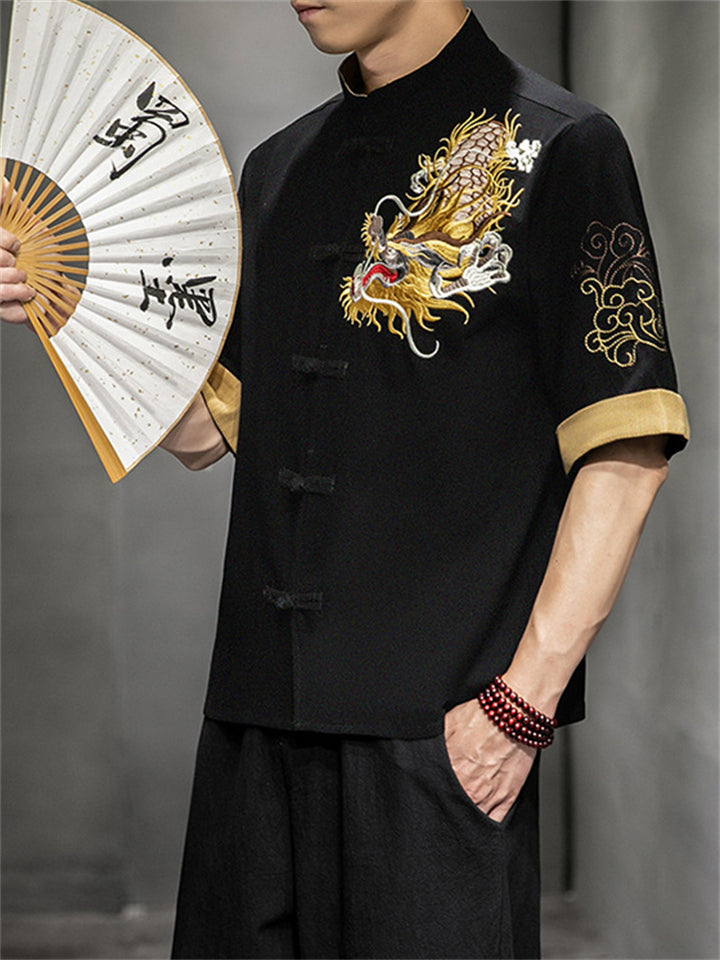 Chinese Style Hanfu Men's Golden Dragon Embroidery Knot Button Shirt