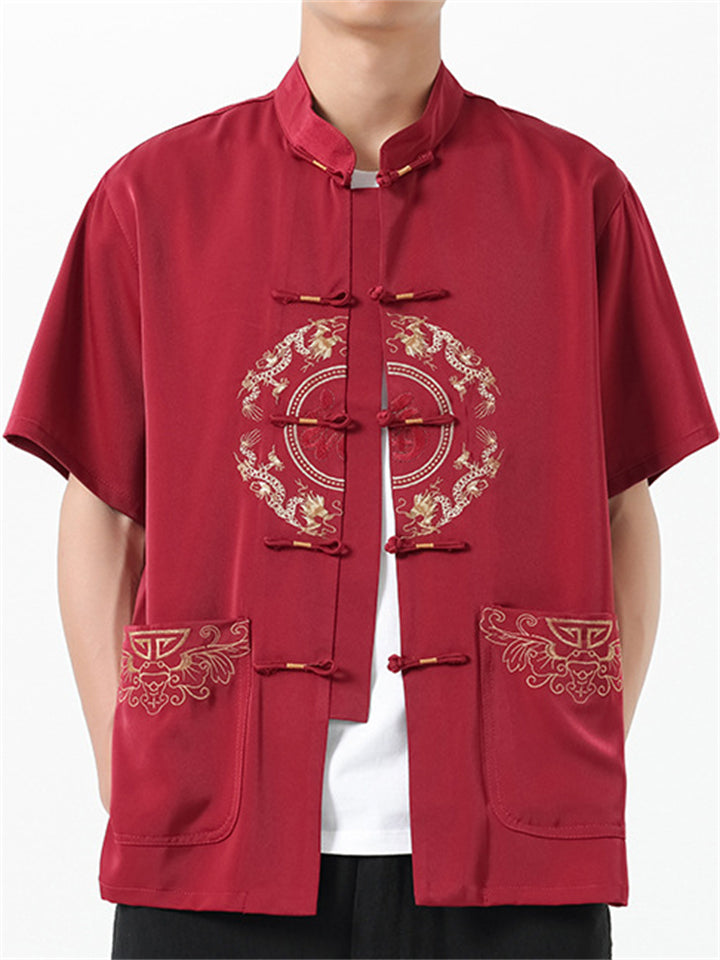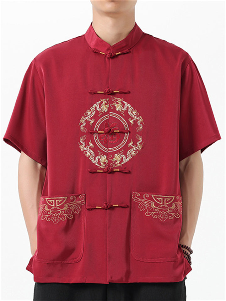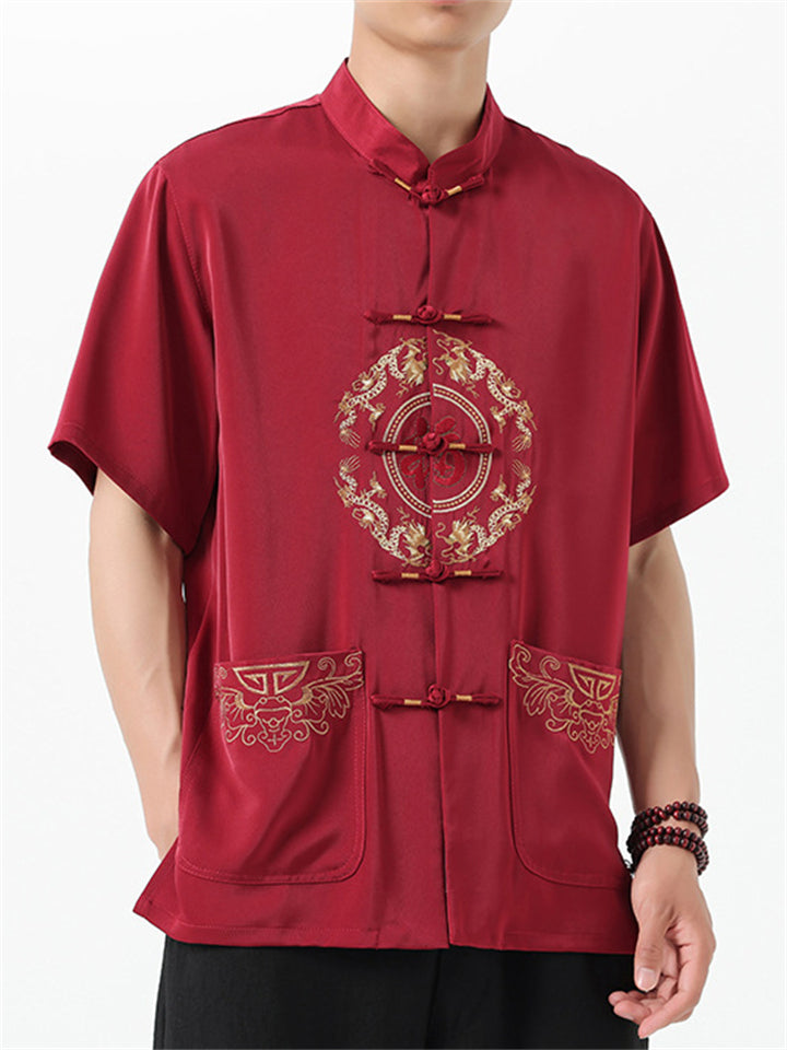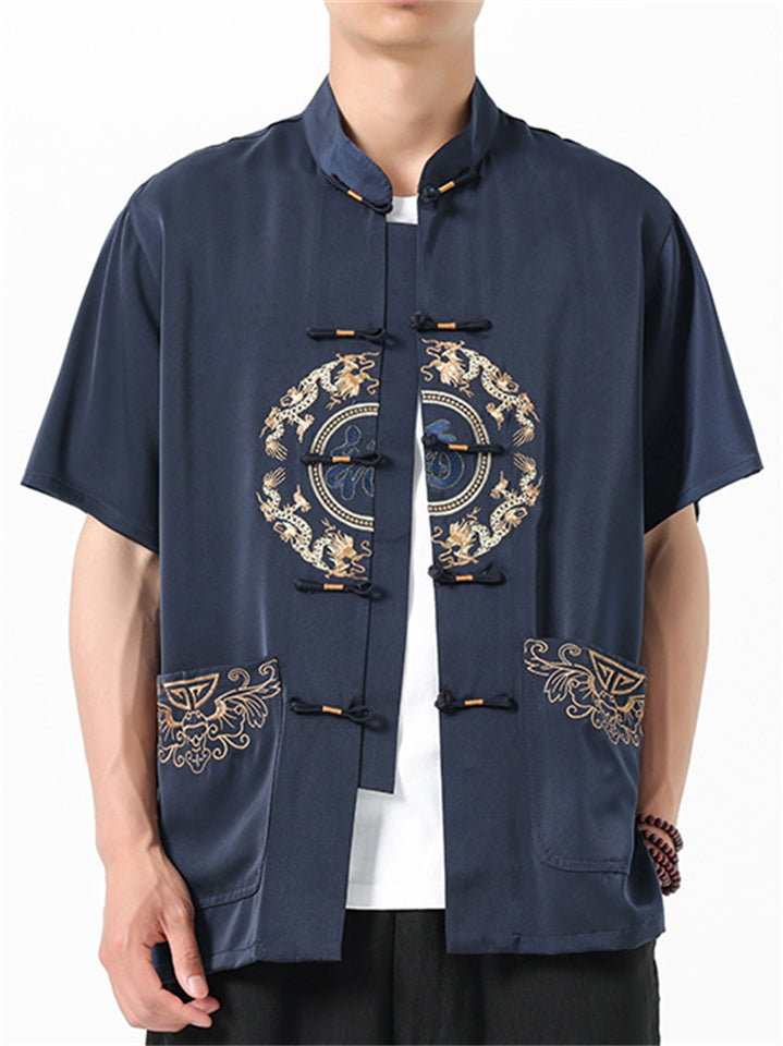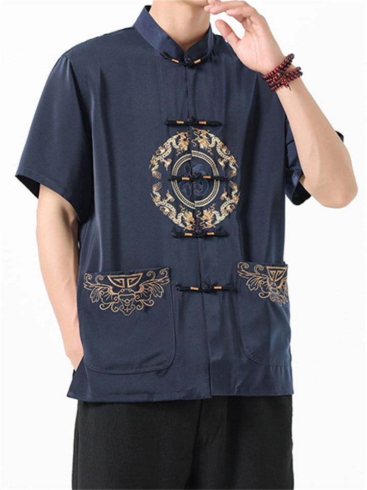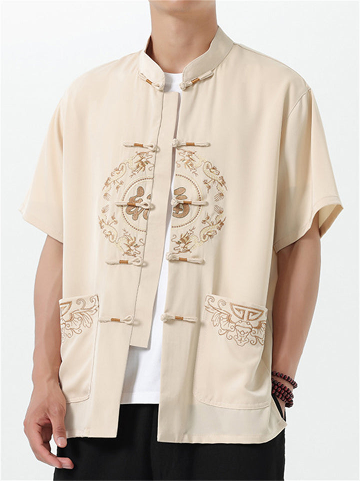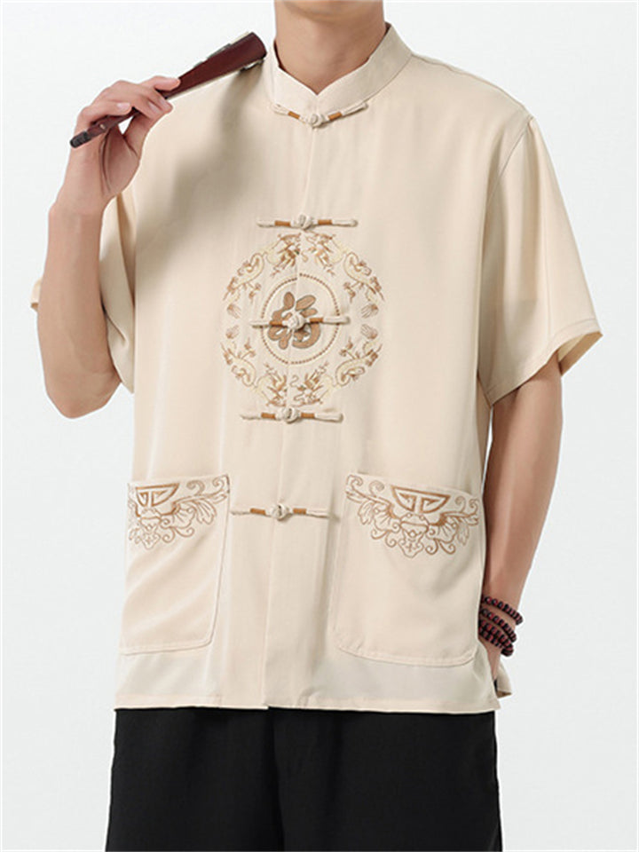 Chinese Style Men's Fuzi Embroidery Stand Collar Half Sleeve Shirts