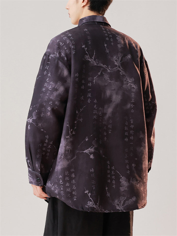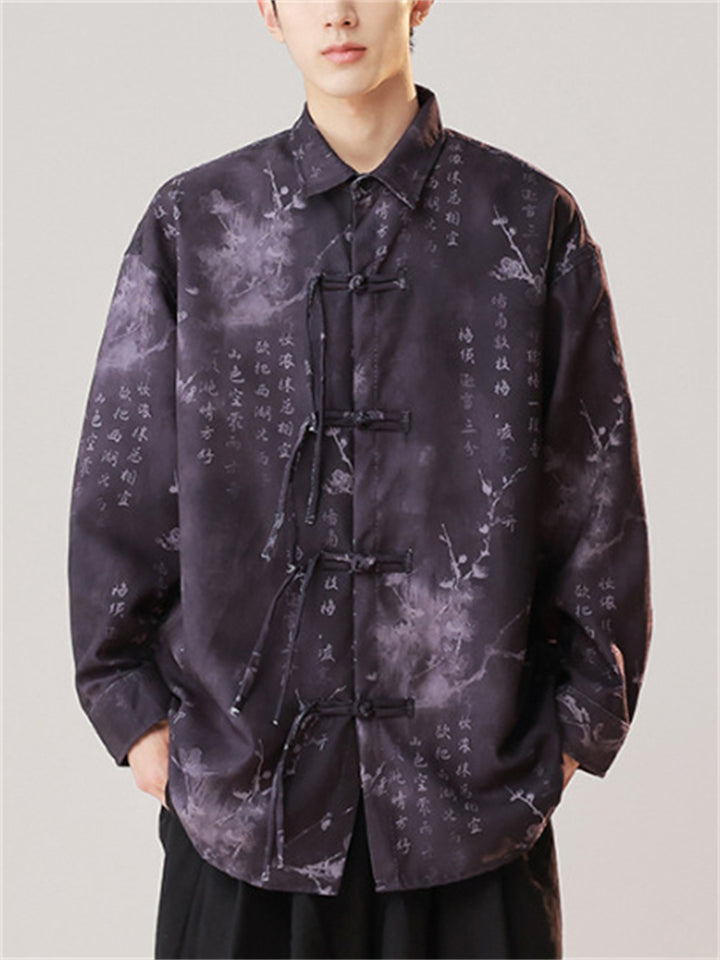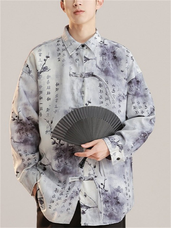 Chinese Style Men's Plum Blossom Hanzi Print Lapel Long Sleeve Shirts