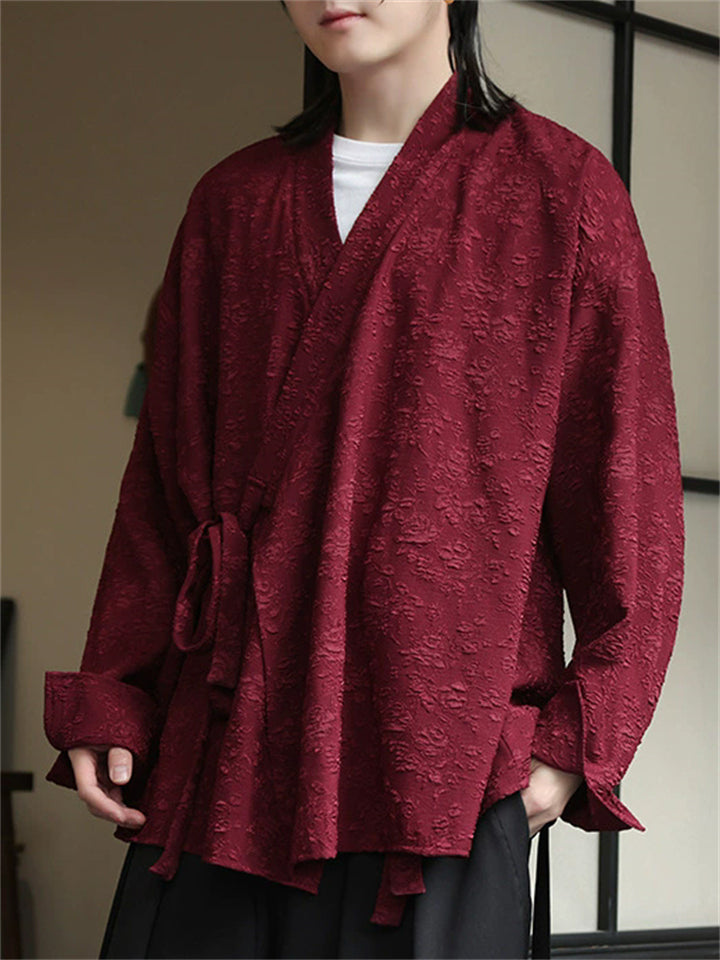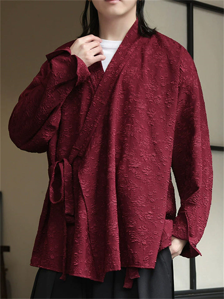 Chinese Zen Style Jacquard Slant Placket Tie Waist Hanfu Cardigan Shirts