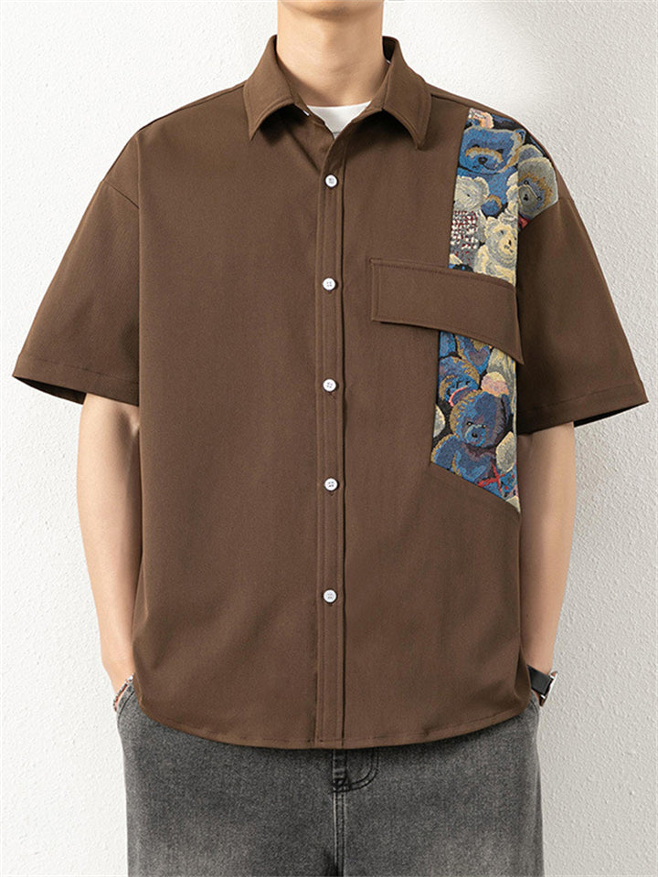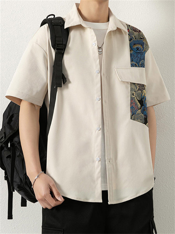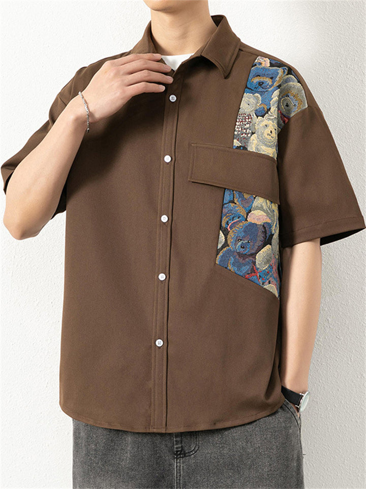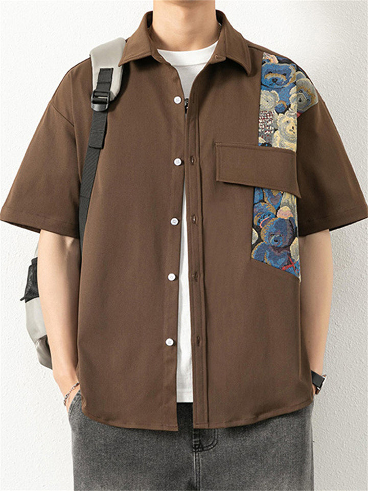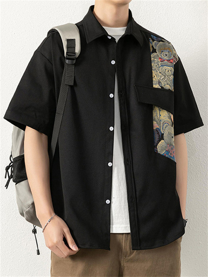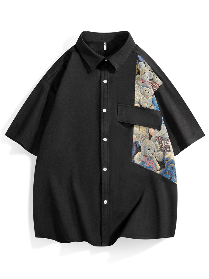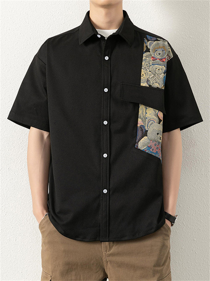 Cute Bear Print Half-Sleeve Lapel Shirt for Male